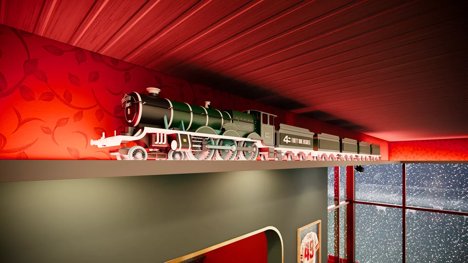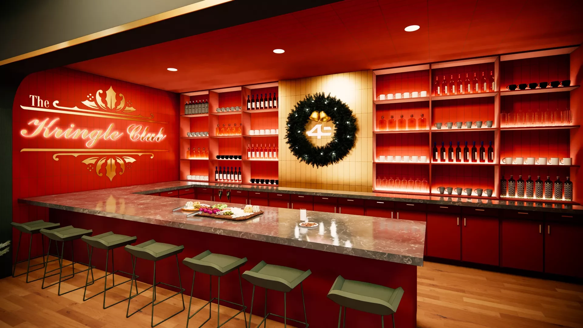 Just steps away, guests can gather at The Kringle Club, where endless hot chocolate, fresh cookies, and inviting bar stools create the perfect spot to post up between sleigh sprints. Overhead, the ceiling features a dimensional Forty Nine Degrees “49” logo — a subtle but striking nod to the partnership that brought the suite to life. Encircling the logo is Santa’s miniature Christmas train, weaving its way through a framed inlay while the surrounding walls glow with tonal holly-red wallpaper.