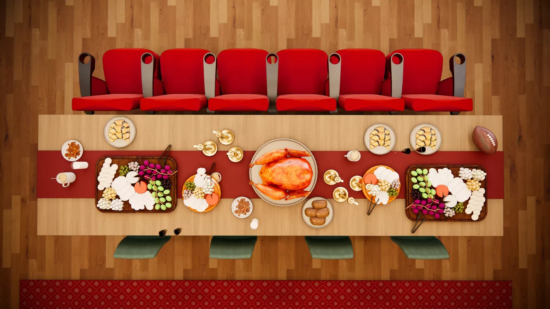 Throughout the suite, framed #49 jerseys pay homage to the athletes who’ve worn the iconic number, further tying the space to its spirited heritage. And along the field-facing side, a large family-style table sits before floor-to-ceiling windows, offering an immersive view of the action — from snowy touchdowns to high-speed sleigh routes.