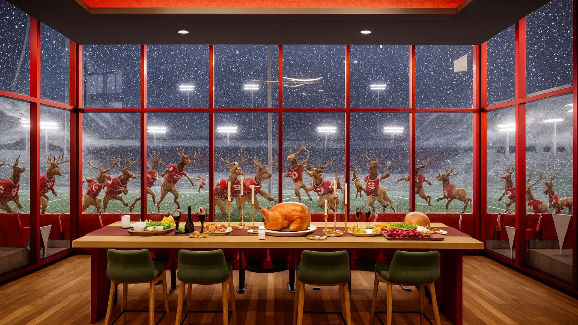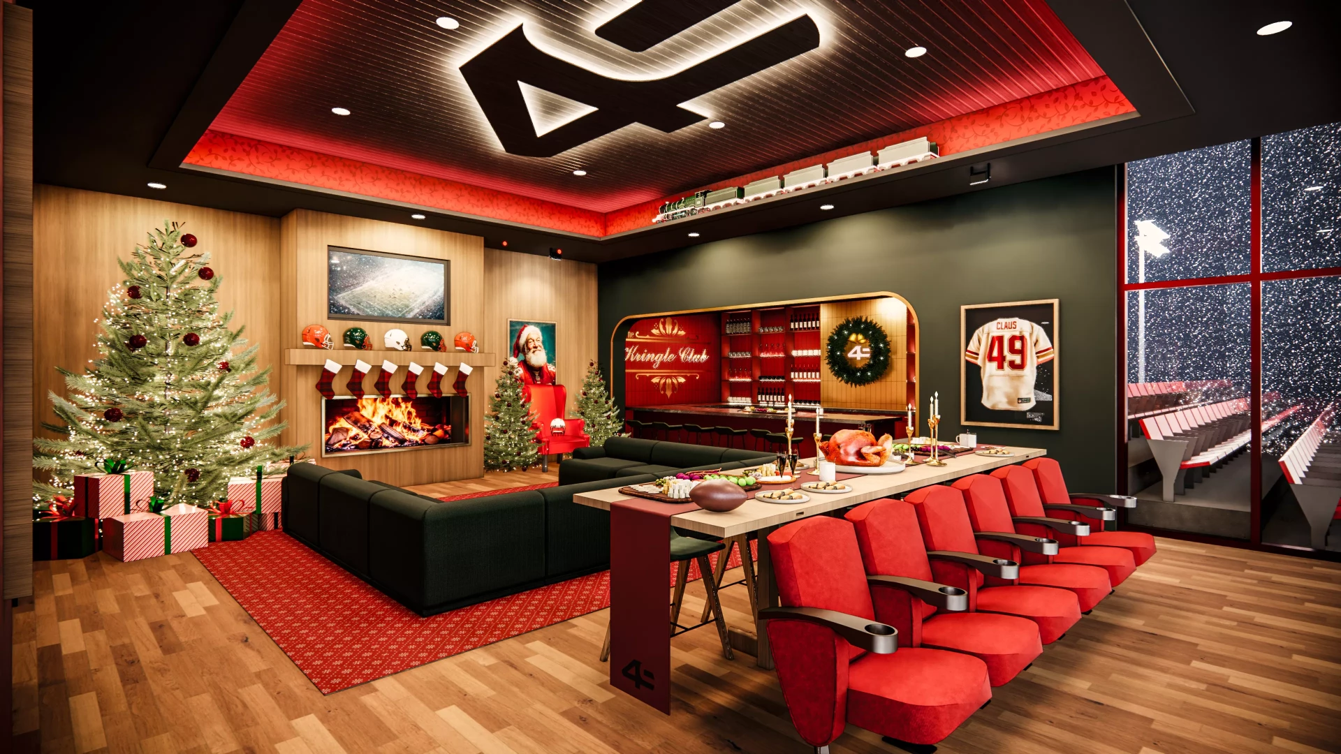 Santa’s Premium Suite at North Pole Stadium has been reimagined into the ultimate festive retreat — a warm, luxurious, and unmistakably Santa-approved destination for game day magic. Anchoring the space is a grand wooden fireplace, flanked on one side by Santa’s iconic red velvet chair (complete with a painted Santa headshot proudly hanging above it) and on the other by a towering Christmas tree trimmed in classic North Pole style. Centered above the mantle is an extraordinary photograph from the legendary 1982 Reindeer Games — the triple-overtime showdown remembered for Blitzen’s miraculous mid-air catch that sealed the win and became an instant holiday sports classic.