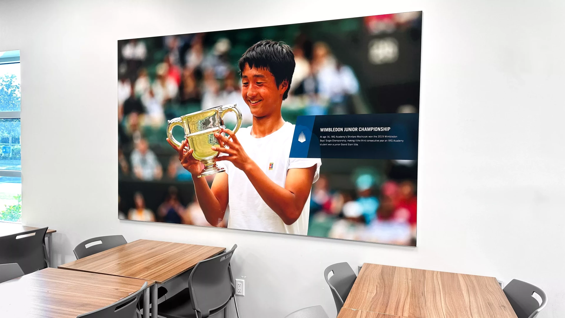 Highlights include a striking slat wall in the lobby, a custom gear display in the closing room, and inspiration imagery featured throughout the breakout rooms. The result is a cohesive, modern environment that reflects IMG’s elite standard and creates an impactful first impression for athletes, families, and recruits.