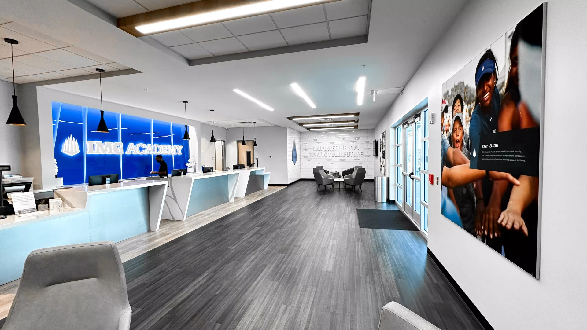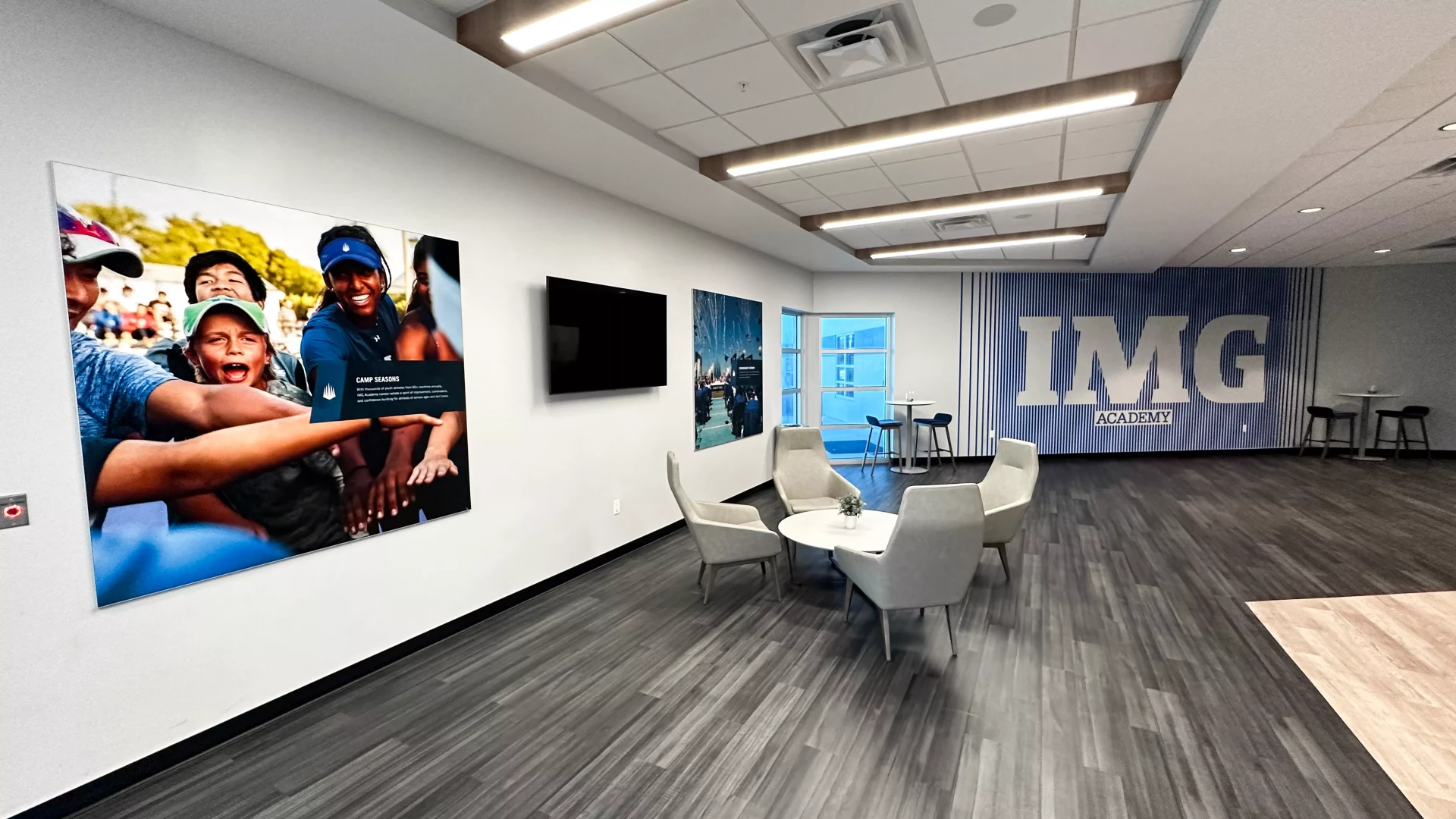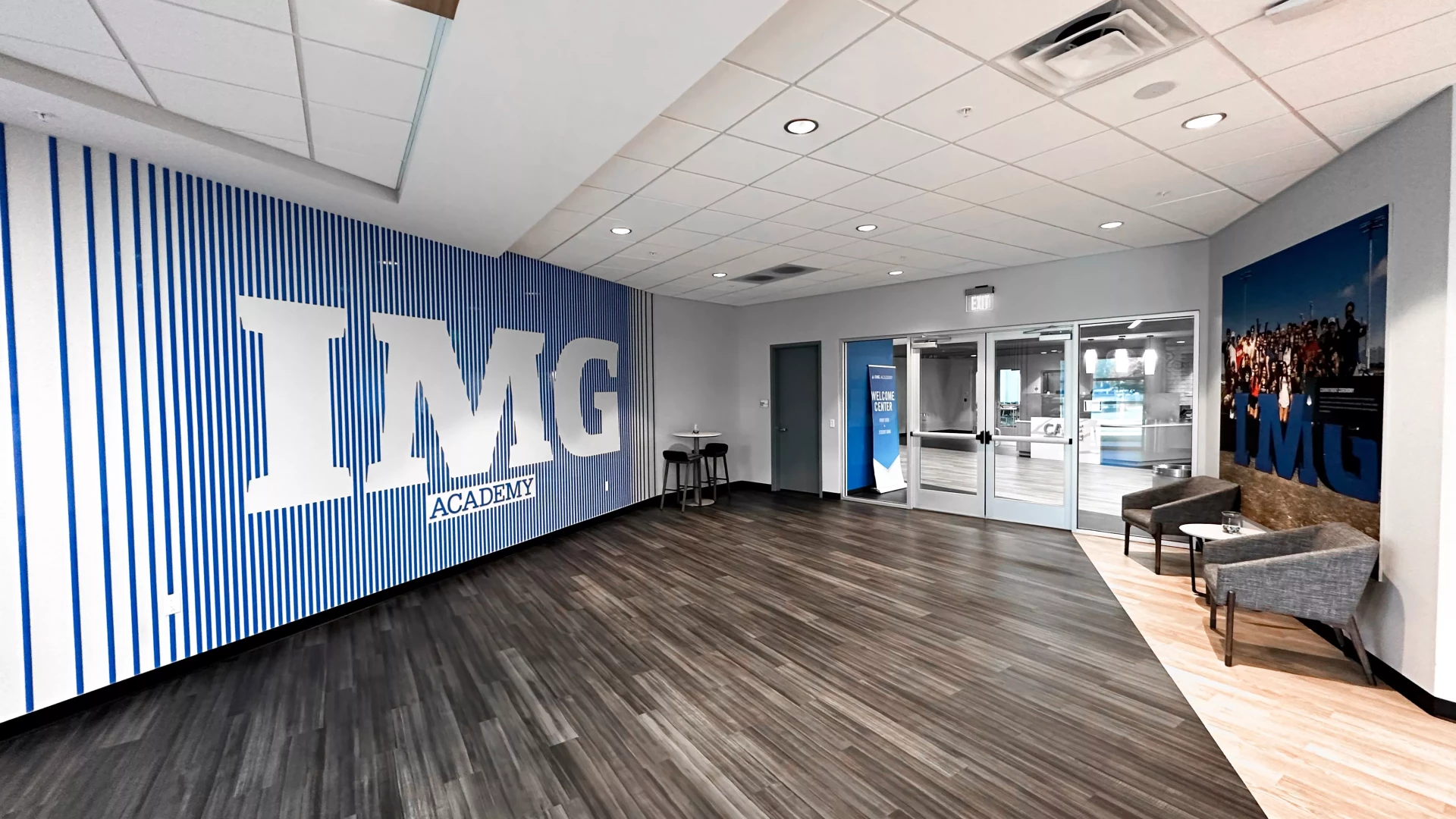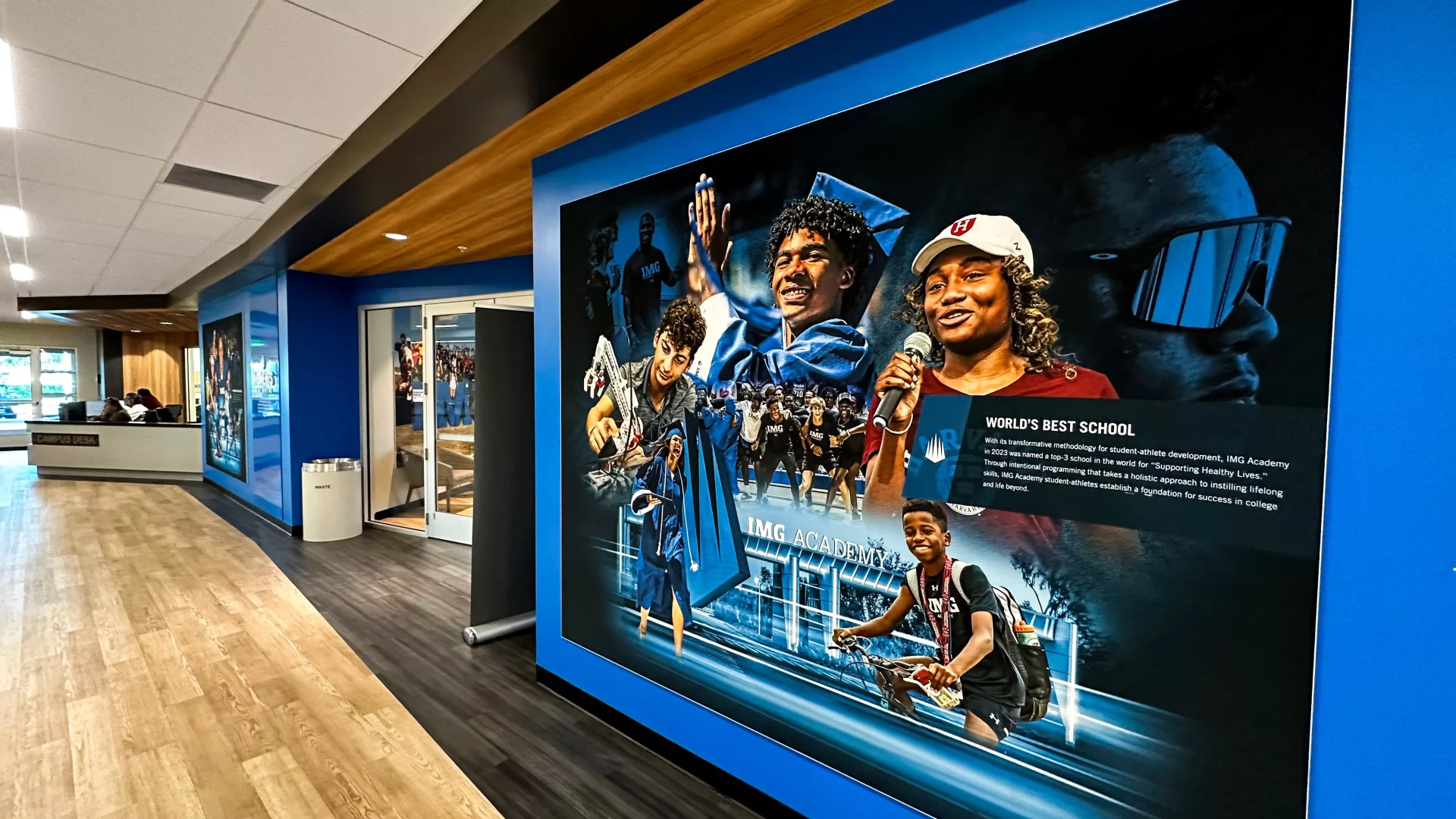 Forty Nine Degrees partnered with IMG Academy on the renovation of the Campus Center, delivering a full design-build of branded environments throughout the facility. A fresh white with blue accents set the tone across the lobby, recruiting/closing room, and main hallways, while dimensional features bring depth and energy to the space.