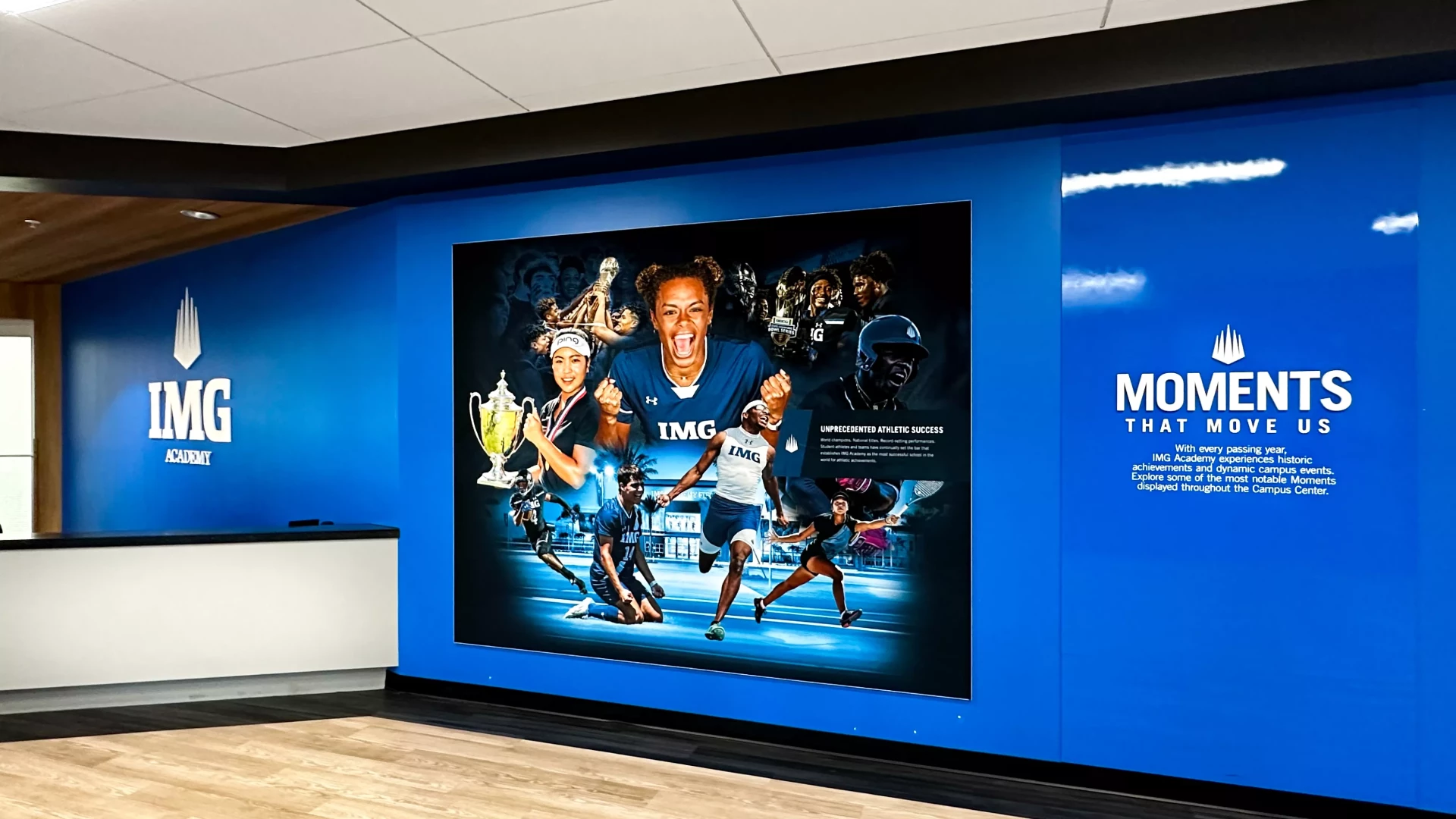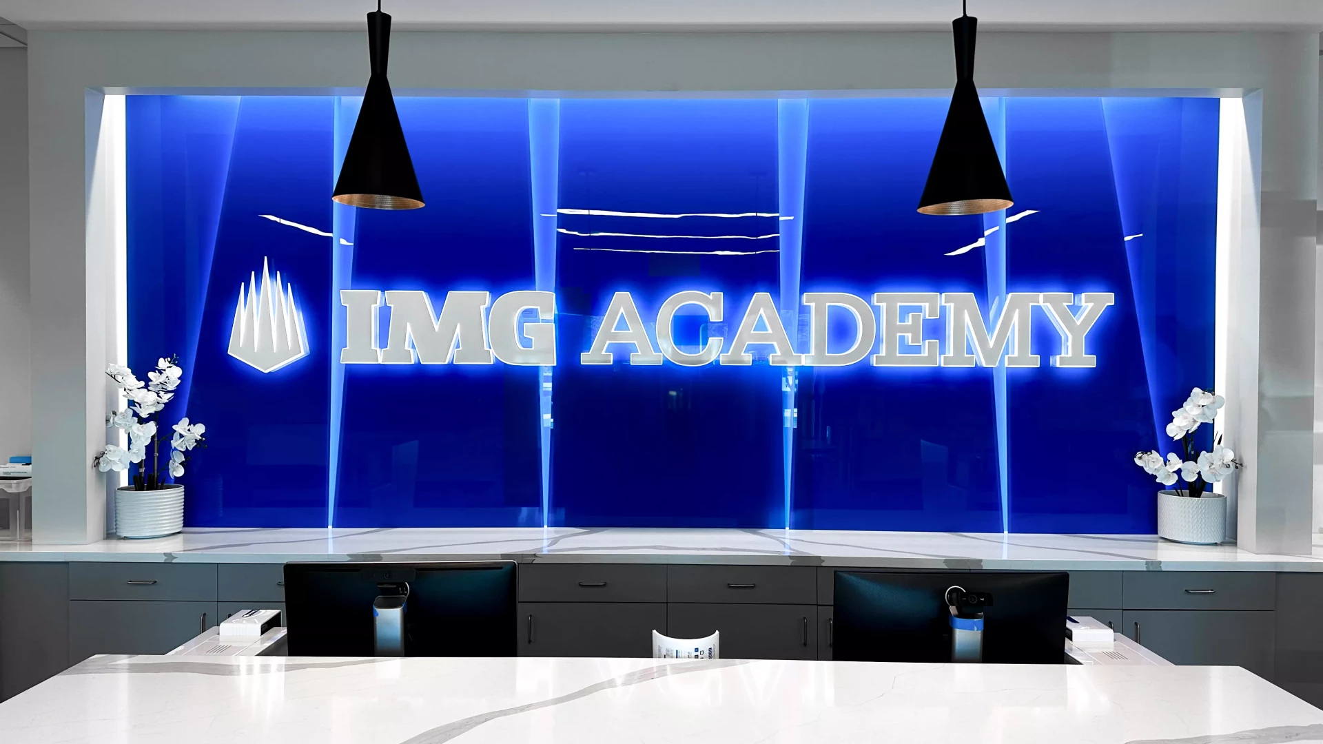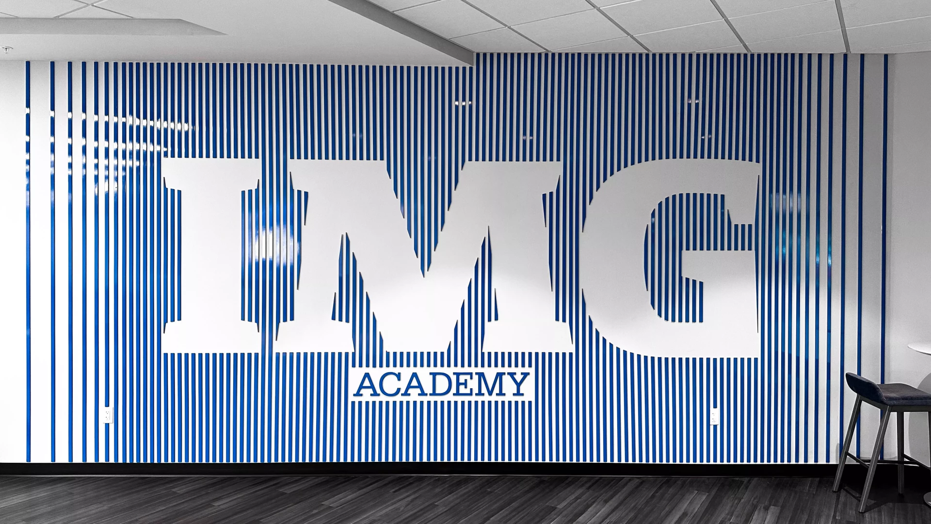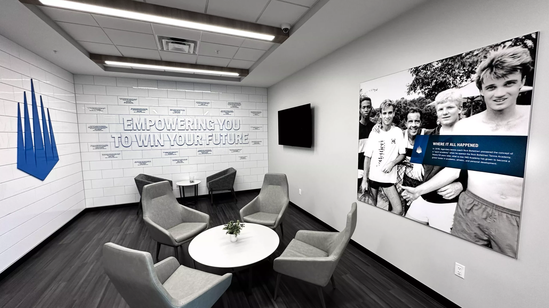 Forty Nine Degrees partnered with IMG Academy on the renovation of the Campus Center, delivering a full design-build of branded environments throughout the facility. A fresh white with blue accents set the tone across the lobby, recruiting/closing room, and main hallways, while dimensional features bring depth and energy to the space.