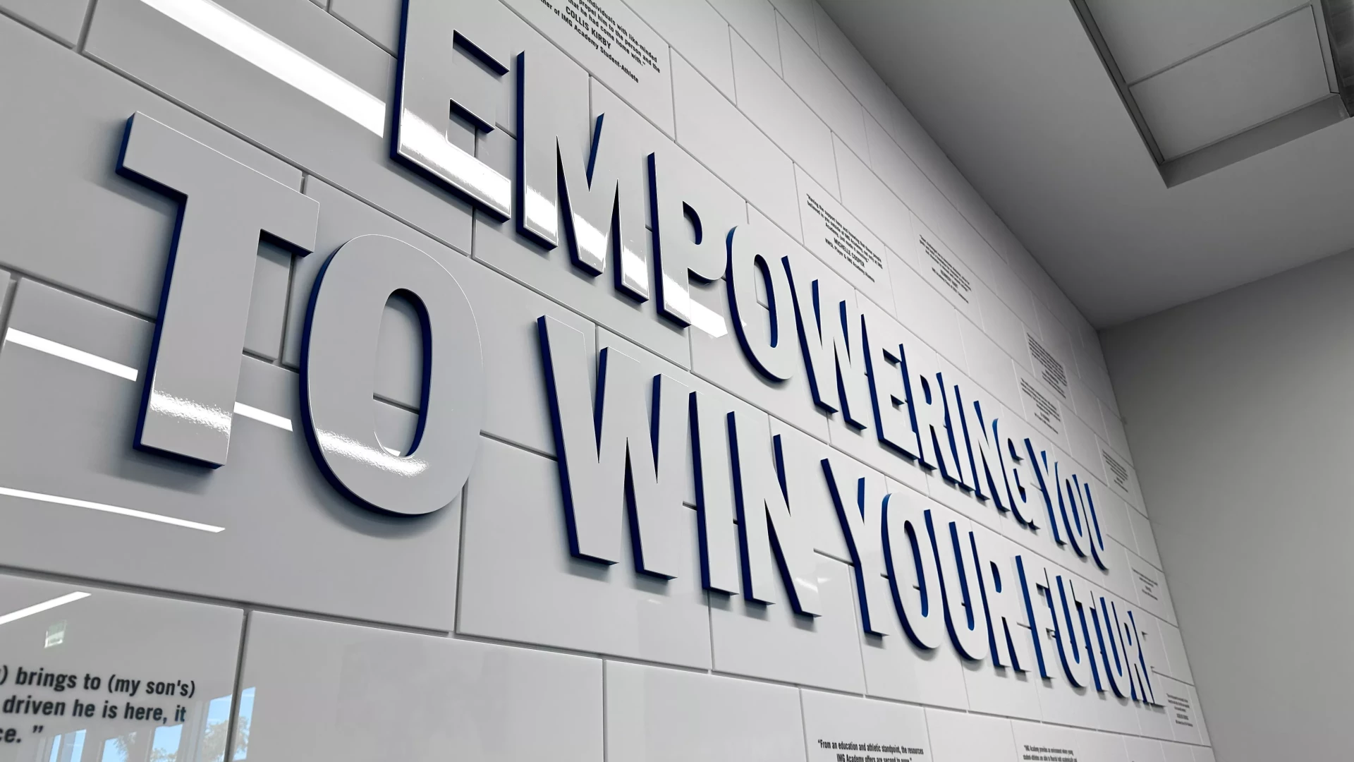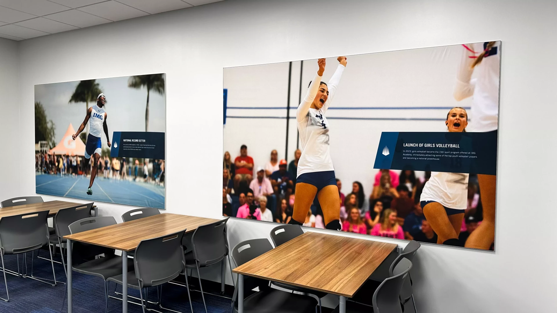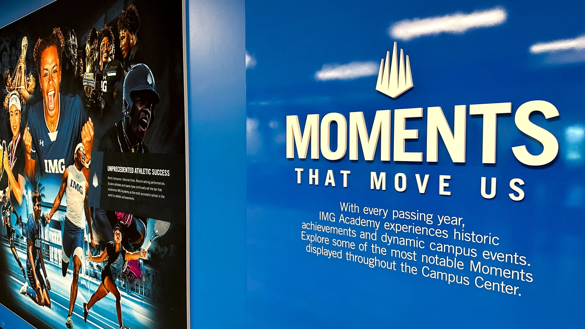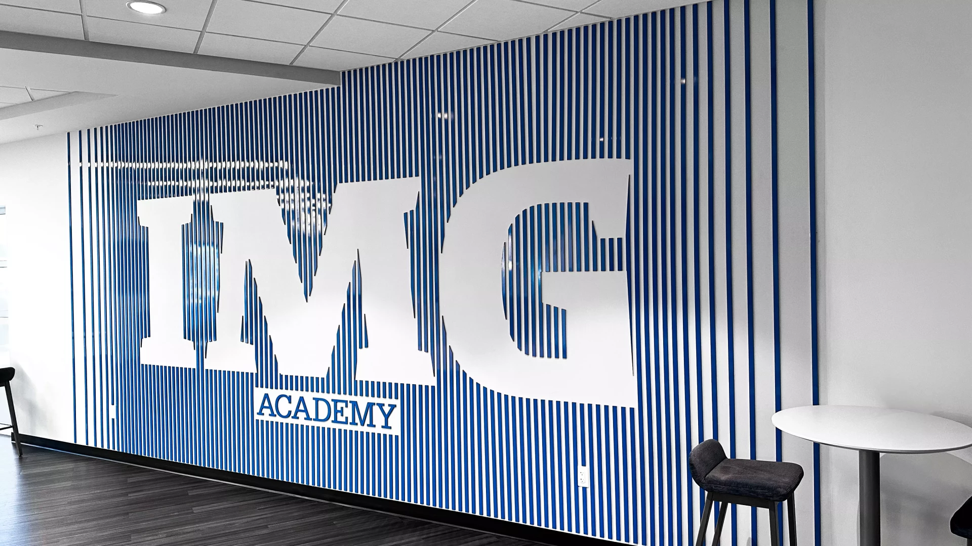 Forty Nine Degrees partnered with IMG Academy on the renovation of the Campus Center, delivering a full design-build of branded environments throughout the facility. A fresh white with blue accents set the tone across the lobby, recruiting/closing room, and main hallways, while dimensional features bring depth and energy to the space.