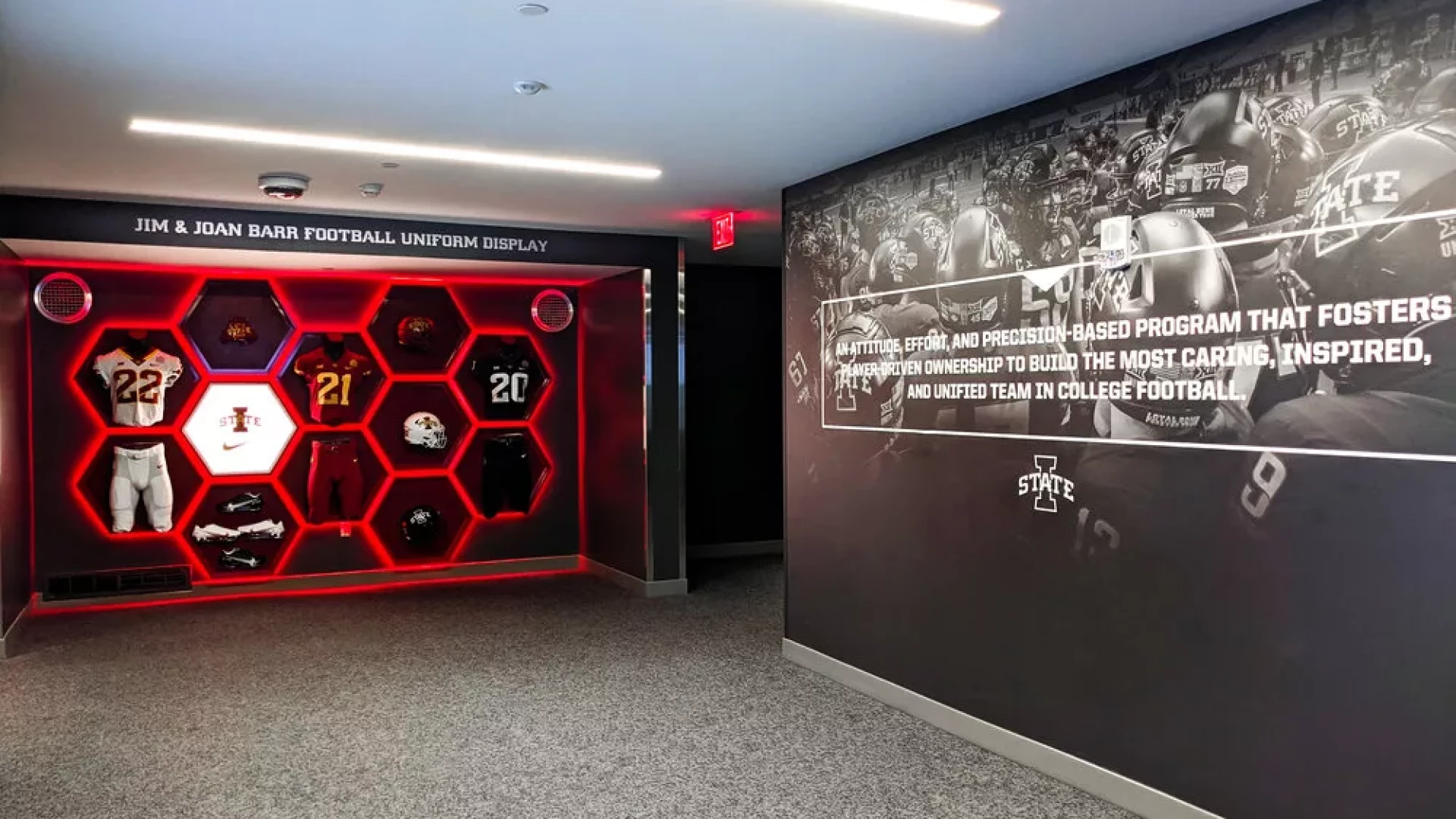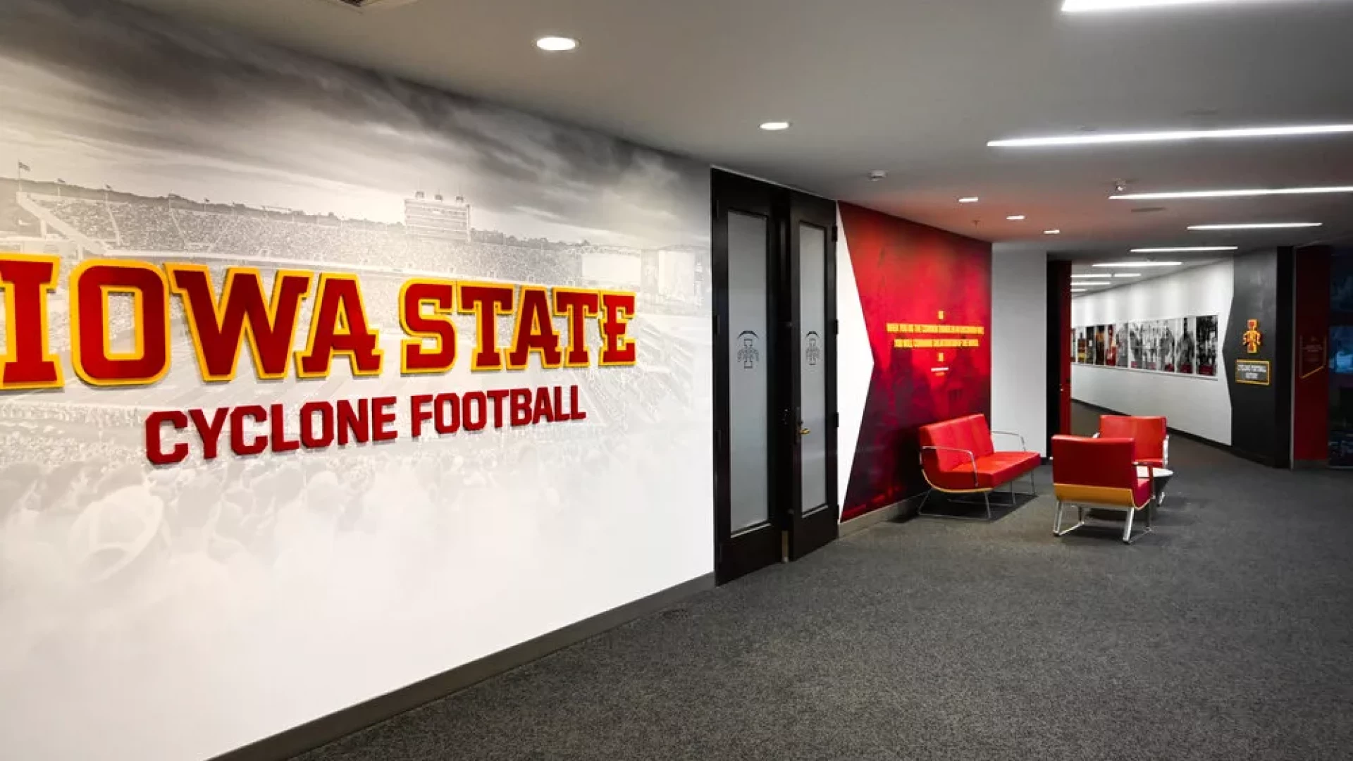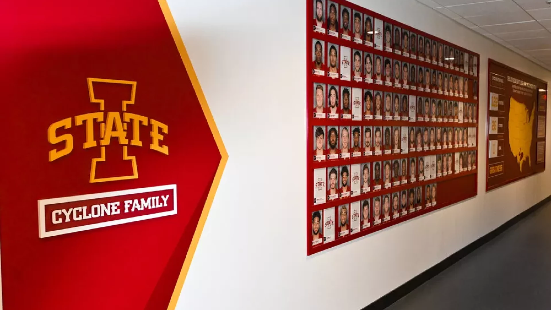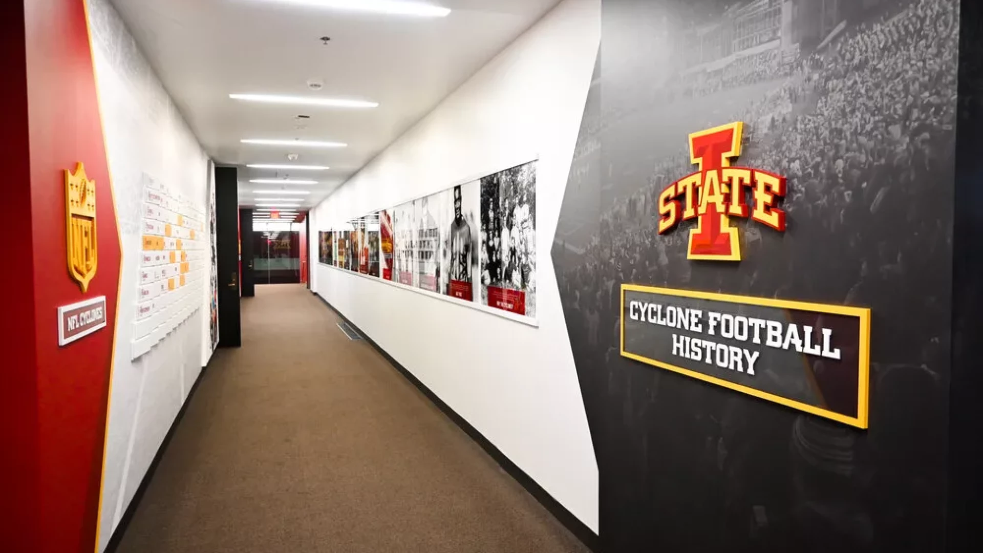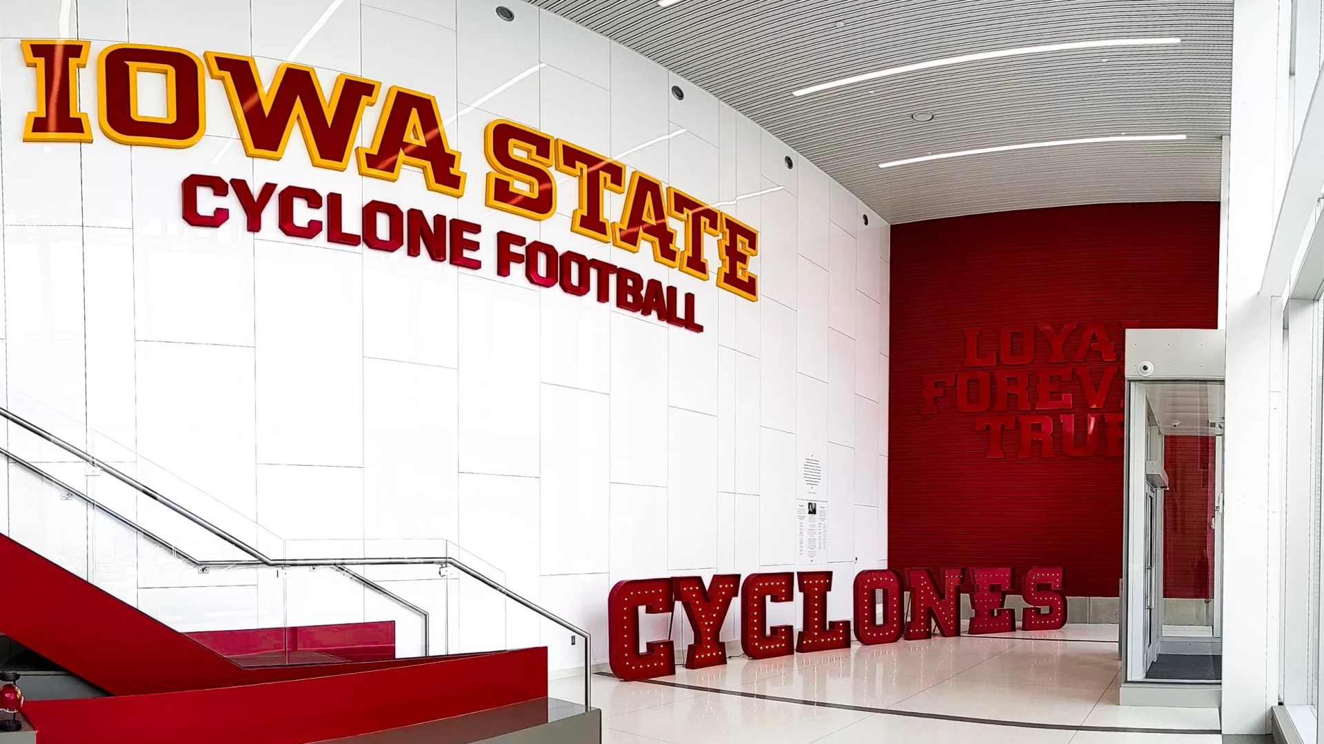 Iowa State added on to their football complex in 2020 and partnered with Forty Nine Degrees in 2021 on branding and graphics. Branding was added to the new lobby with large dimensional lettering which is visible from the parking lot, players locker room, players lounge, hallways and all football position rooms. An illuminated gear wall was added outside of the locker room to showcase ISU uniforms. In addition to the inside, outside branding was completed that can be seen from inside of Jack Trice Stadium.