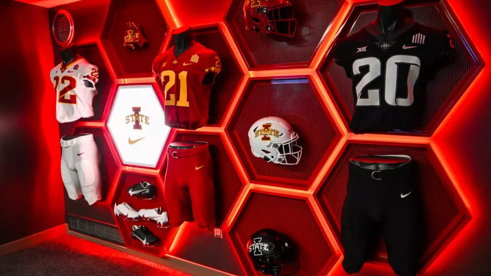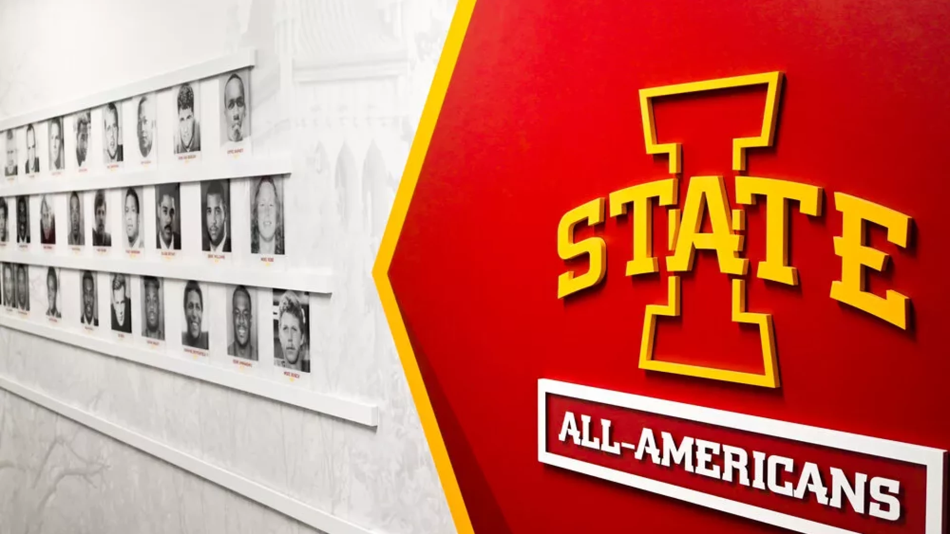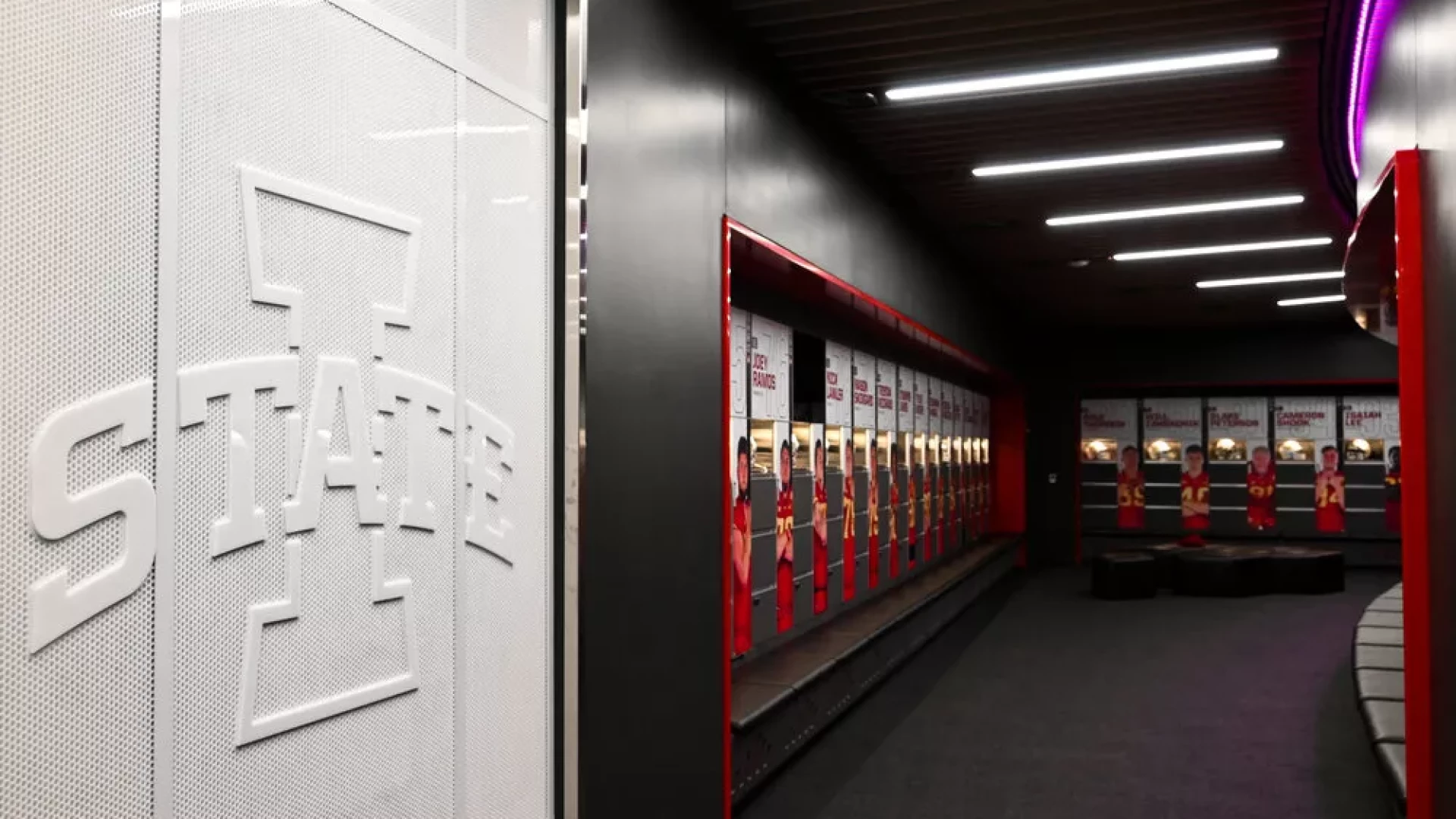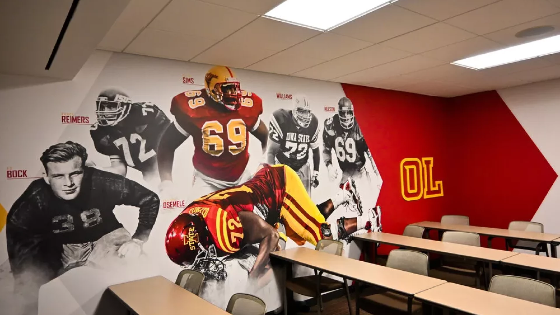 Iowa State added on to their football complex in 2020 and partnered with Forty Nine Degrees in 2021 on branding and graphics. Branding was added to the new lobby with large dimensional lettering which is visible from the parking lot, players locker room, players lounge, hallways and all football position rooms. An illuminated gear wall was added outside of the locker room to showcase ISU uniforms. In addition to the inside, outside branding was completed that can be seen from inside of Jack Trice Stadium.