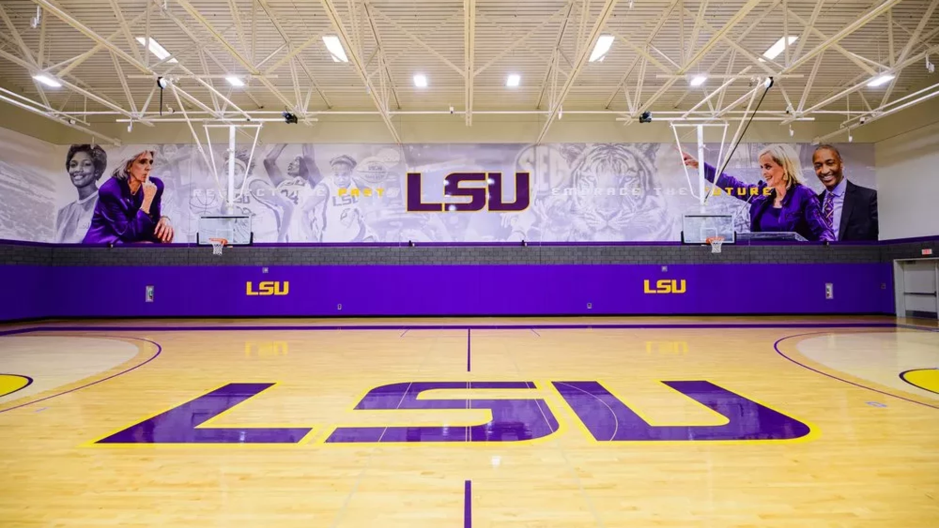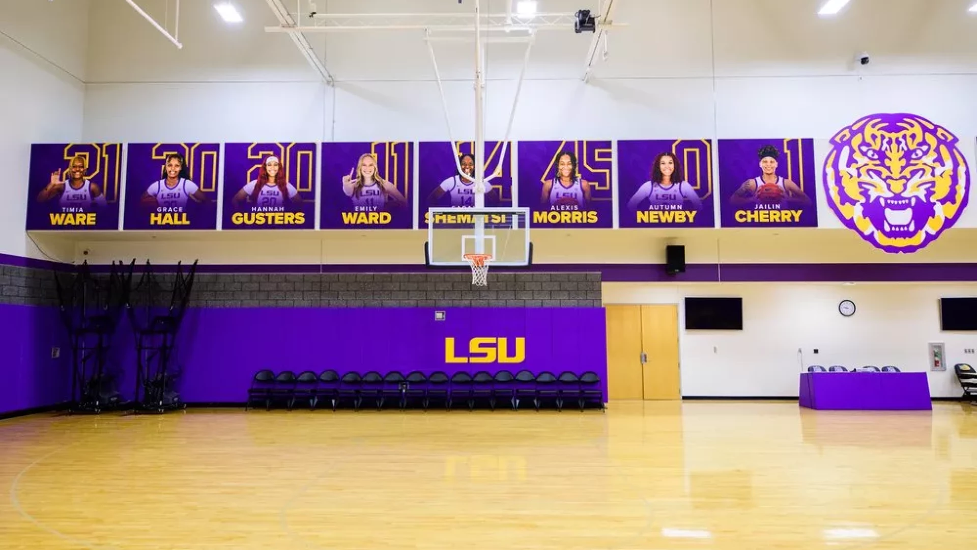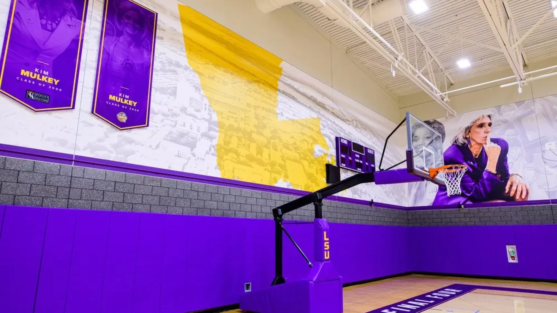 The LSU women's basketball practice gym has undergone a transformation, with large graphics and bold purple and yellow branding, the entire space embodies the spirit of LSU athletics. These visuals, showcasing both the current coaching staff and past LSU coaches, evoke a sense of inspiration. Banners lining the walls serve as reminders of the program's historic successes, instilling players with a winning attitude.