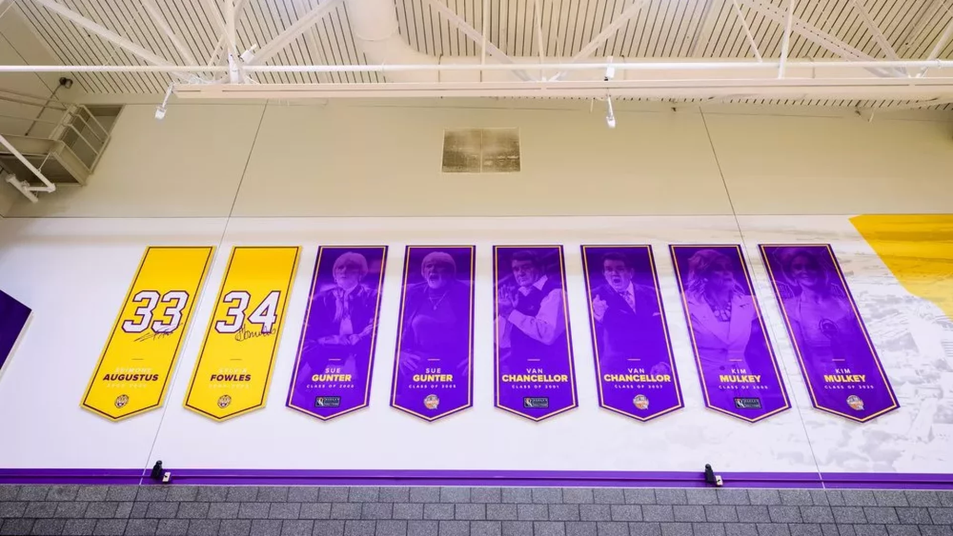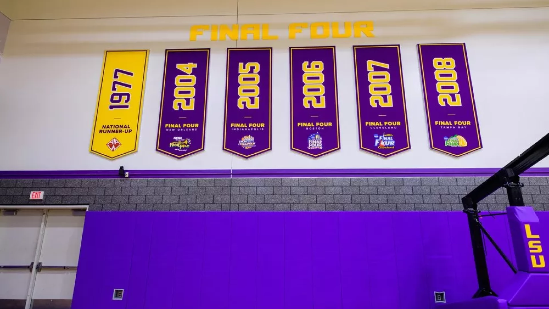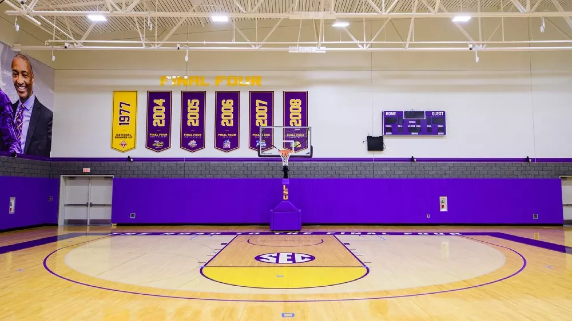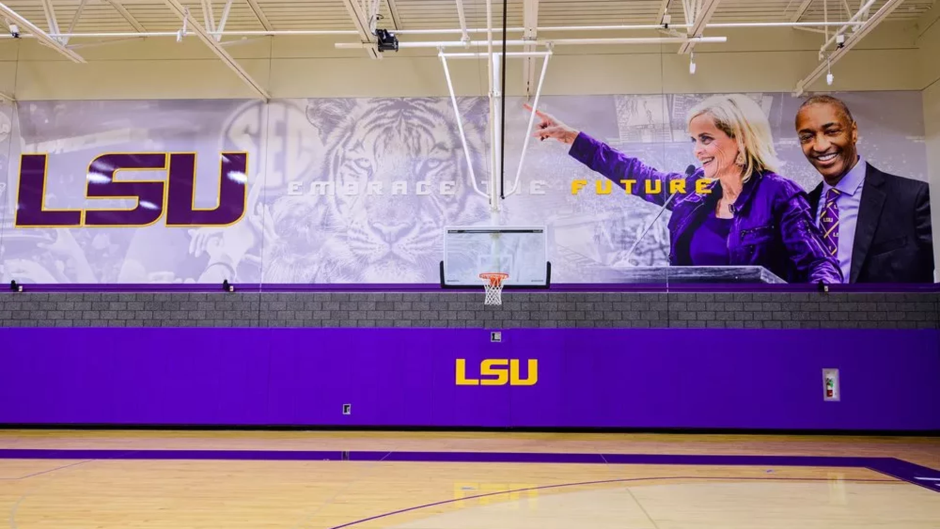 The LSU women's basketball practice gym has undergone a transformation, with large graphics and bold purple and yellow branding, the entire space embodies the spirit of LSU athletics. These visuals, showcasing both the current coaching staff and past LSU coaches, evoke a sense of inspiration. Banners lining the walls serve as reminders of the program's historic successes, instilling players with a winning attitude.