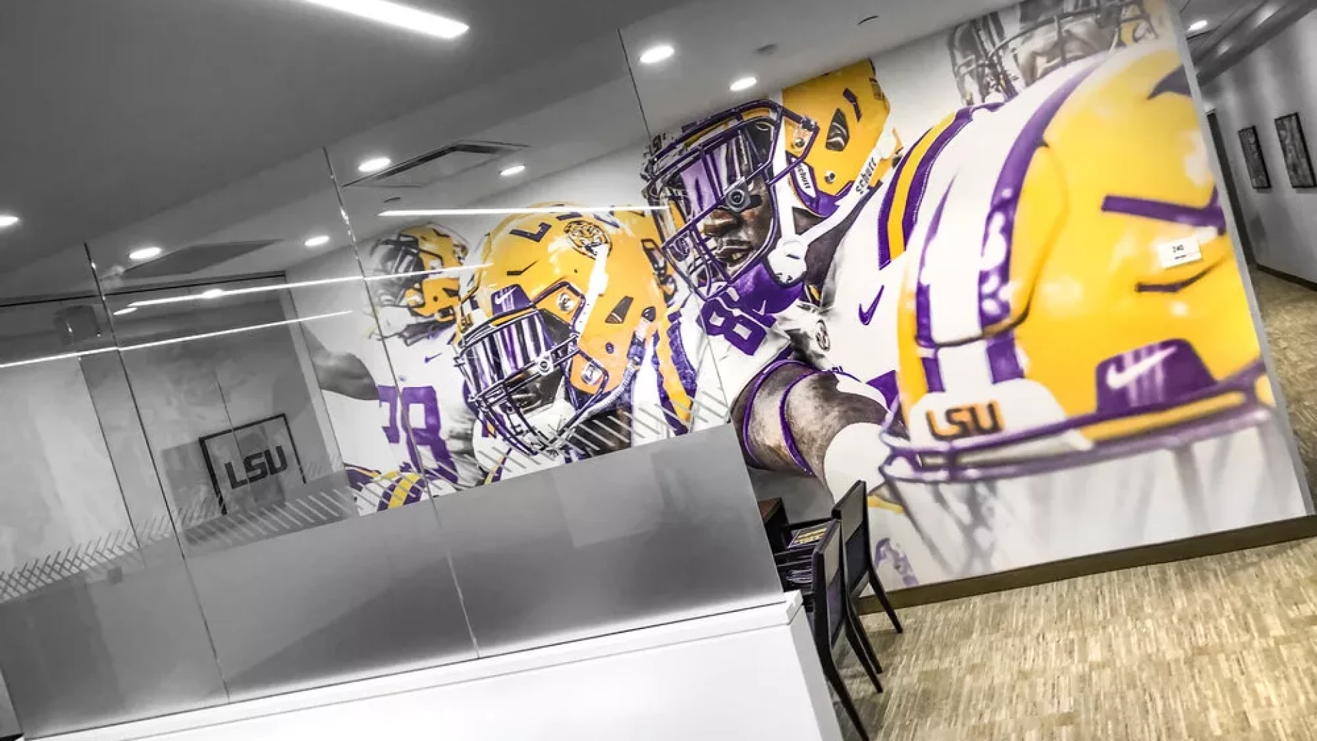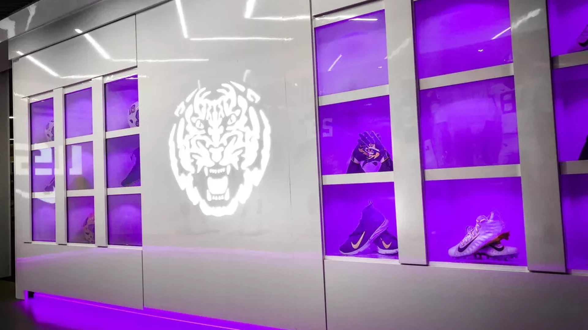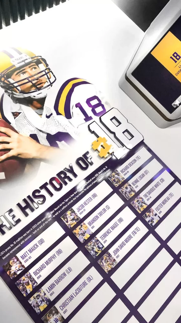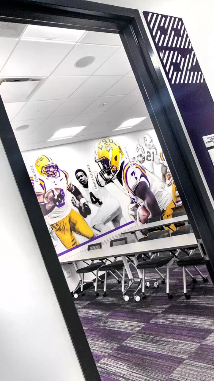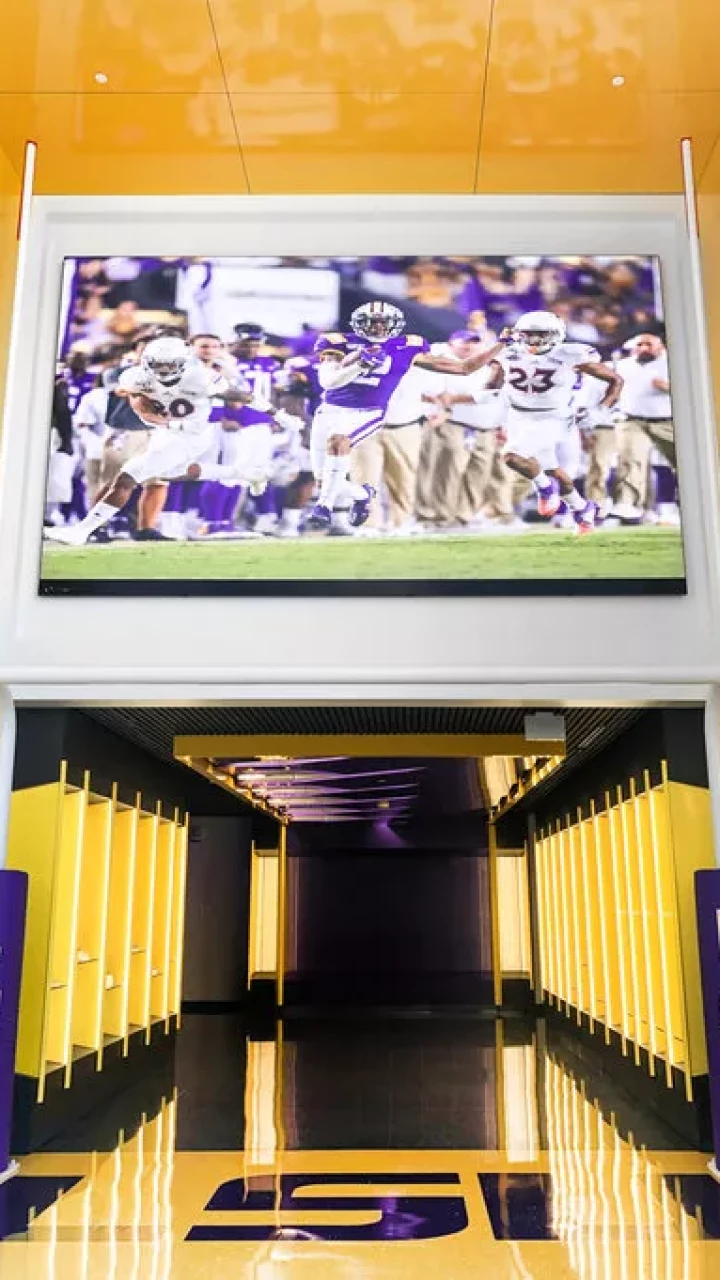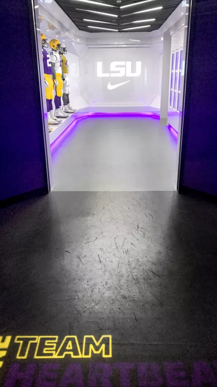 LSU, the Tiger Athletic Foundation and Forty Nine Degrees collaborated to enhance the newly renovated Football Operations and Performance Nutrition Center. The project included an addition of nearly 25,000 square feet, with a new training room, offices, locker room, player’s lounge and cafeteria. Forty Nine Degrees developed several spaces, including projection mapped displays, a custom NIKE corridor and an impactful NFL hallway, adorned with helmets from the respective NFL player's era.