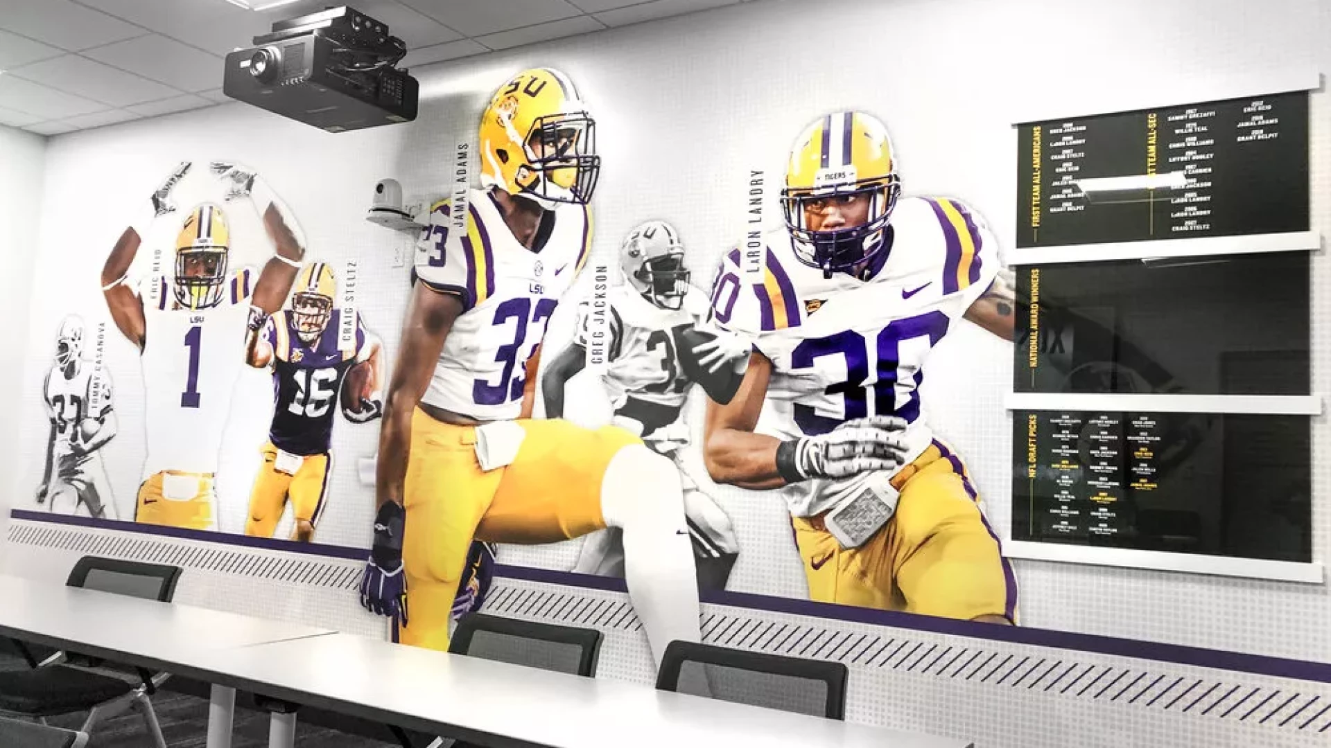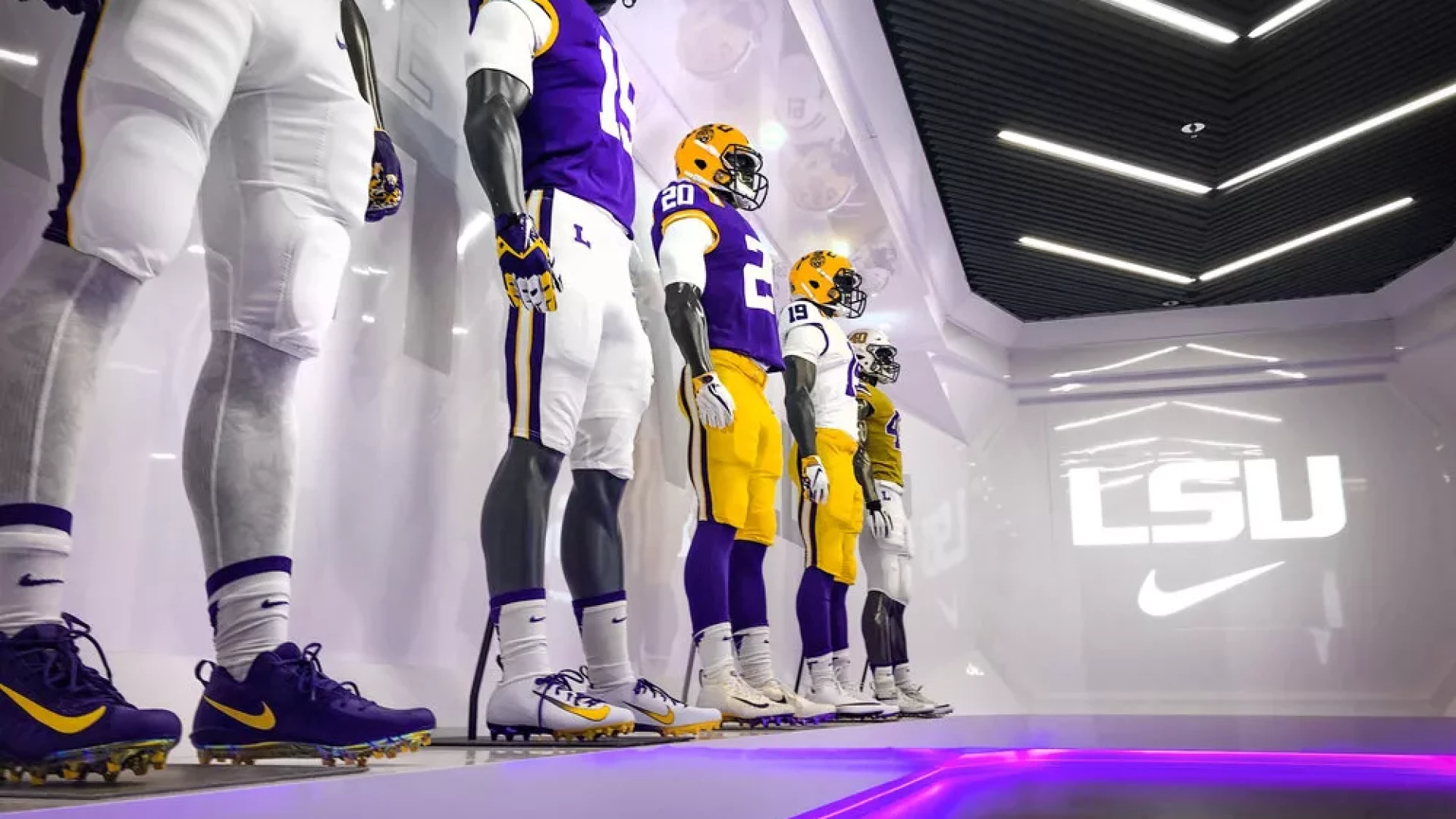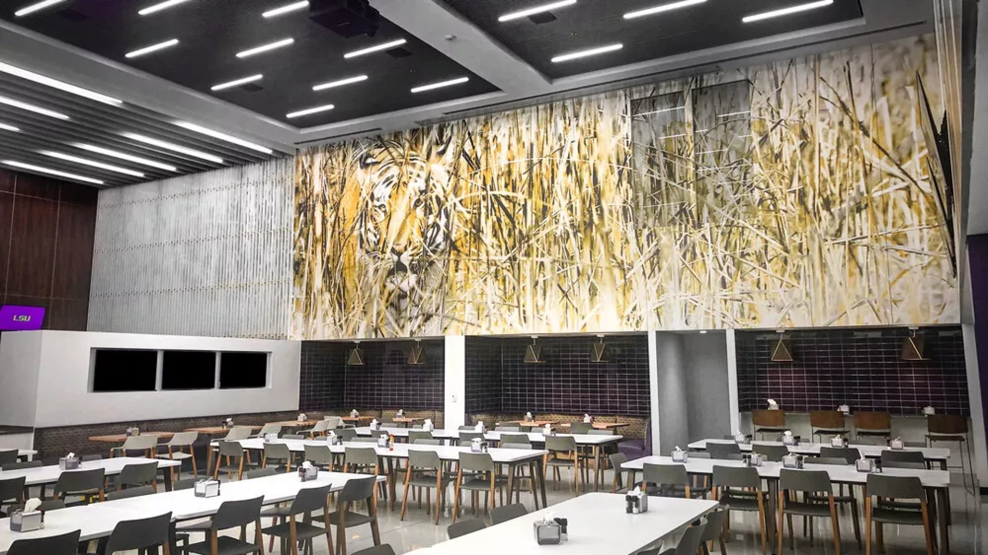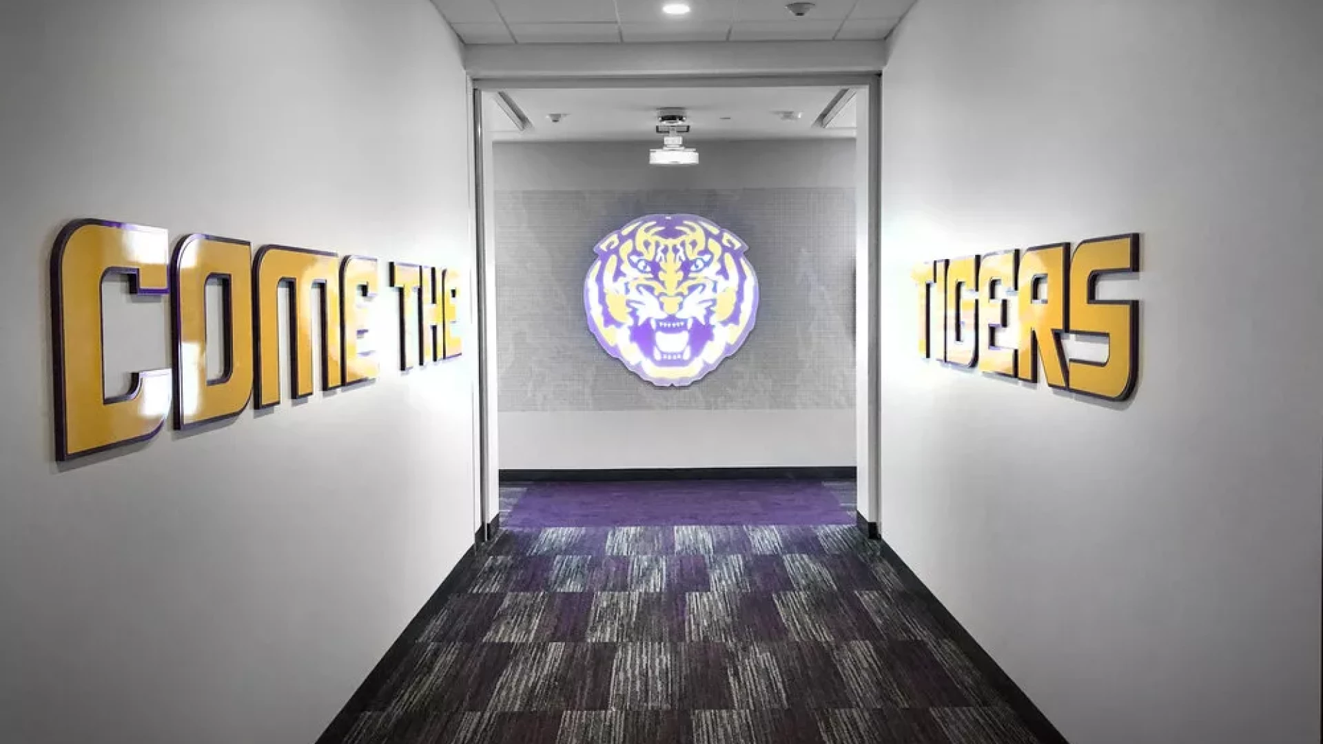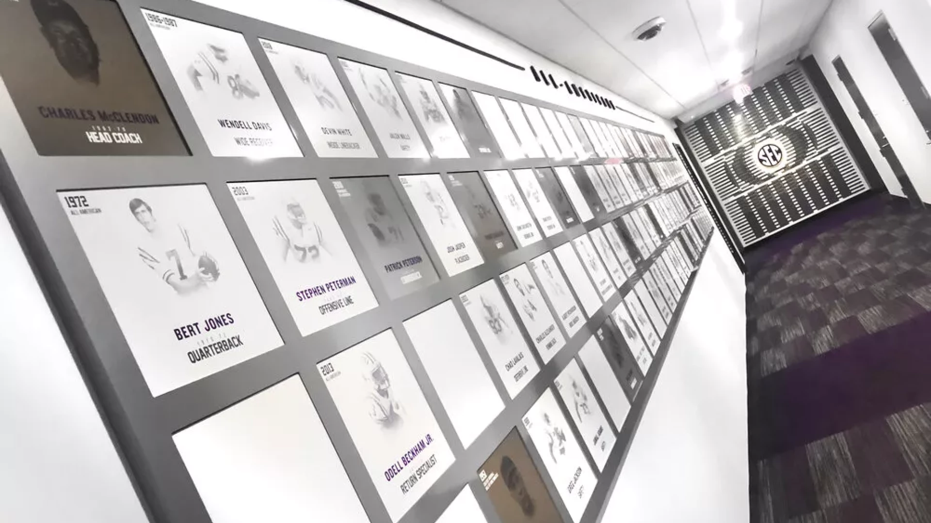 LSU, the Tiger Athletic Foundation and Forty Nine Degrees collaborated to enhance the newly renovated Football Operations and Performance Nutrition Center. The project included an addition of nearly 25,000 square feet, with a new training room, offices, locker room, player’s lounge and cafeteria. Forty Nine Degrees developed several spaces, including projection mapped displays, a custom NIKE corridor and an impactful NFL hallway, adorned with helmets from the respective NFL player's era.