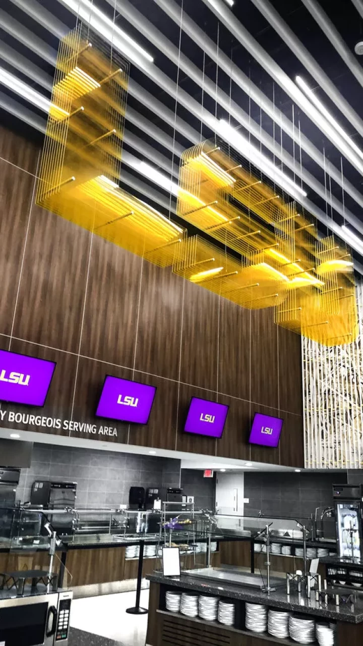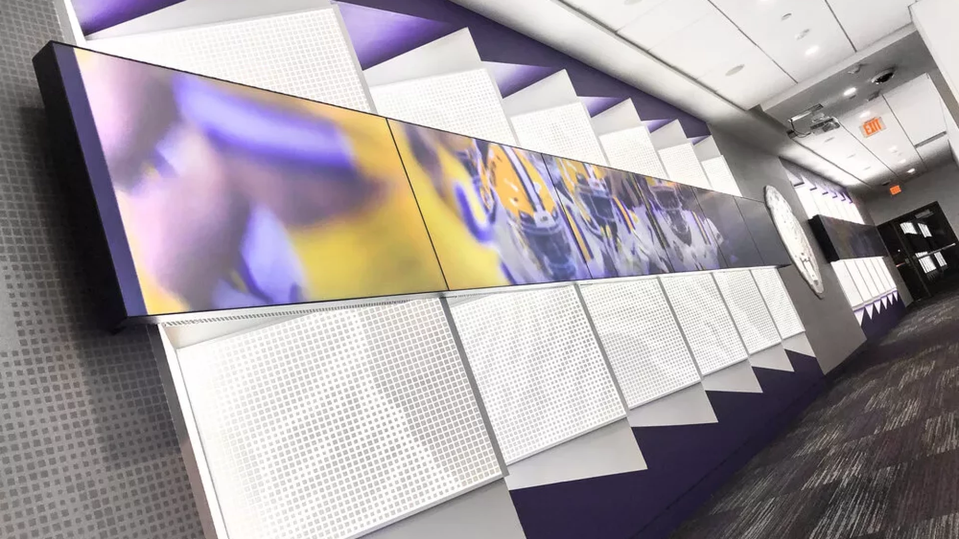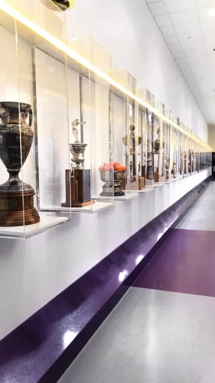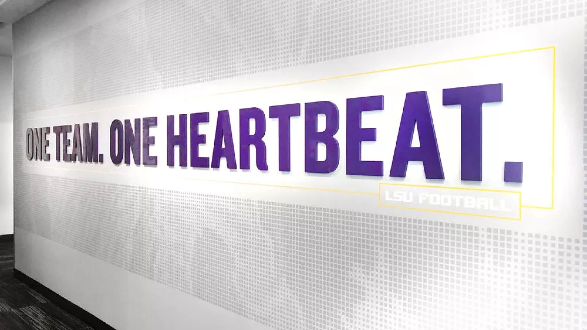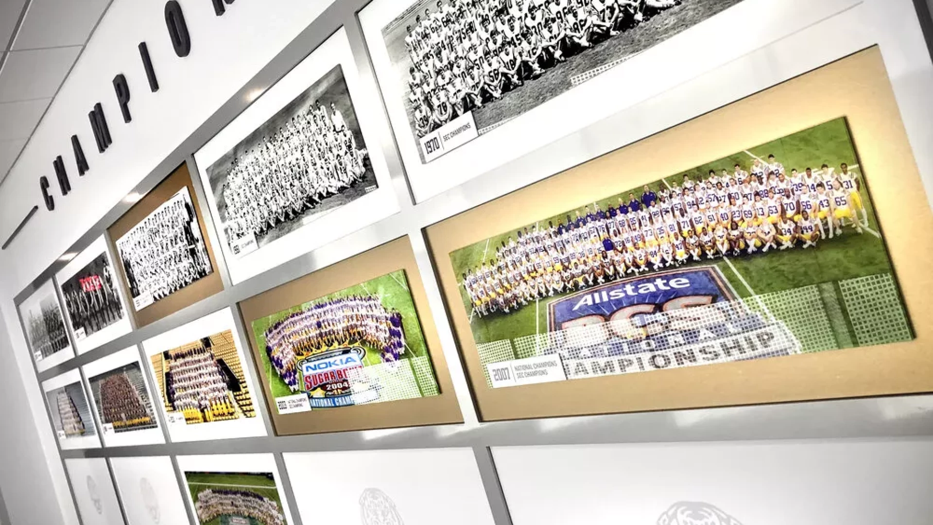 LSU, the Tiger Athletic Foundation and Forty Nine Degrees collaborated to enhance the newly renovated Football Operations and Performance Nutrition Center. The project included an addition of nearly 25,000 square feet, with a new training room, offices, locker room, player’s lounge and cafeteria. Forty Nine Degrees developed several spaces, including projection mapped displays, a custom NIKE corridor and an impactful NFL hallway, adorned with helmets from the respective NFL player's era.