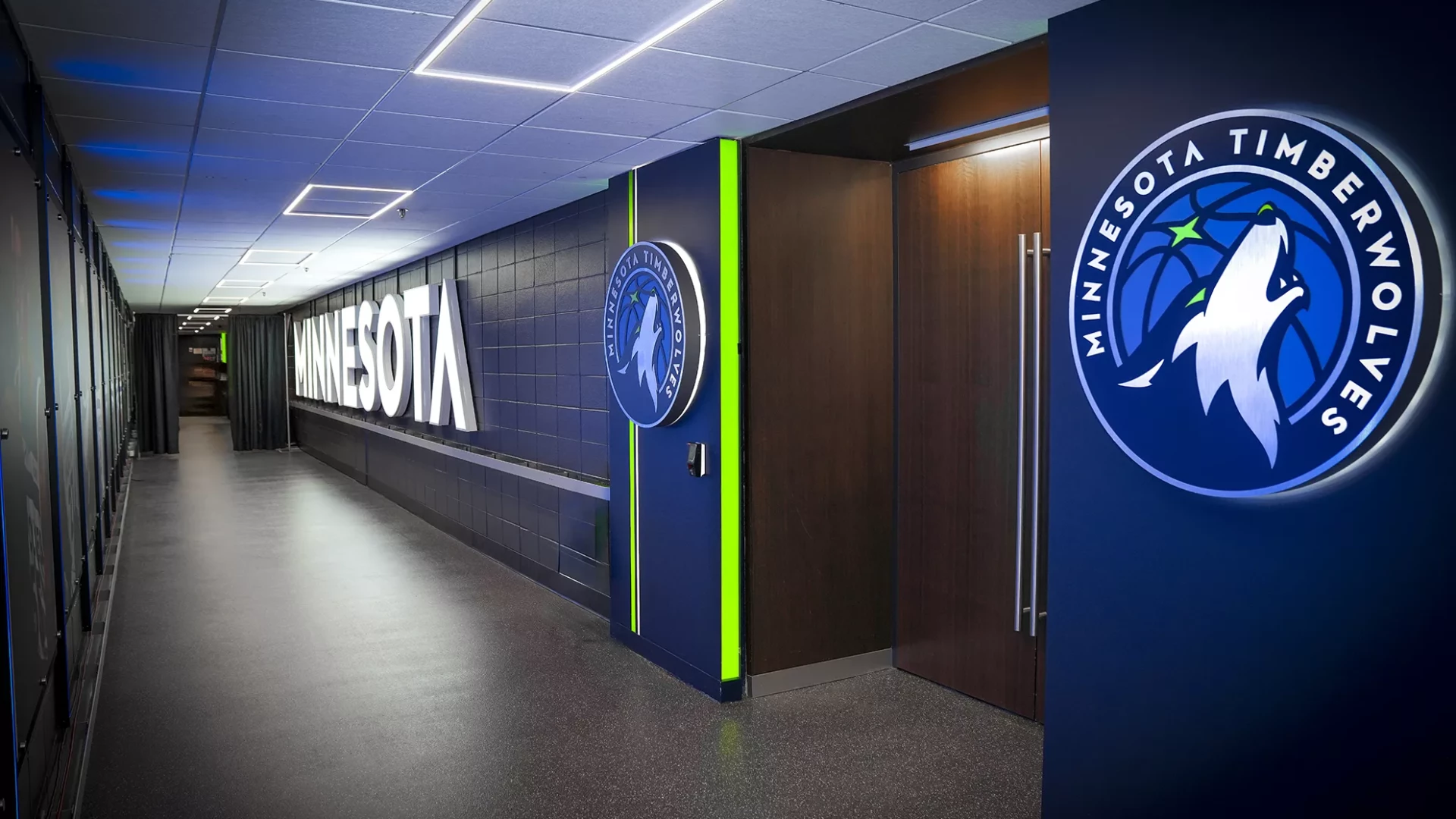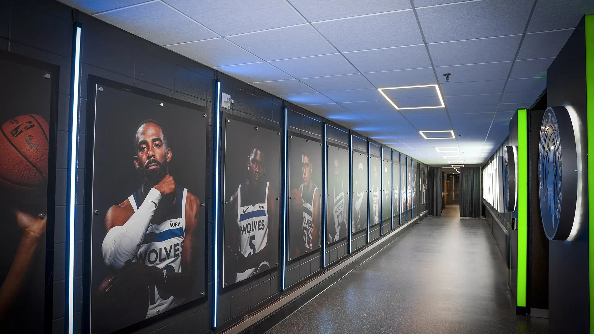 Forty Nine Degrees collaborated with the Minnesota Timberwolves to enhance the player hallway experience as part of a renovation project. The design incorporates illuminated dimensional lettering and logos to create a dramatic ambiance, elevating the atmosphere and energizing the space for players as they make their way to the locker room.