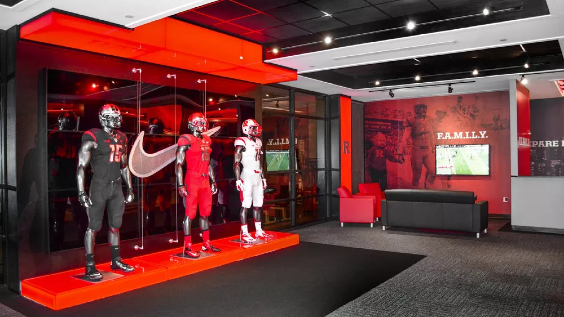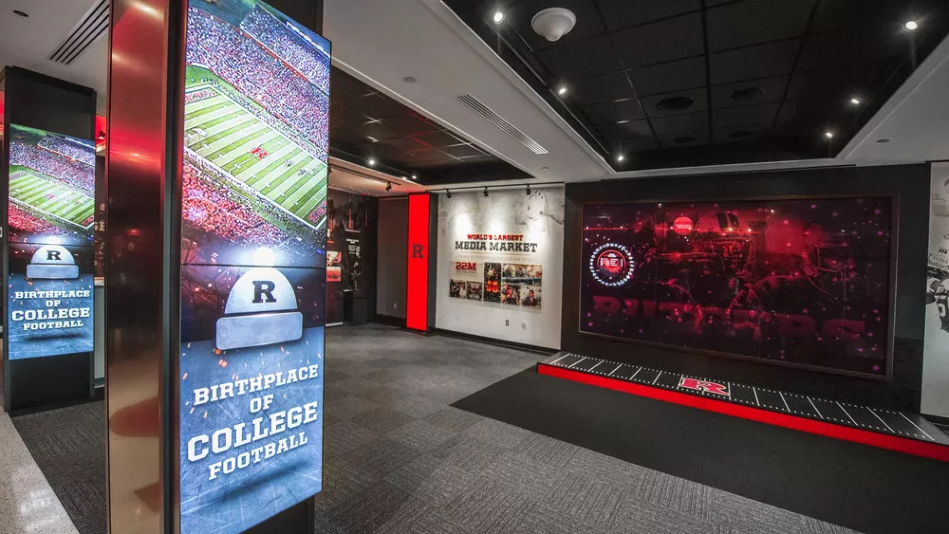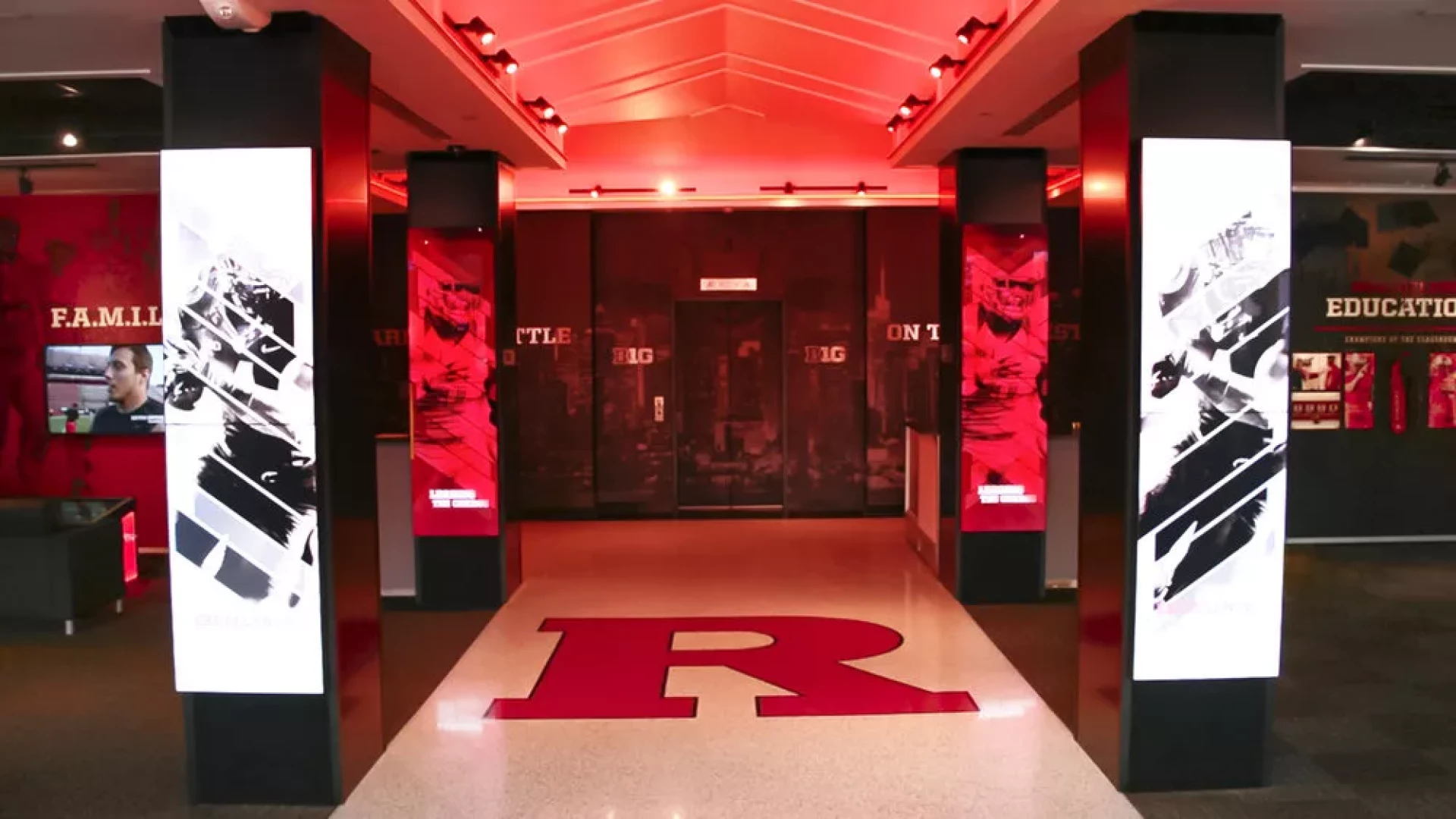 Prior to the start of the 2015 season, Rutgers Football turned to Forty Nine Degrees to bring big changes to the Hale Center. Working directly with the Knight’s Football Staff, Forty Nine Degrees developed a design approach that completely transformed the lobby and main hallways of the facility. Outdated displays were replaced with an immersive mannequin display featuring a video matrix background, a custom multi-user interactive touchscreen matrix, illuminated display cases and a waiting area with modern furniture and interactive touch table. Illuminated acrylic panels flow throughout the facility bringing emphasis to oversized graphics, core messaging and branding.