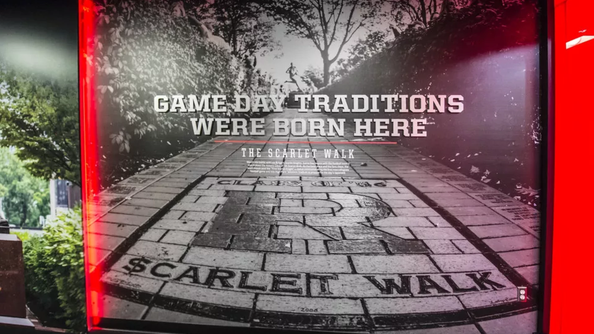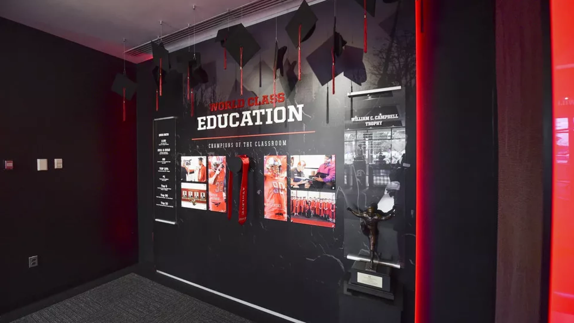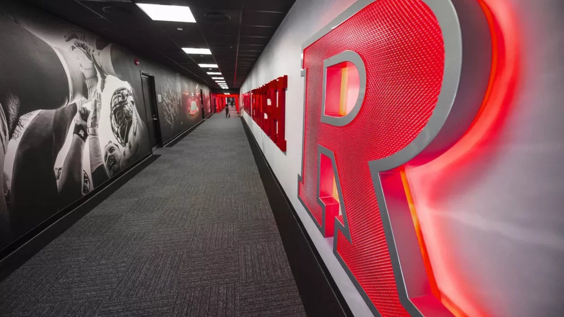 Prior to the start of the 2015 season, Rutgers Football turned to Forty Nine Degrees to bring big changes to the Hale Center. Working directly with the Knight’s Football Staff, Forty Nine Degrees developed a design approach that completely transformed the lobby and main hallways of the facility. Outdated displays were replaced with an immersive mannequin display featuring a video matrix background, a custom multi-user interactive touchscreen matrix, illuminated display cases and a waiting area with modern furniture and interactive touch table. Illuminated acrylic panels flow throughout the facility bringing emphasis to oversized graphics, core messaging and branding.