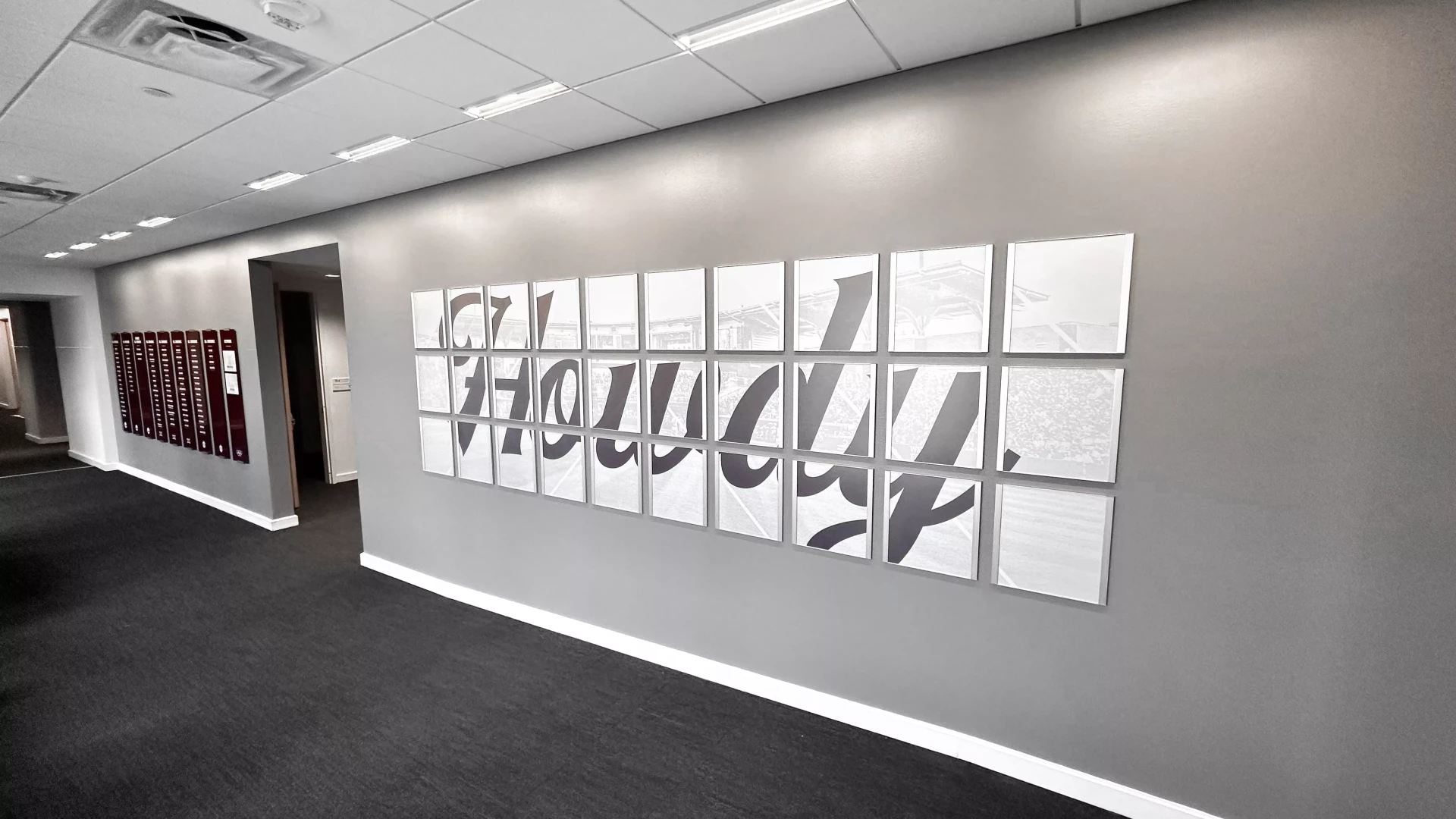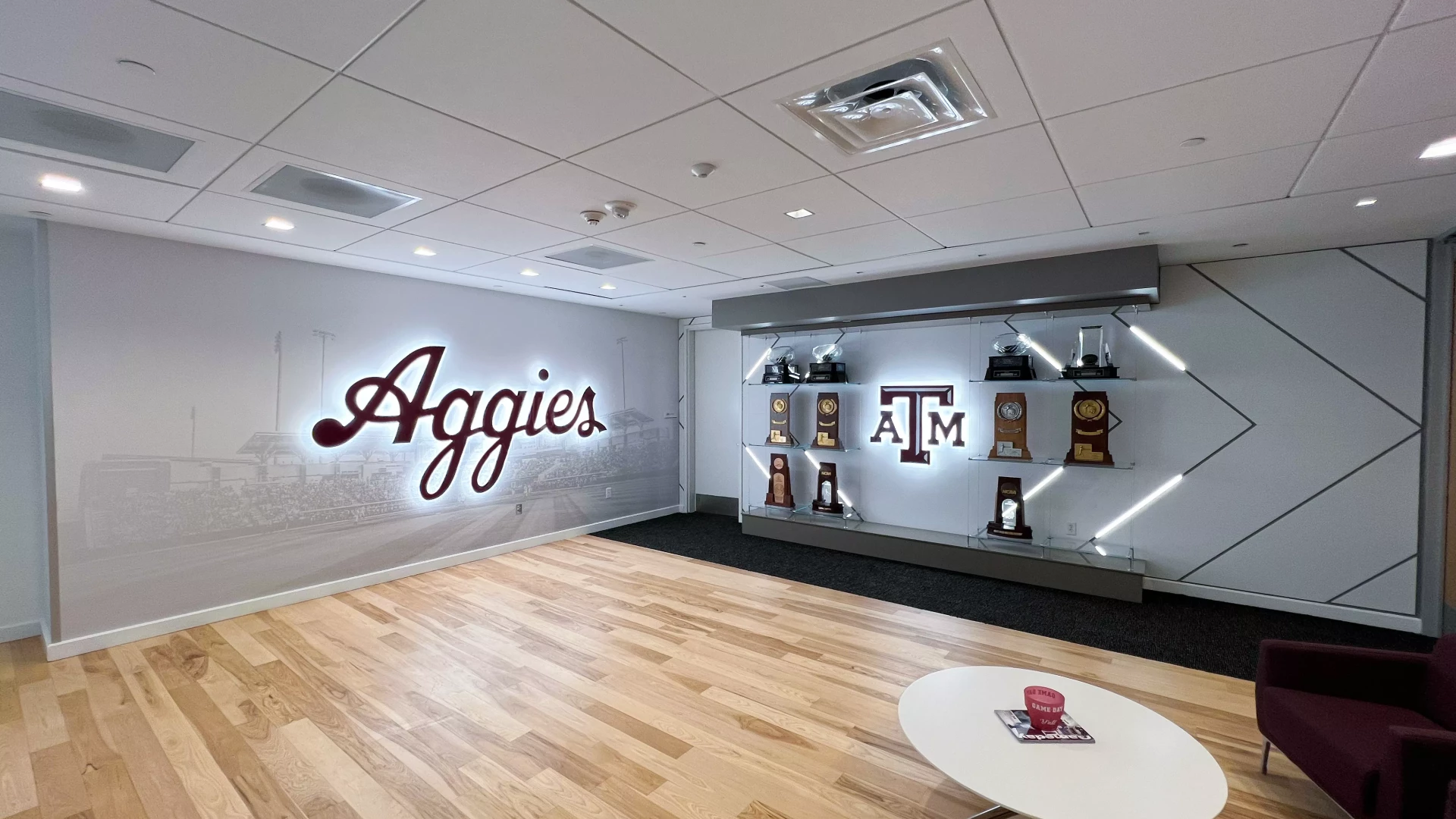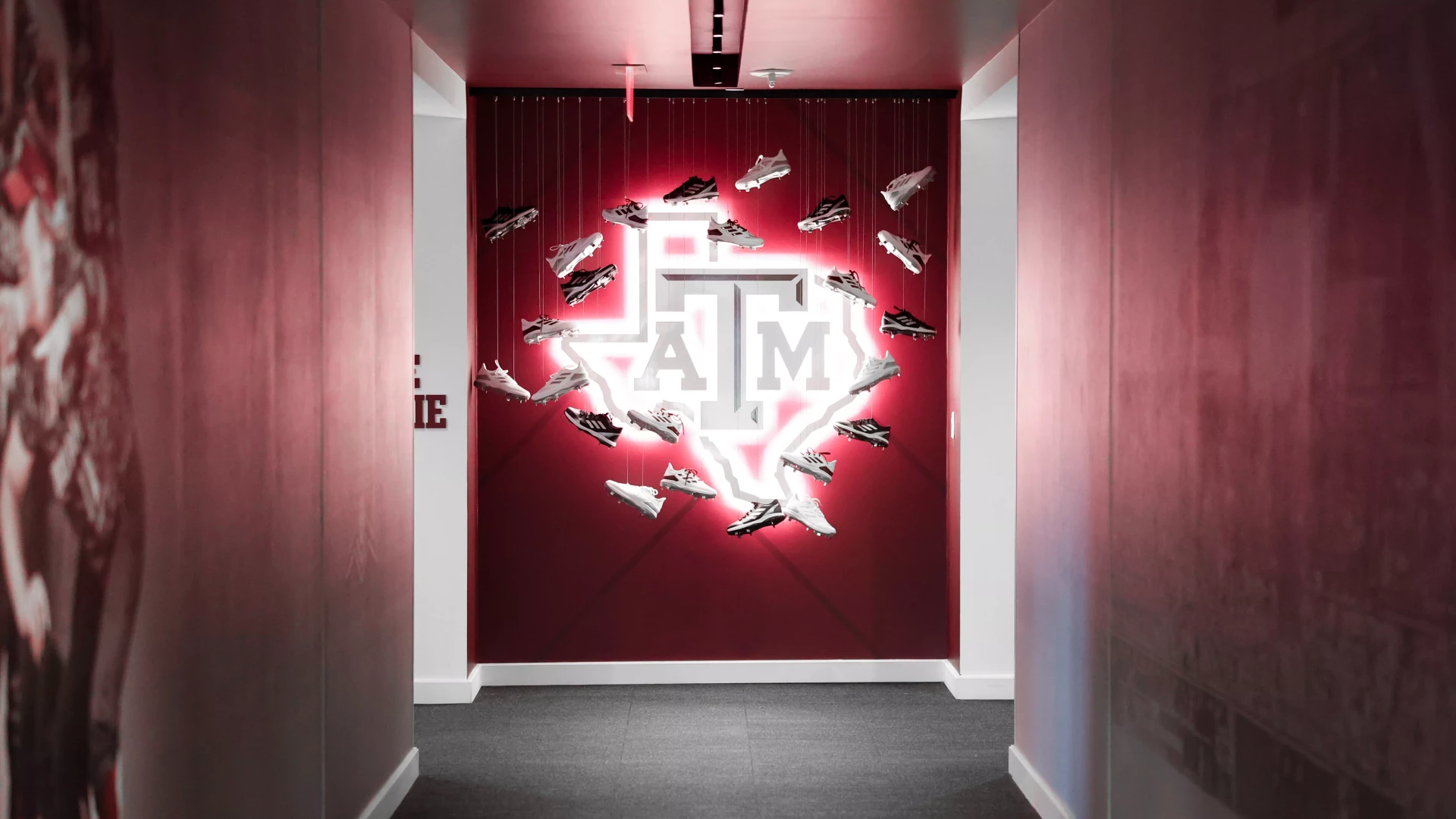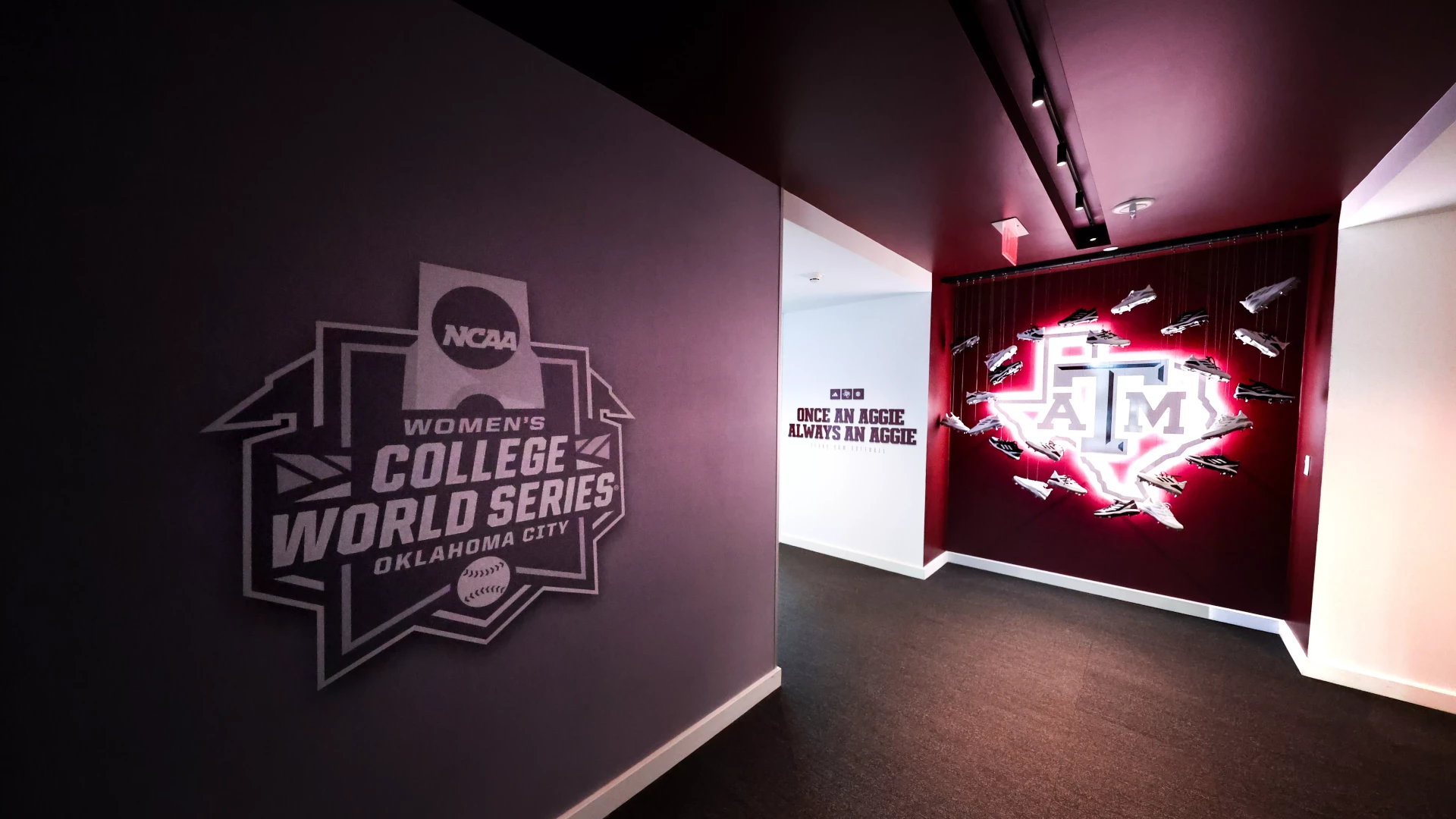 A signature highlight of the project is a shoe display that pays tribute to each athlete’s journey. The installation honors the tradition of players leaving their shoes behind after their final game, symbolizing the legacy they leave with the program. Together, these elements build a space that balances inspiration, tradition, and modern branding, ensuring that the facility reflects both the pride of Texas A&M and the future of its softball program.