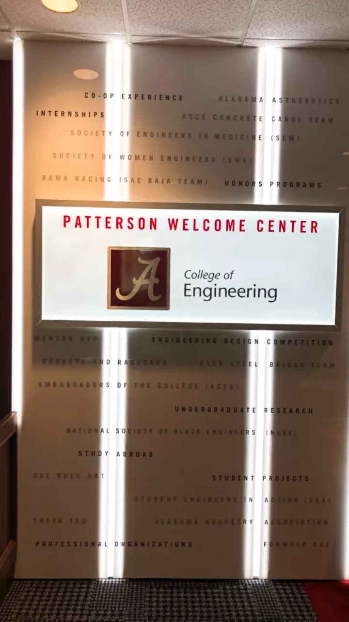 Forty Nine Degrees partnered with the University of Alabama to renovate H.M. Comer Hall, home to the College of Engineering. Graphics and signage communicate the high professionalism that’s associated with engineering. An updated entryway and dynamic Patterson Welcome Center, showcases this first-class institution to students, parents, and facility alike.