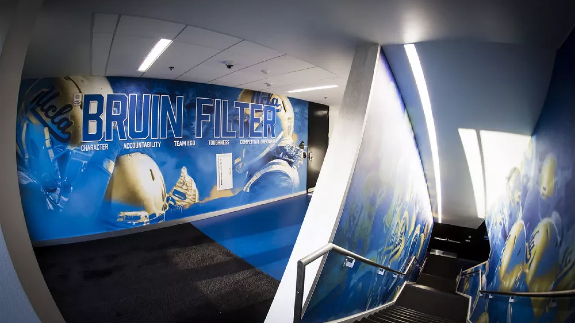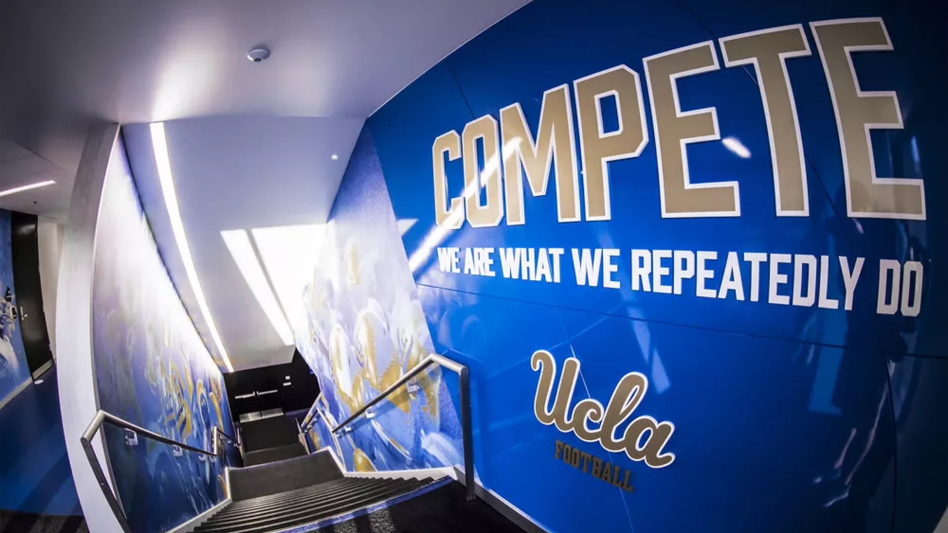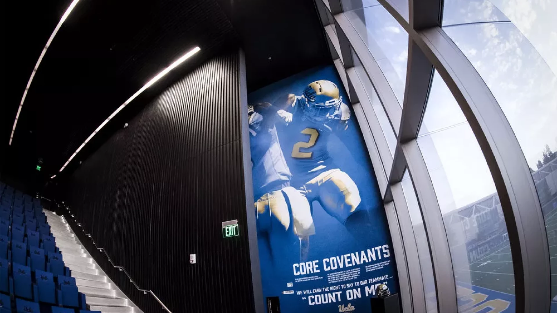 Working with UCLA Football, Forty Nine Degrees brought bold color and graphic impact to the state-of-the-art Wasserman Football Center. Designed by ZGF Architects, the 75,000 square-feet training facility provides a range of amenities including the Troy Aikman Strength and Conditioning Center, locker rooms, training and treatment room, nutrition center, hydrotherapy pools, meeting spaces, barbershop, players' lounge, recruiting lounge and terrace. Large-scale graphics and displays reinforce key program messages and honor the accomplishments of past Bruin Greats.