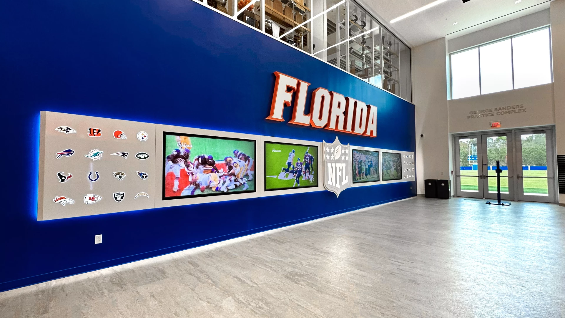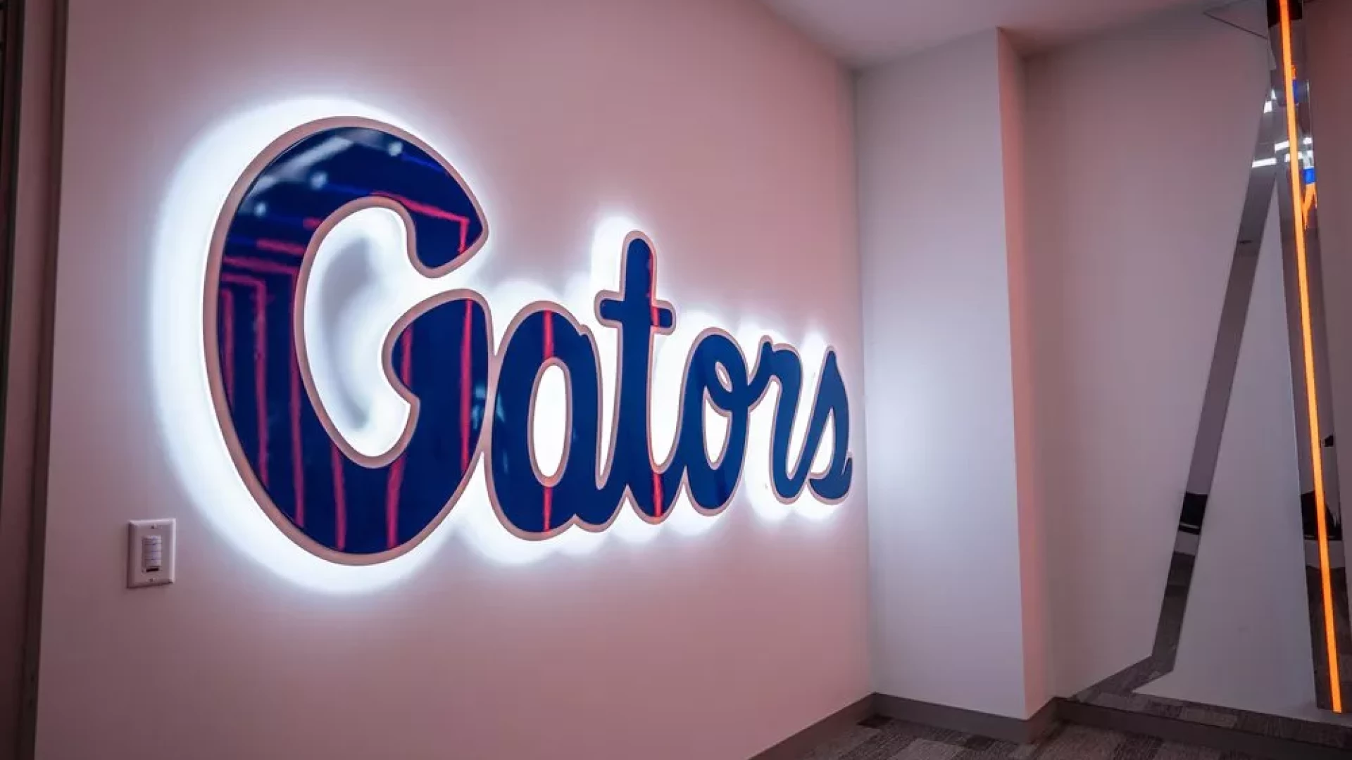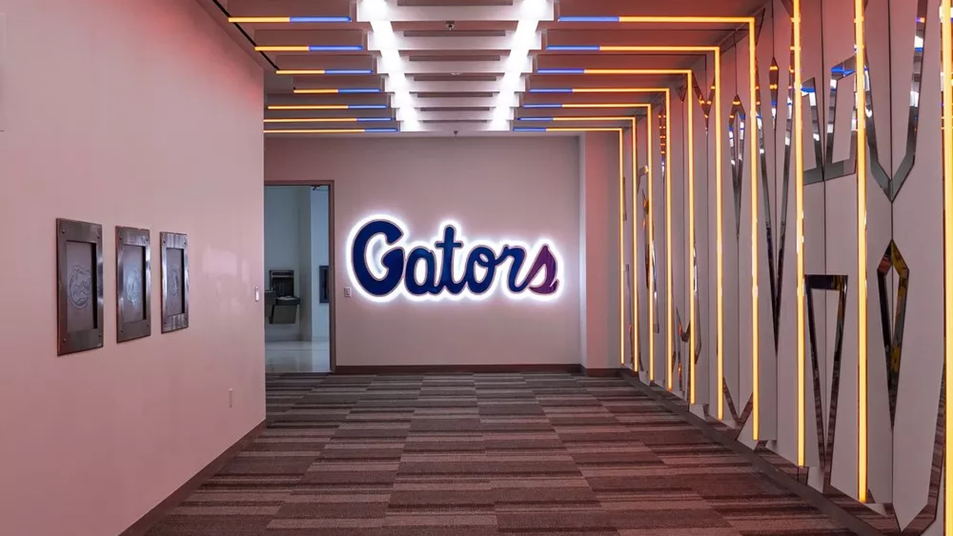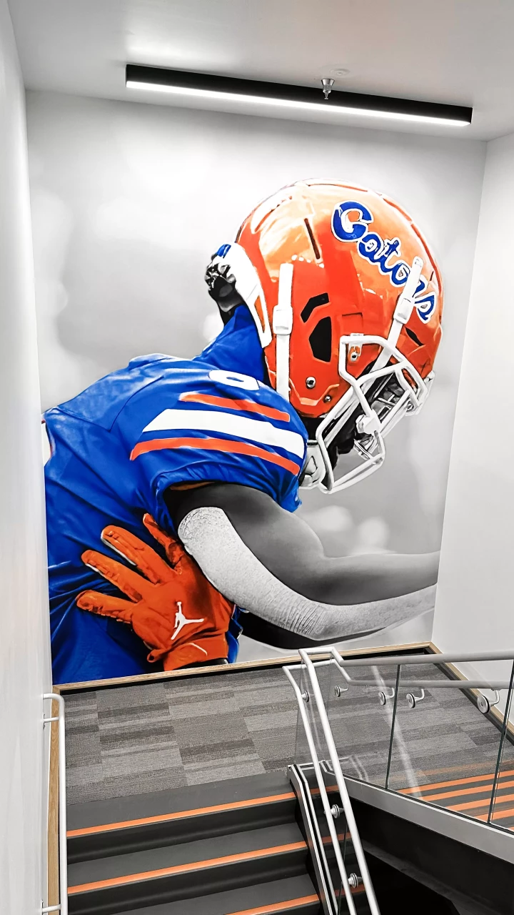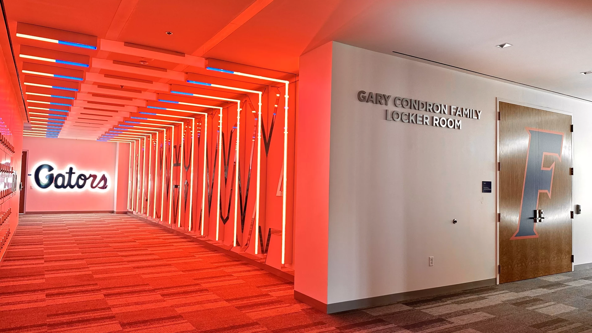 Florida Football built a new football operations facility in 2022 and contracted Forty Nine Degrees to help brand the entire 140,000 sq.ft. facility. The training center features a prominent entrance to capture the attention of recruits, athletes and fans. It also includes a new locker room, nutrition center, weight room, indoor practice facility, offices and meeting rooms. Branding was kept clean and modern throughout the facility. A cool feature added to the players route to their locker room was an orange and blue light-up tunnel adding a fun photo/video opt.