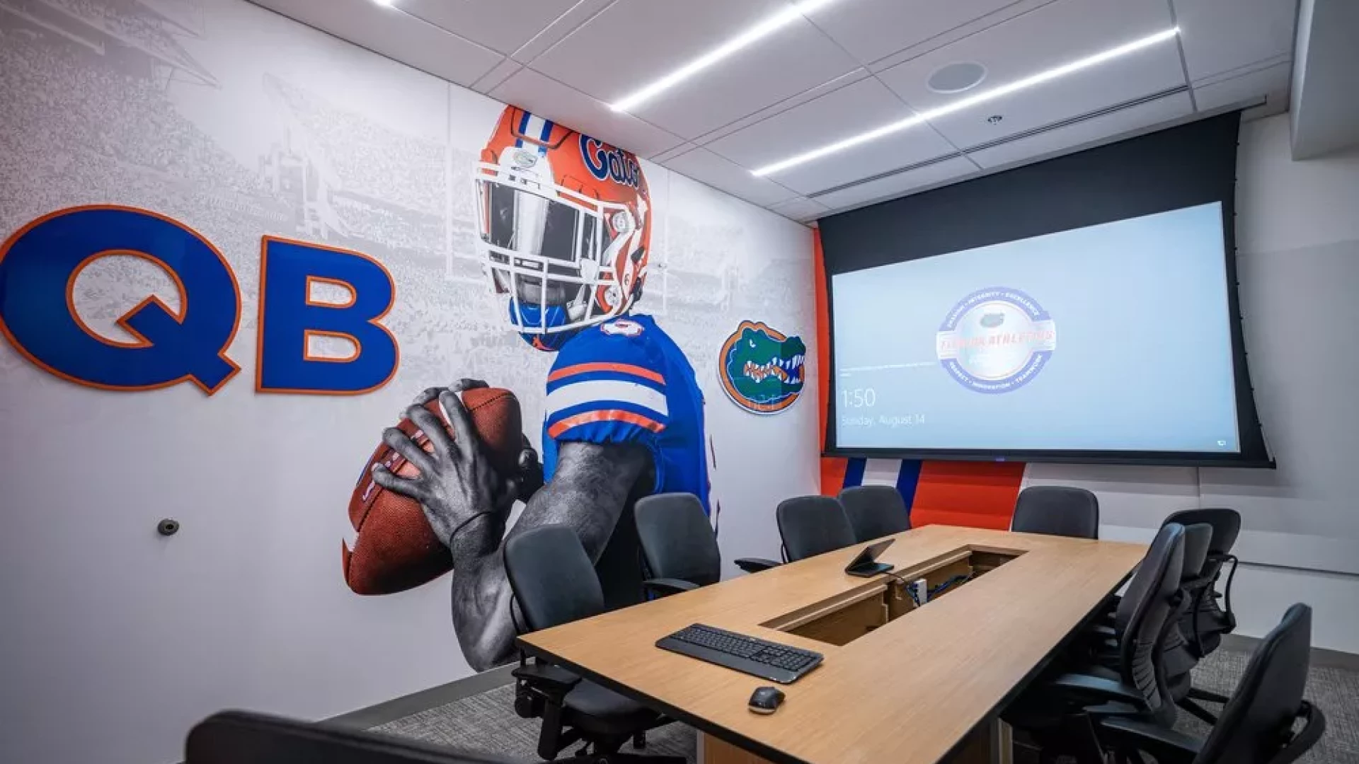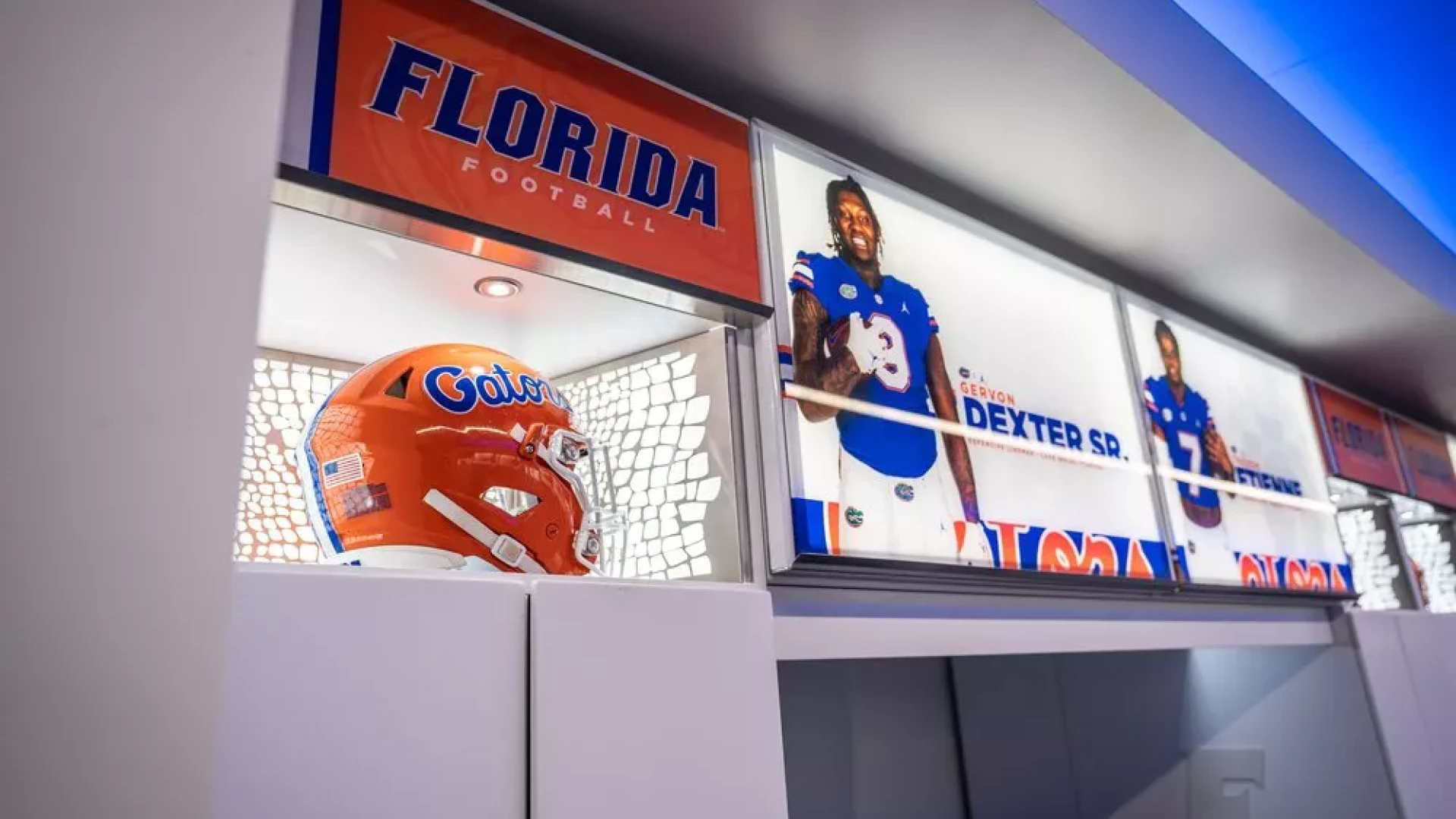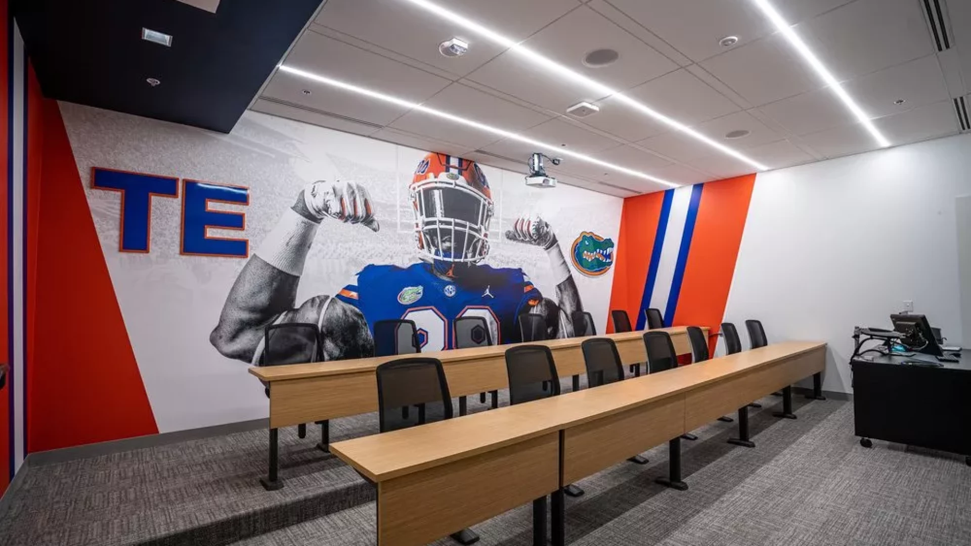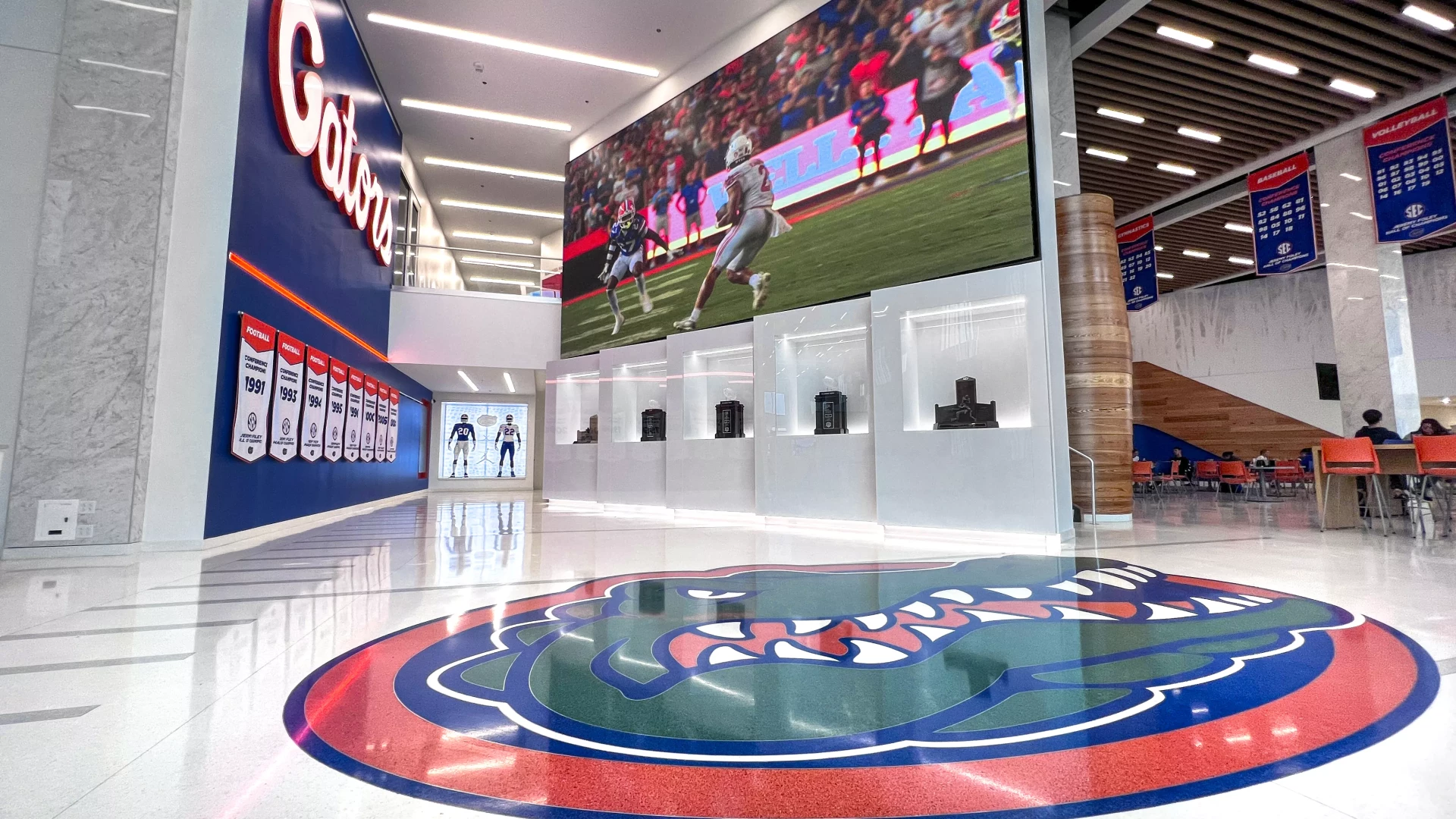 Florida Football built a new football operations facility in 2022 and contracted Forty Nine Degrees to help brand the entire 140,000 sq.ft. facility. The training center features a prominent entrance to capture the attention of recruits, athletes and fans. It also includes a new locker room, nutrition center, weight room, indoor practice facility, offices and meeting rooms. Branding was kept clean and modern throughout the facility. A cool feature added to the players route to their locker room was an orange and blue light-up tunnel adding a fun photo/video opt.
