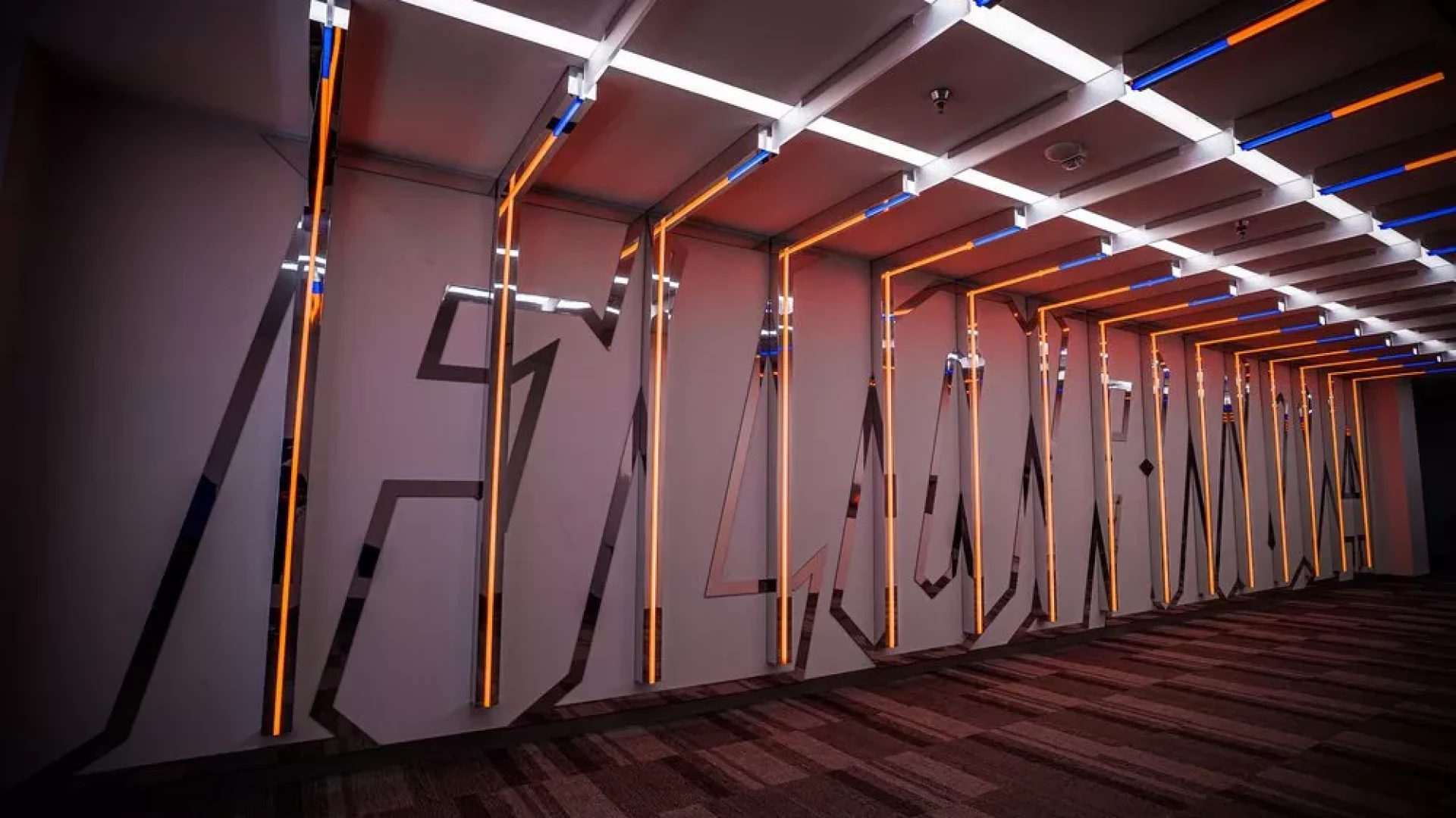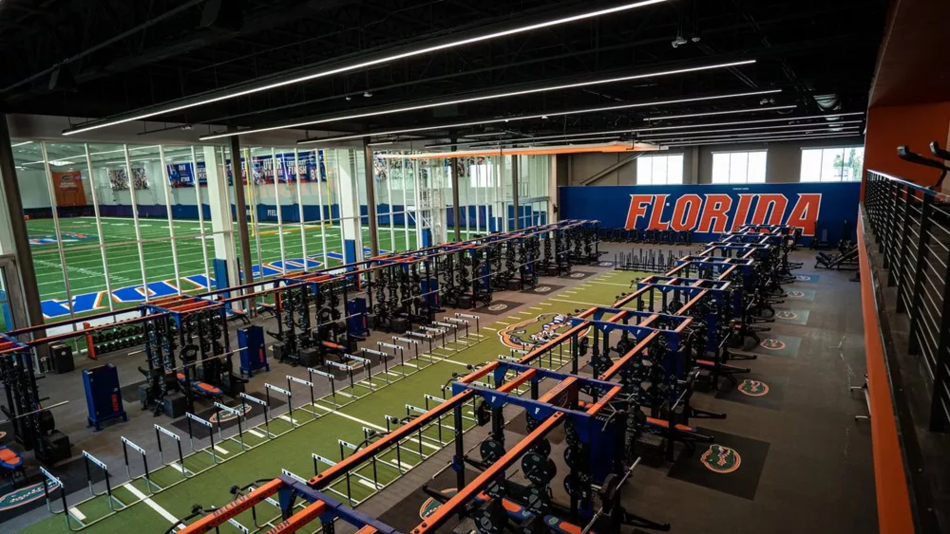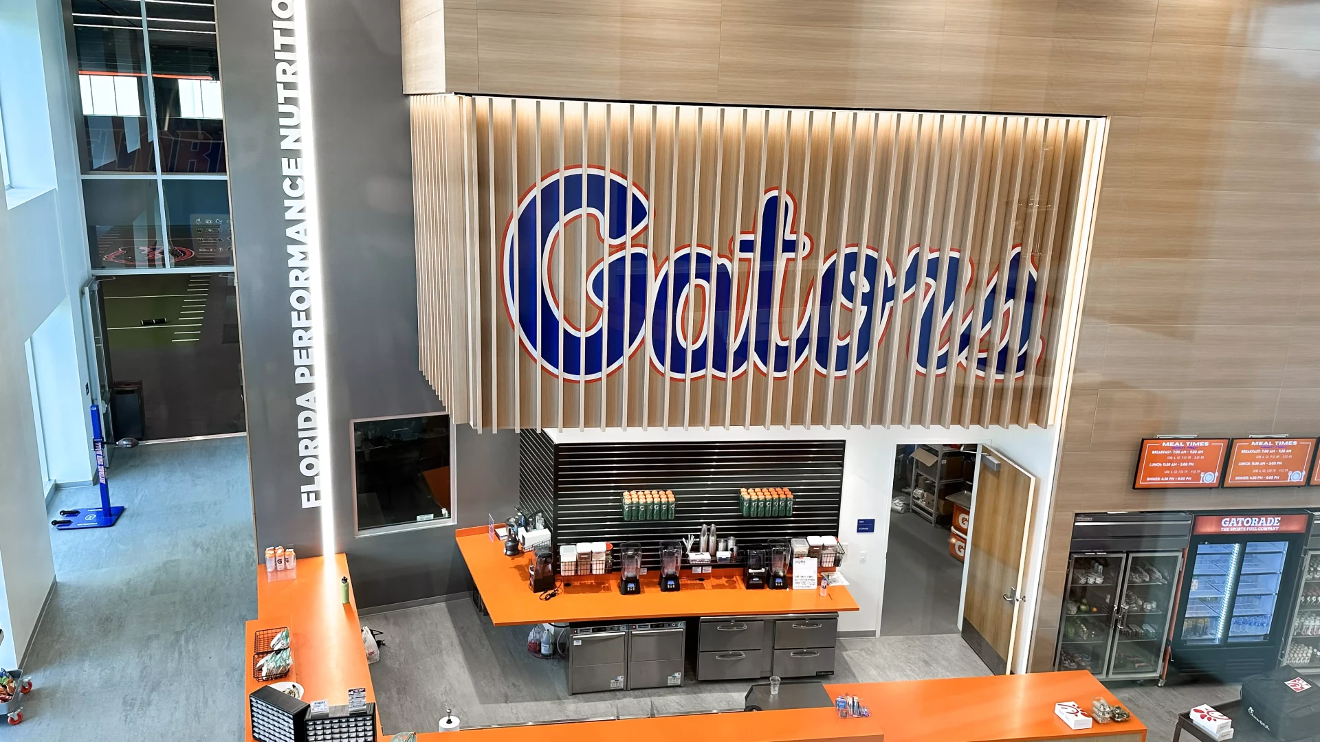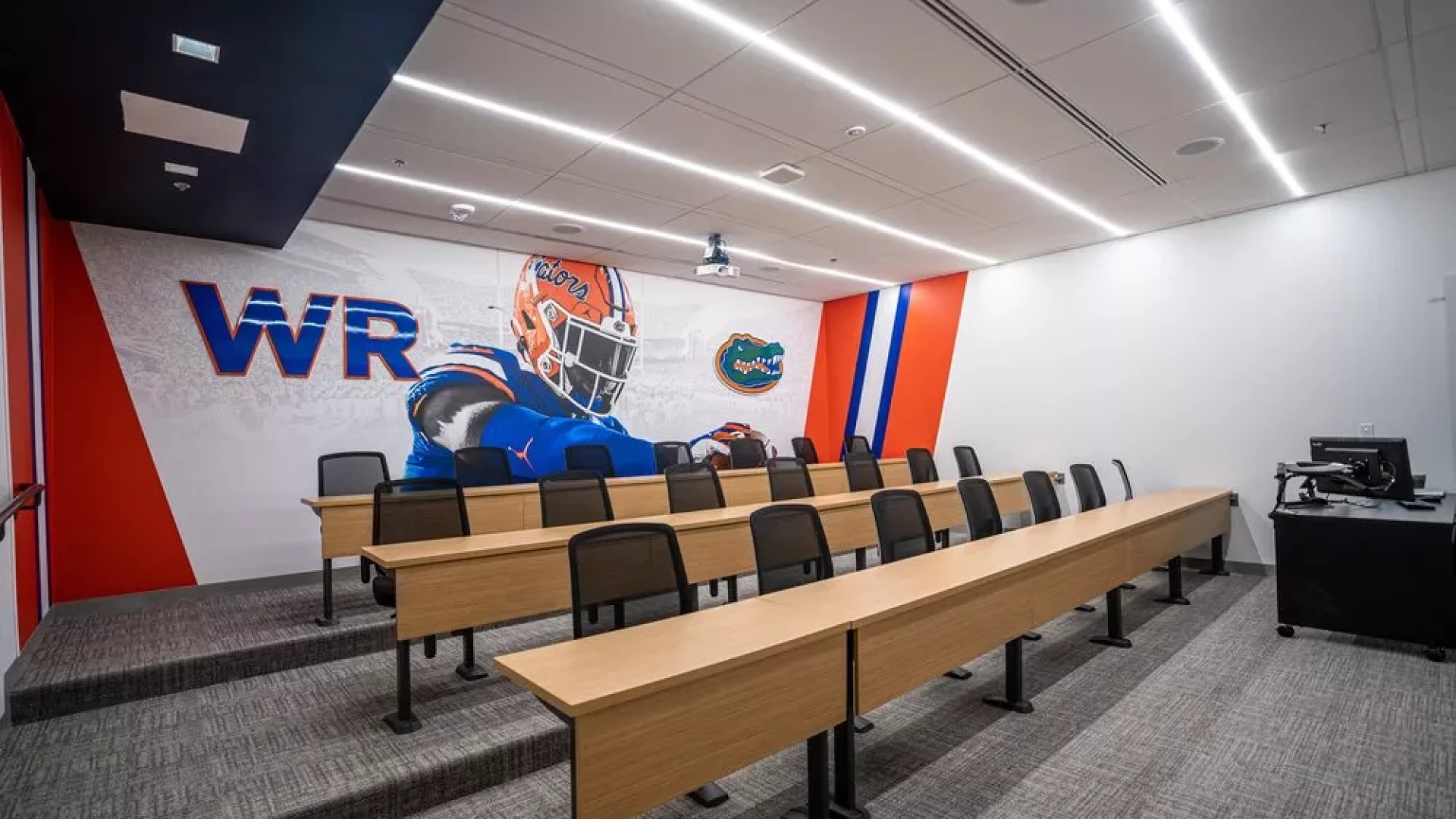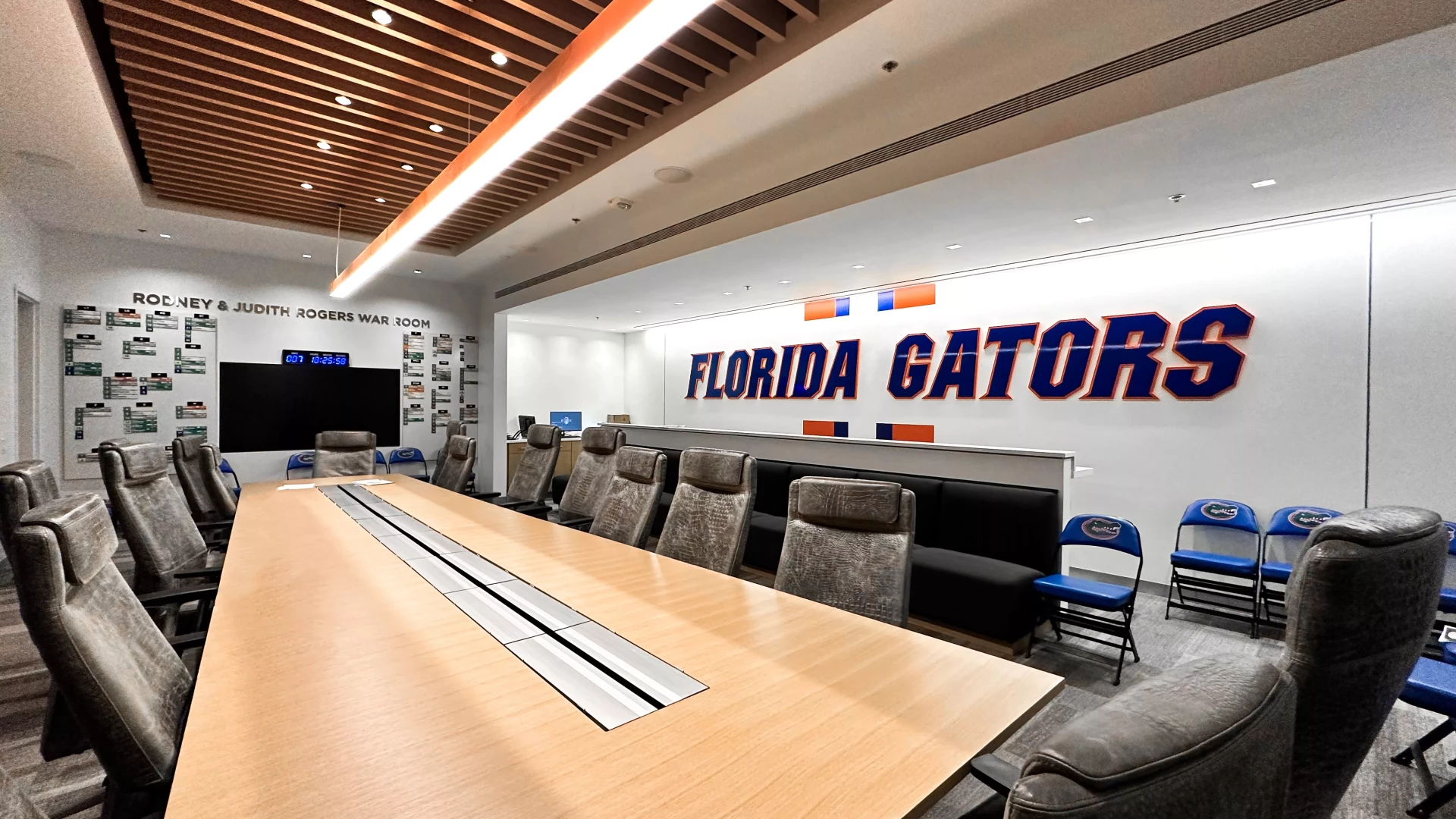 Florida Football built a new football operations facility in 2022 and contracted Forty Nine Degrees to help brand the entire 140,000 sq.ft. facility. The training center features a prominent entrance to capture the attention of recruits, athletes and fans. It also includes a new locker room, nutrition center, weight room, indoor practice facility, offices and meeting rooms. Branding was kept clean and modern throughout the facility. A cool feature added to the players route to their locker room was an orange and blue light-up tunnel adding a fun photo/video opt.