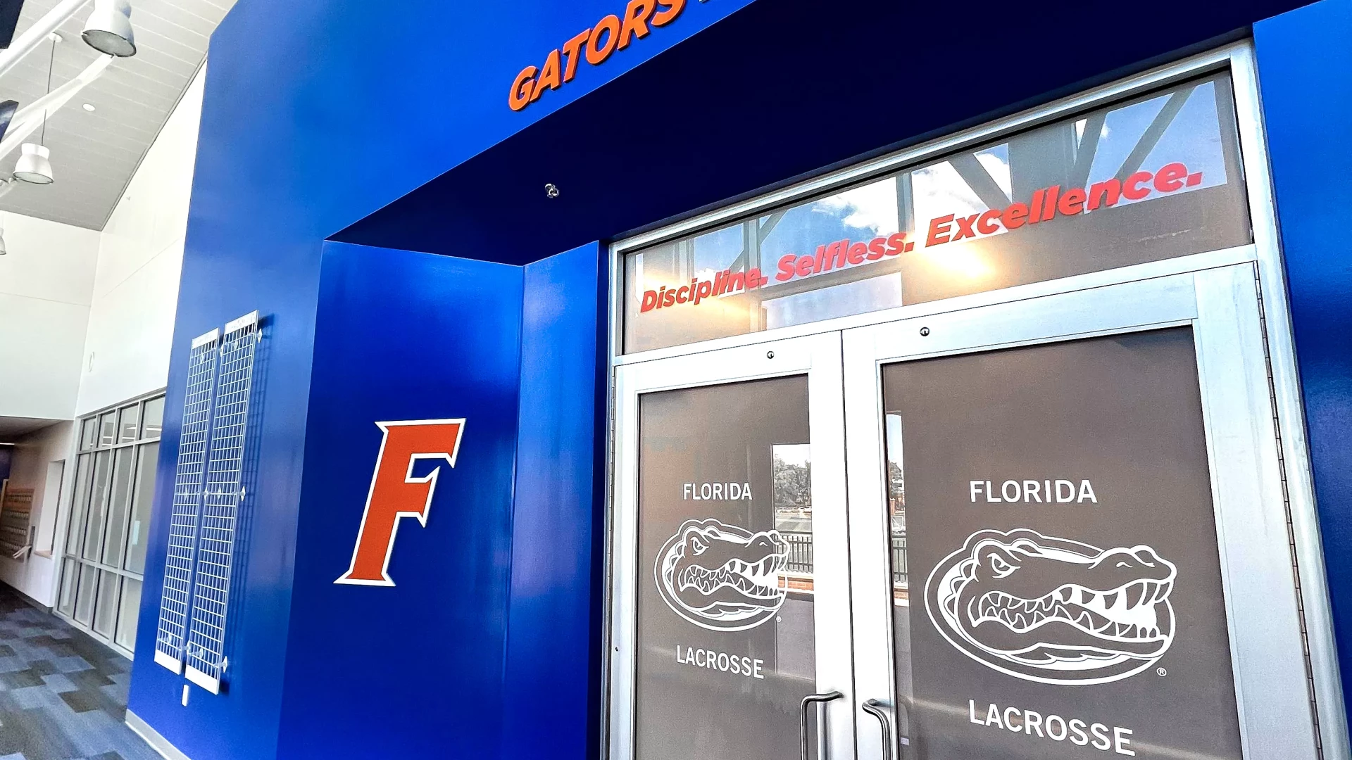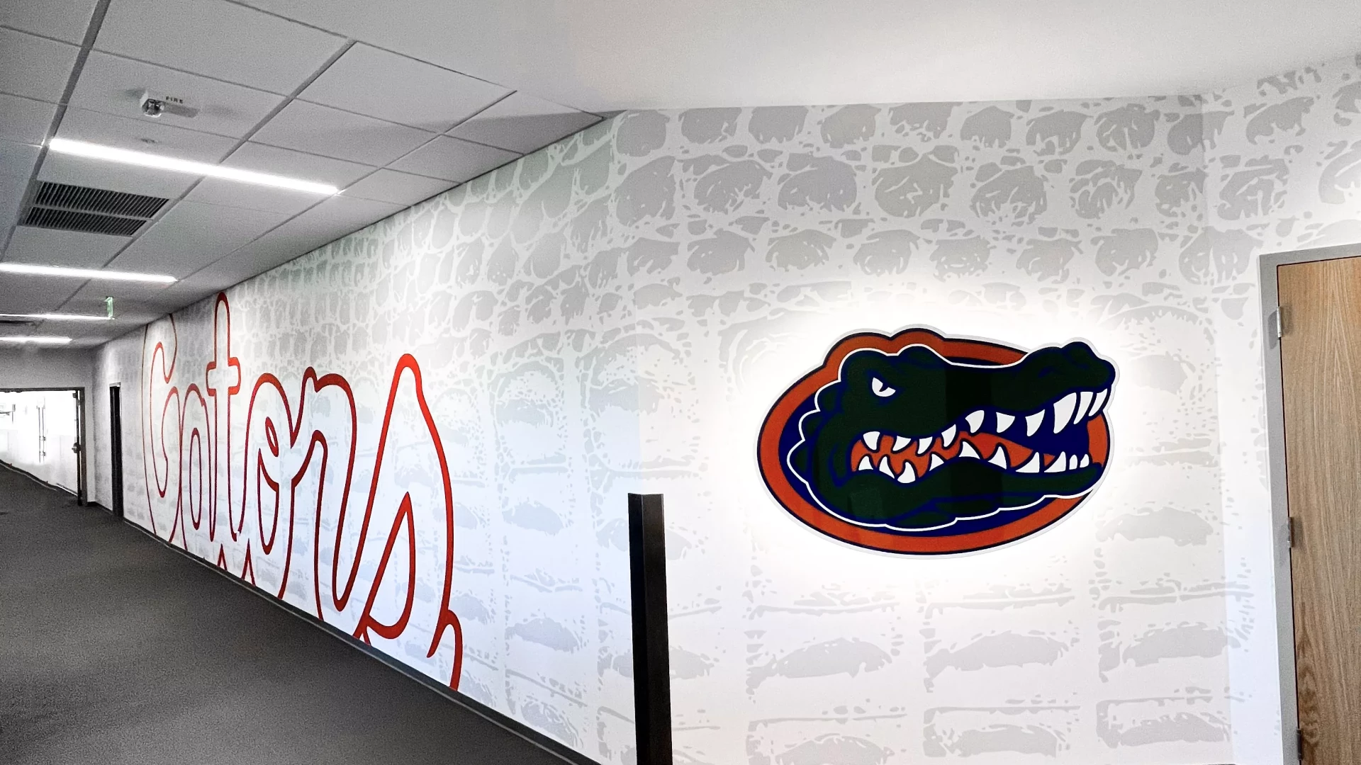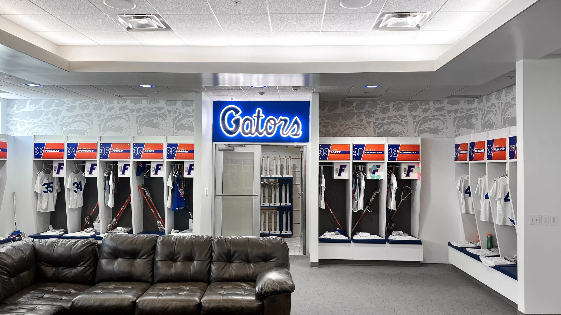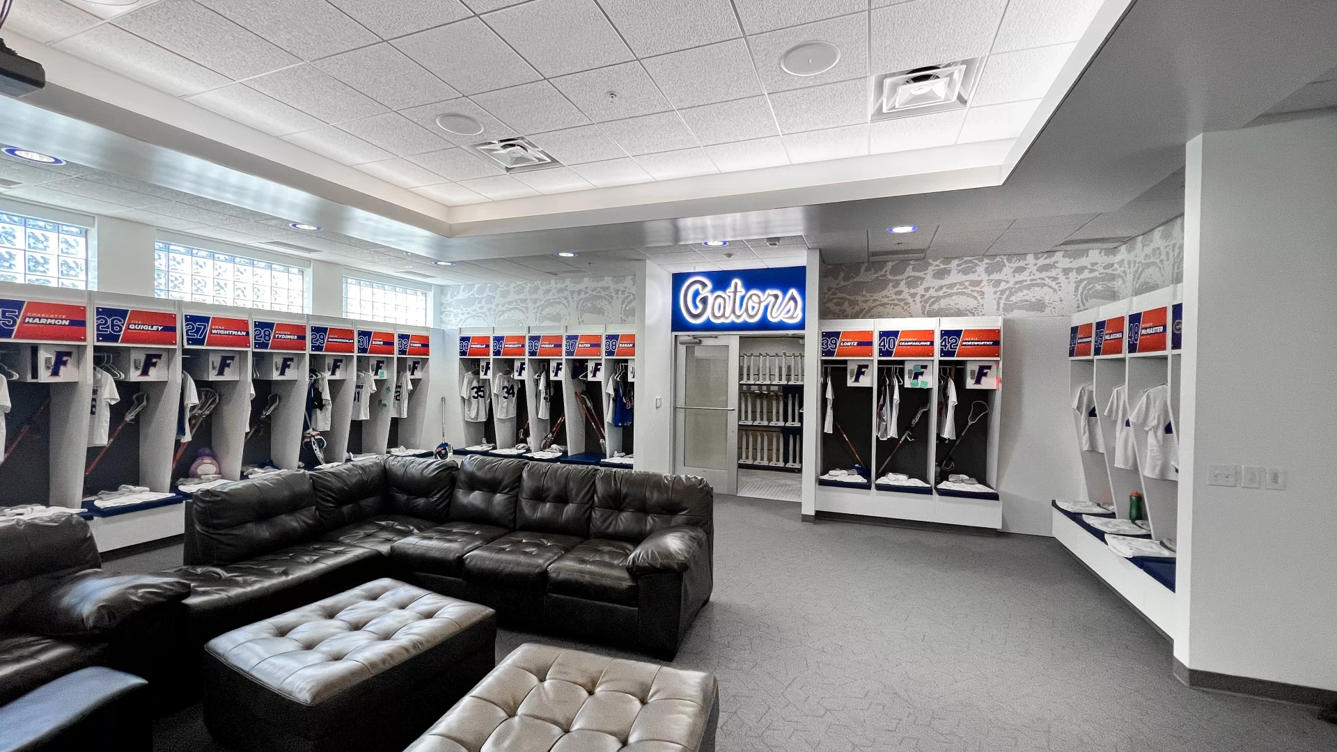 The Donald Dizney Team Building at Florida got a revamp. High vaulted ceilings with clean branding and dynamic lighting solutions meets you as you enter the space. From there, soccer and lacrosse both have their separate corridors containing offices, locker rooms, lounges, dining areas, team rooms and more. In addition to other branding elements added to this space, the gator scale and palm tree wall graphics are used throughout the facility. These branding elements were designed for Florida as an athletic-wide facility asset to help cohesively connect the various facility branding efforts.