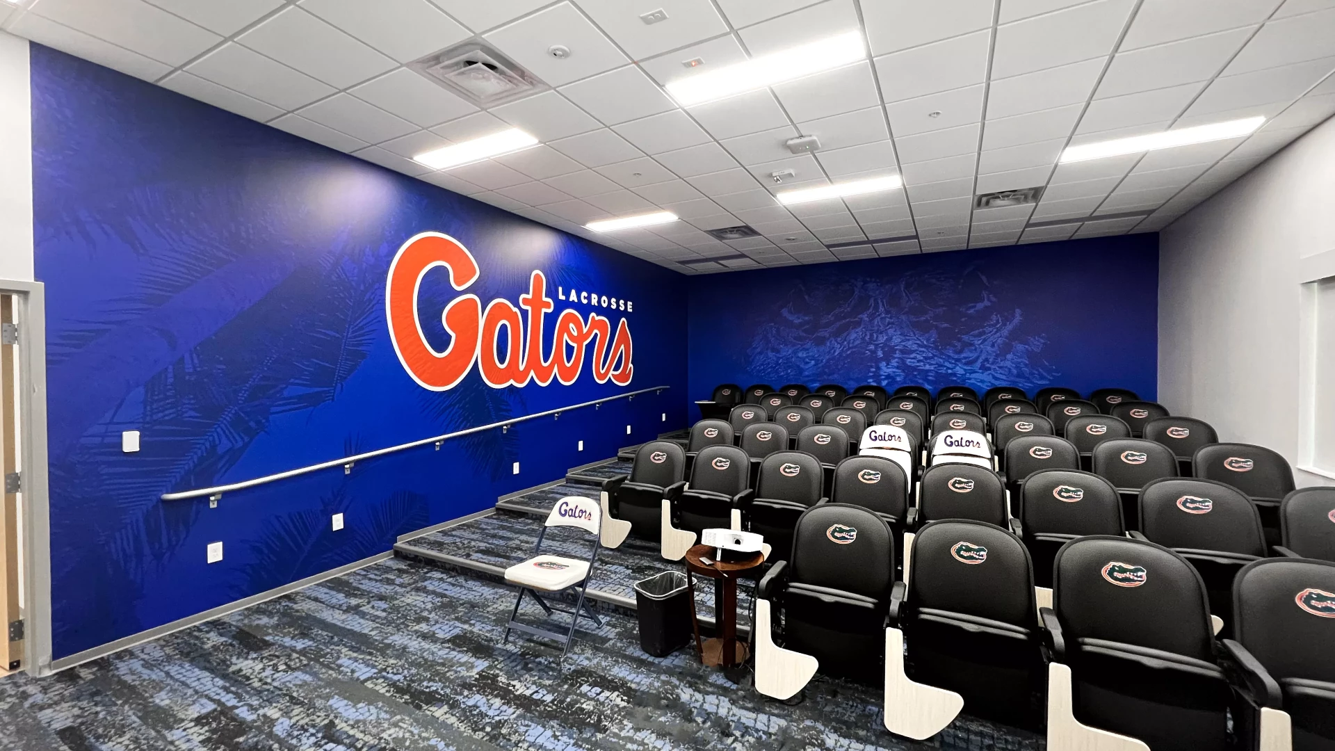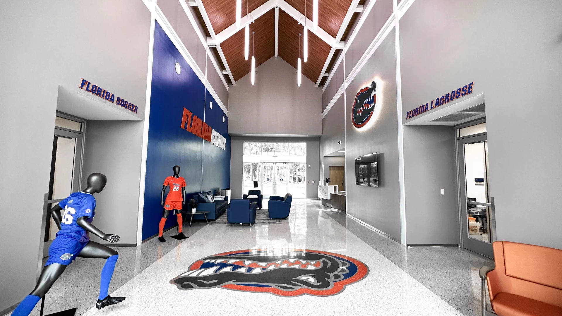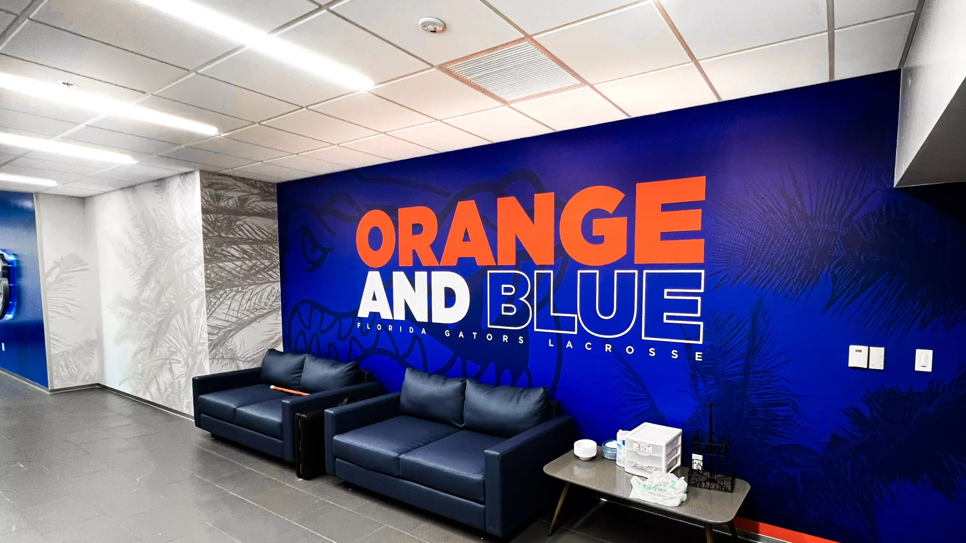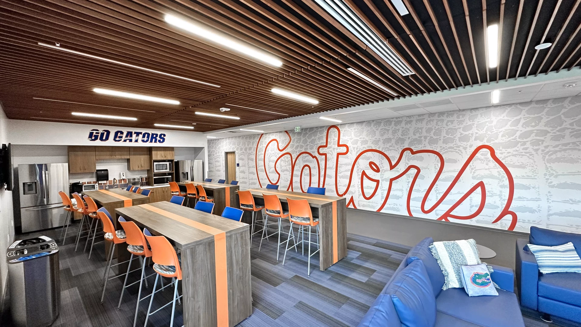 The Donald Dizney Team Building at Florida got a revamp. High vaulted ceilings with clean branding and dynamic lighting solutions meets you as you enter the space. From there, soccer and lacrosse both have their separate corridors containing offices, locker rooms, lounges, dining areas, team rooms and more. In addition to other branding elements added to this space, the gator scale and palm tree wall graphics are used throughout the facility. These branding elements were designed for Florida as an athletic-wide facility asset to help cohesively connect the various facility branding efforts.