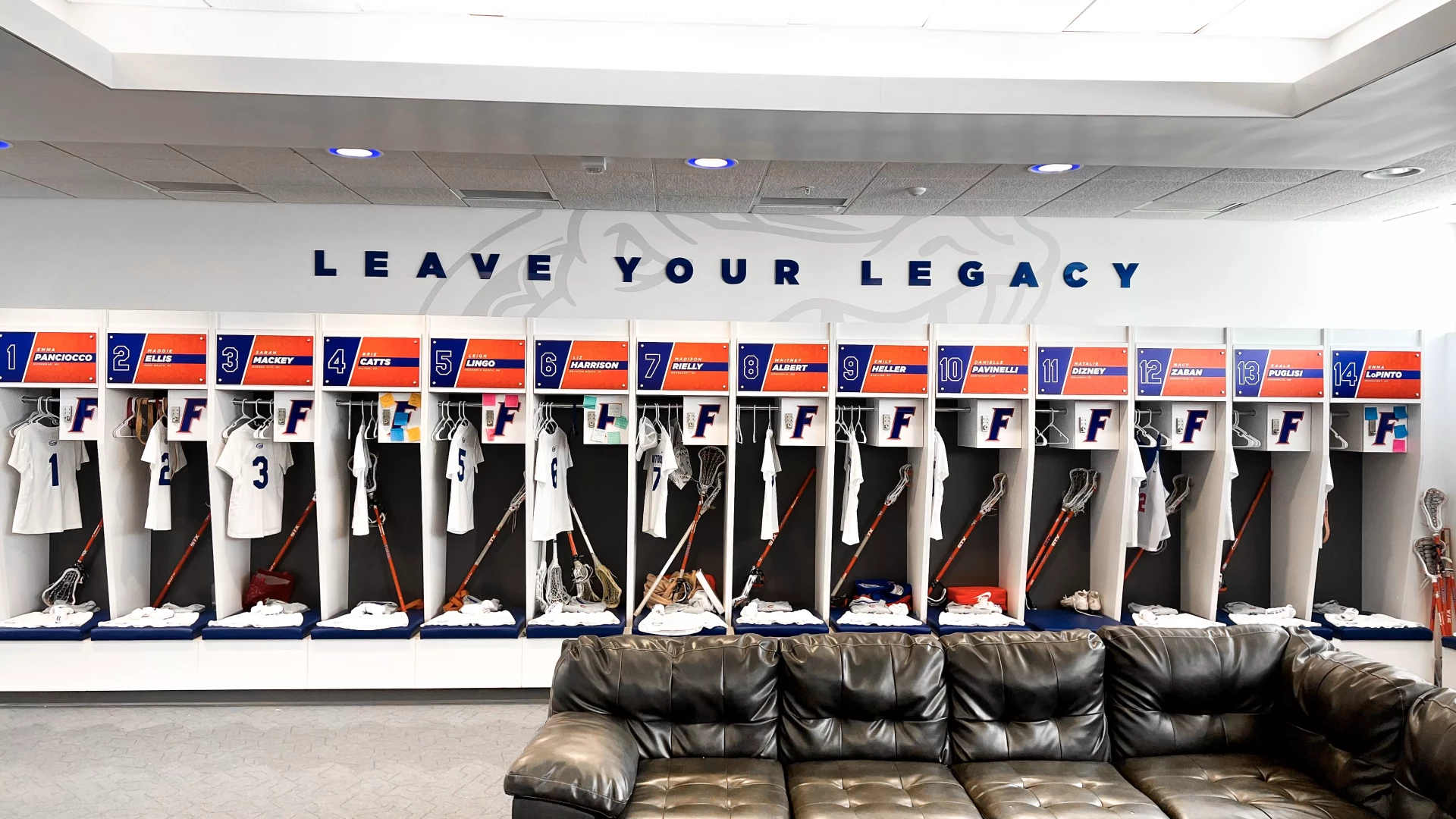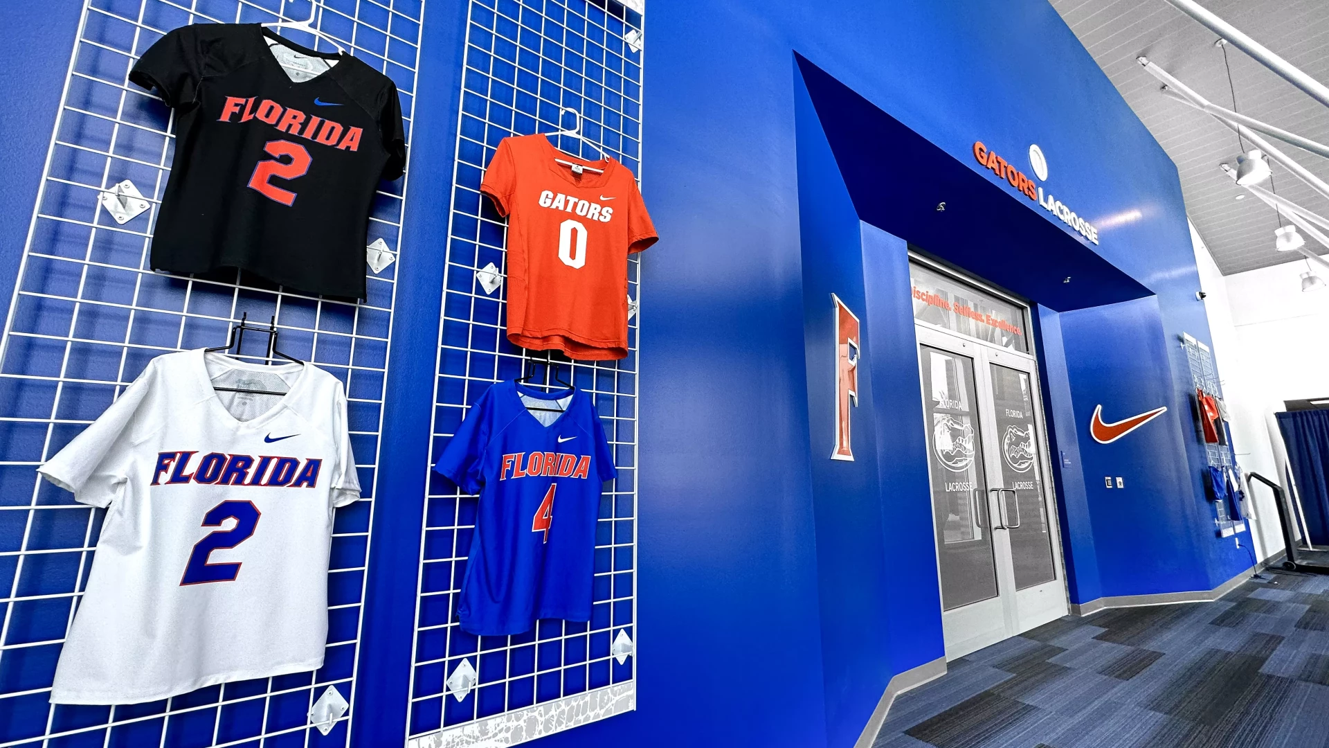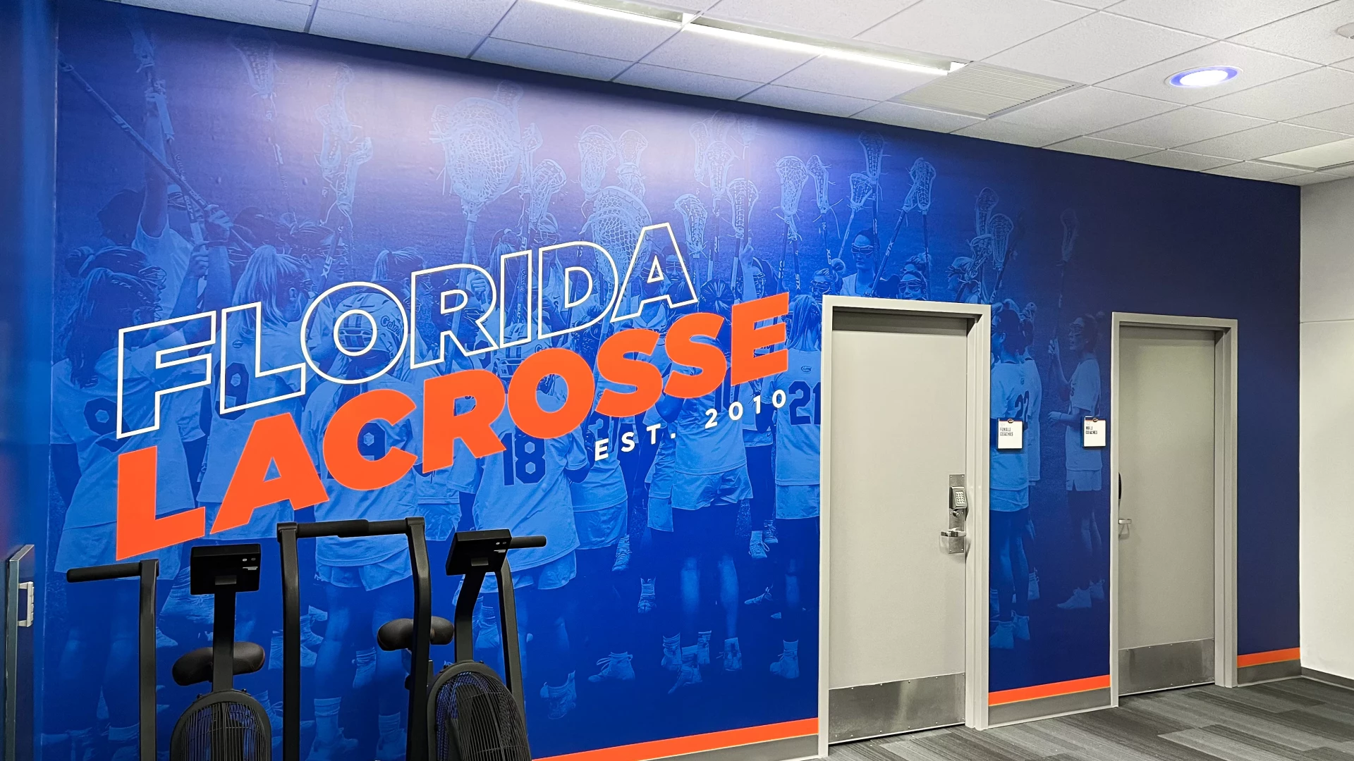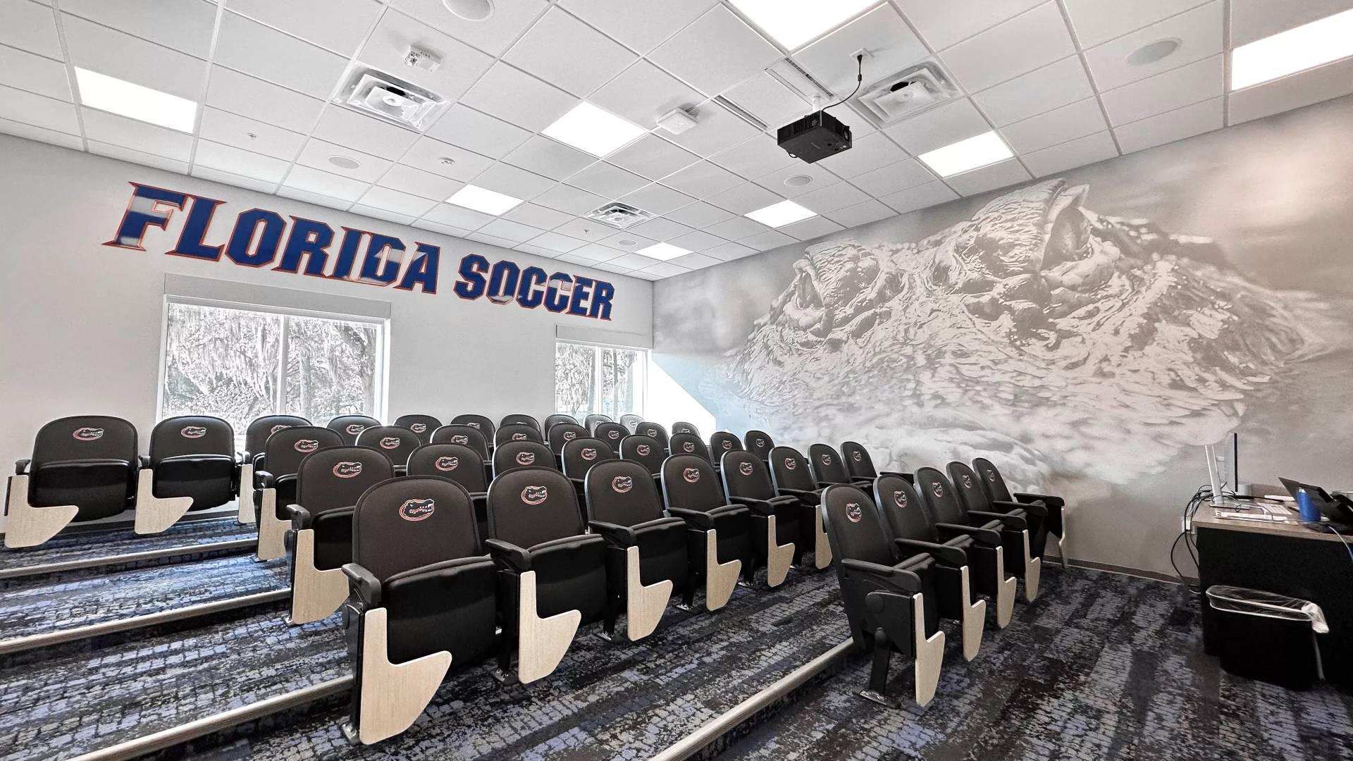 The Donald Dizney Team Building at Florida got a revamp. High vaulted ceilings with clean branding and dynamic lighting solutions meets you as you enter the space. From there, soccer and lacrosse both have their separate corridors containing offices, locker rooms, lounges, dining areas, team rooms and more. In addition to other branding elements added to this space, the gator scale and palm tree wall graphics are used throughout the facility. These branding elements were designed for Florida as an athletic-wide facility asset to help cohesively connect the various facility branding efforts.