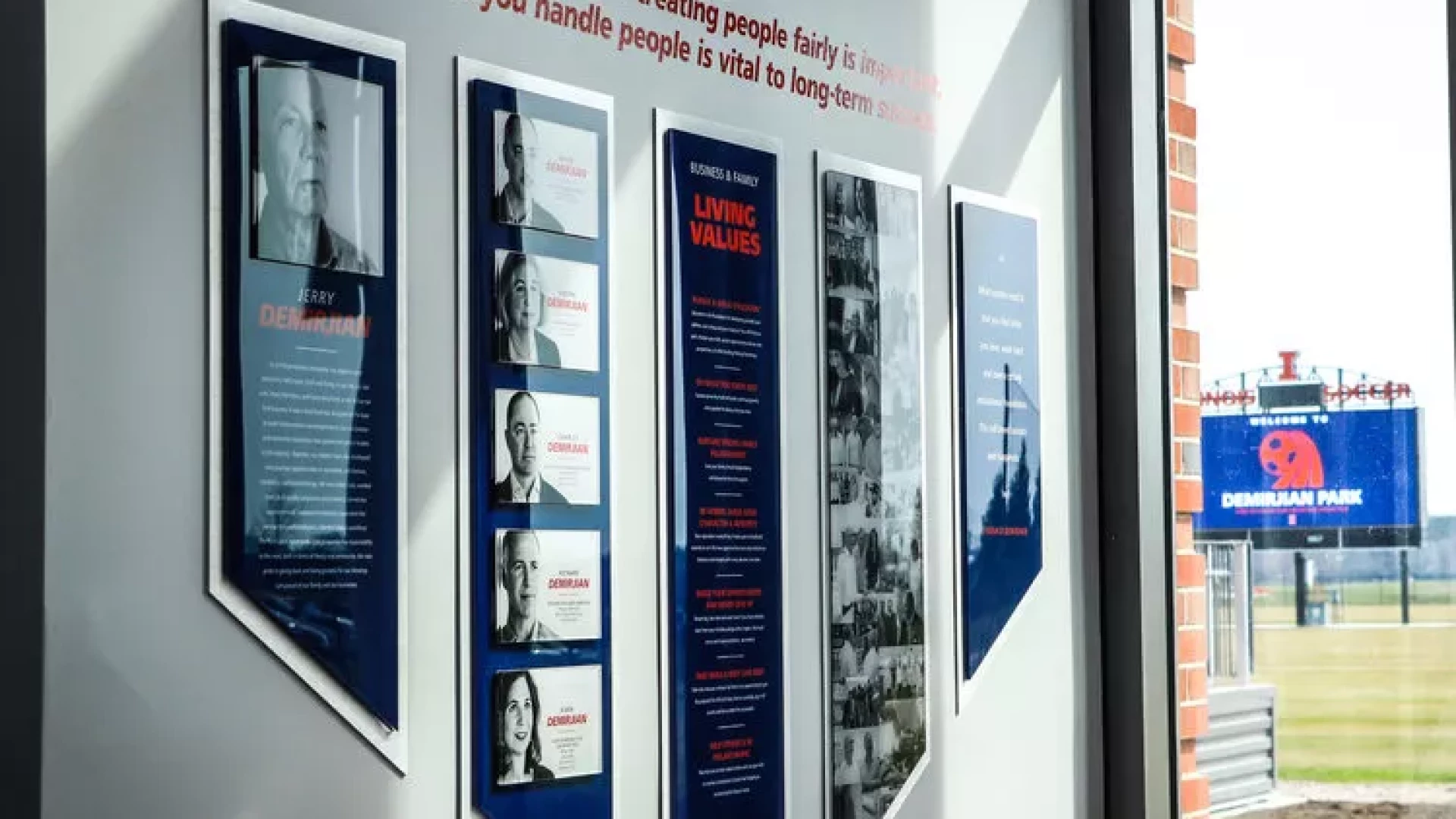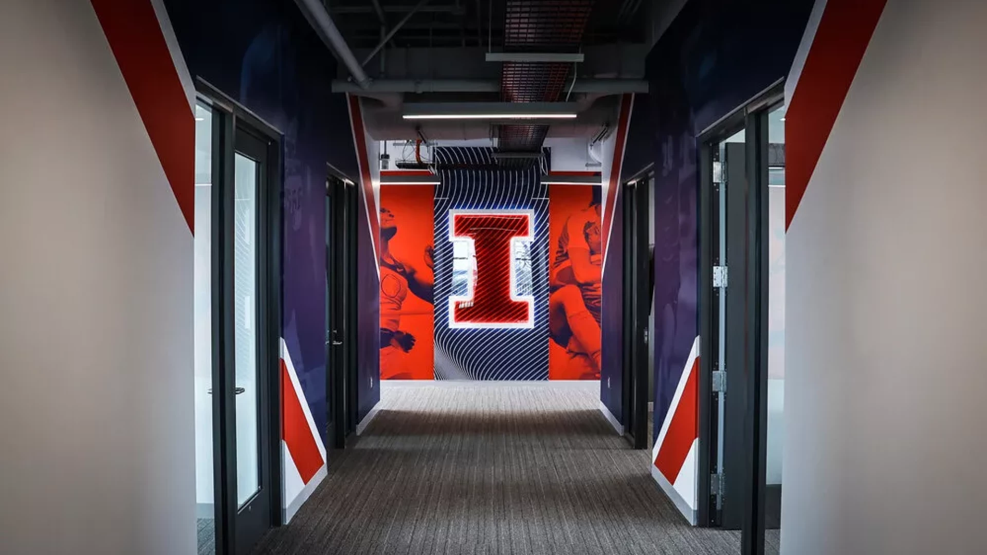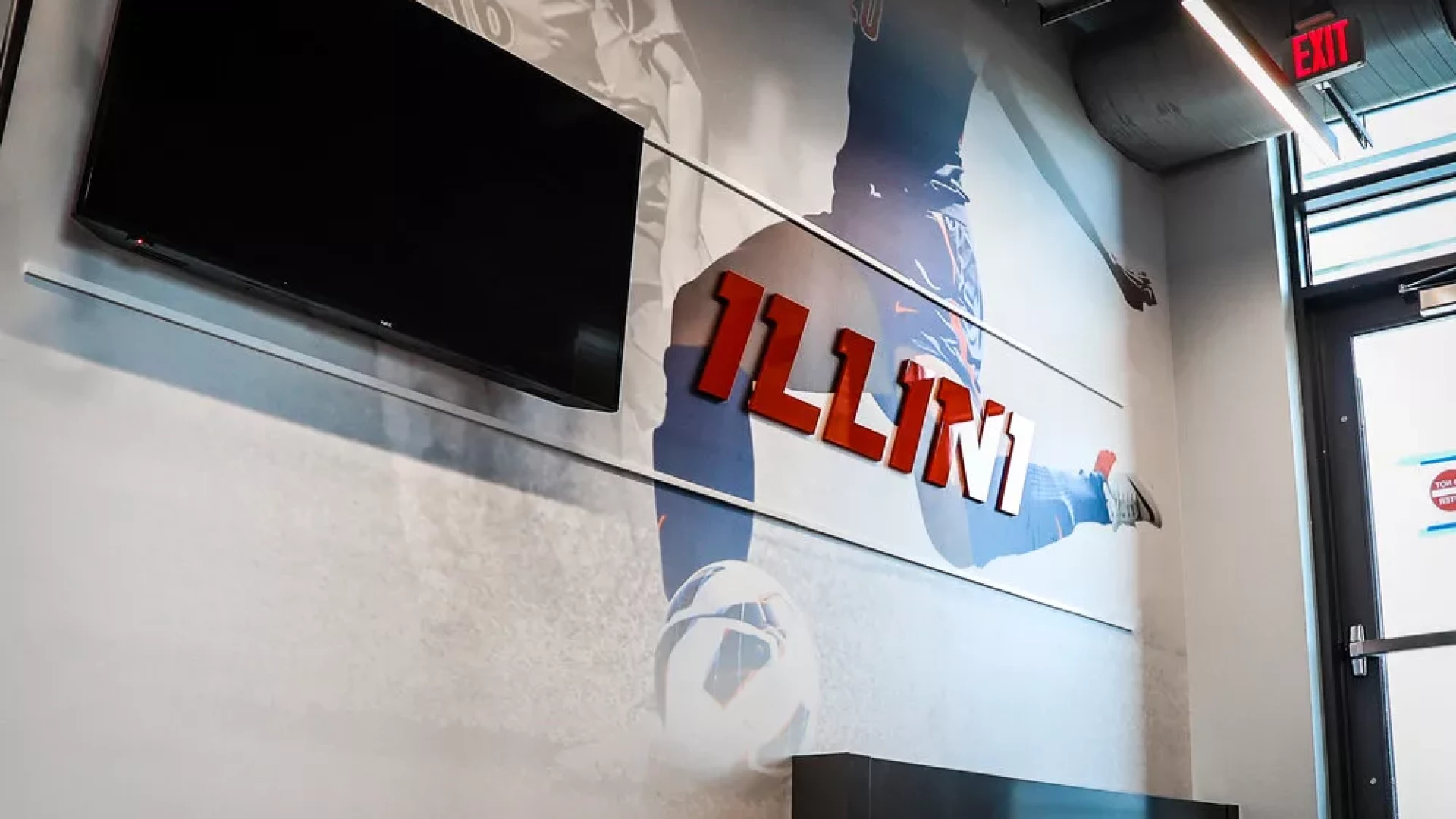 Demirjian Park, home of the Illinois soccer and track and field programs, opened in early 2021. This state-of-the-art facility, added a fresh modern branding expression to the indoor team spaces. Utilizing illuminated solutions to make a bold impression in the main hallway that leads to the administrative offices and team lounge.