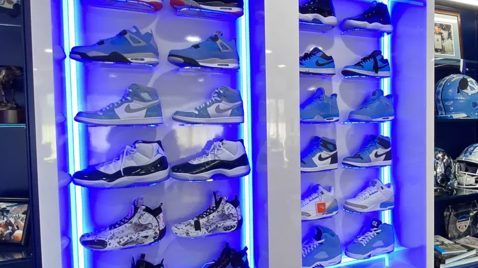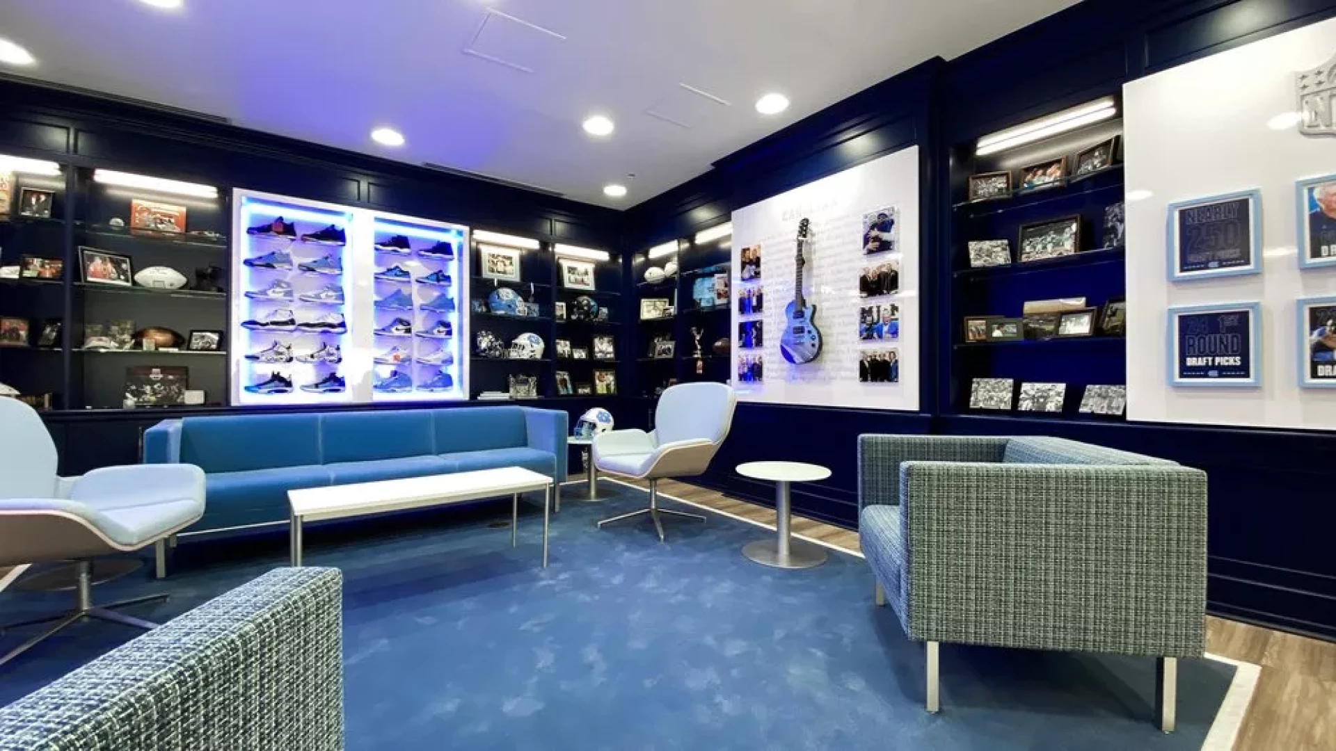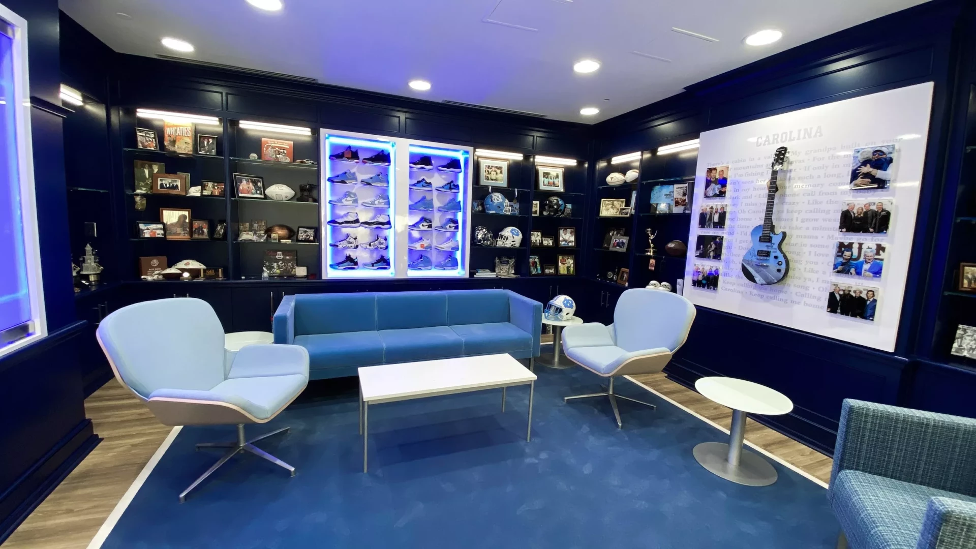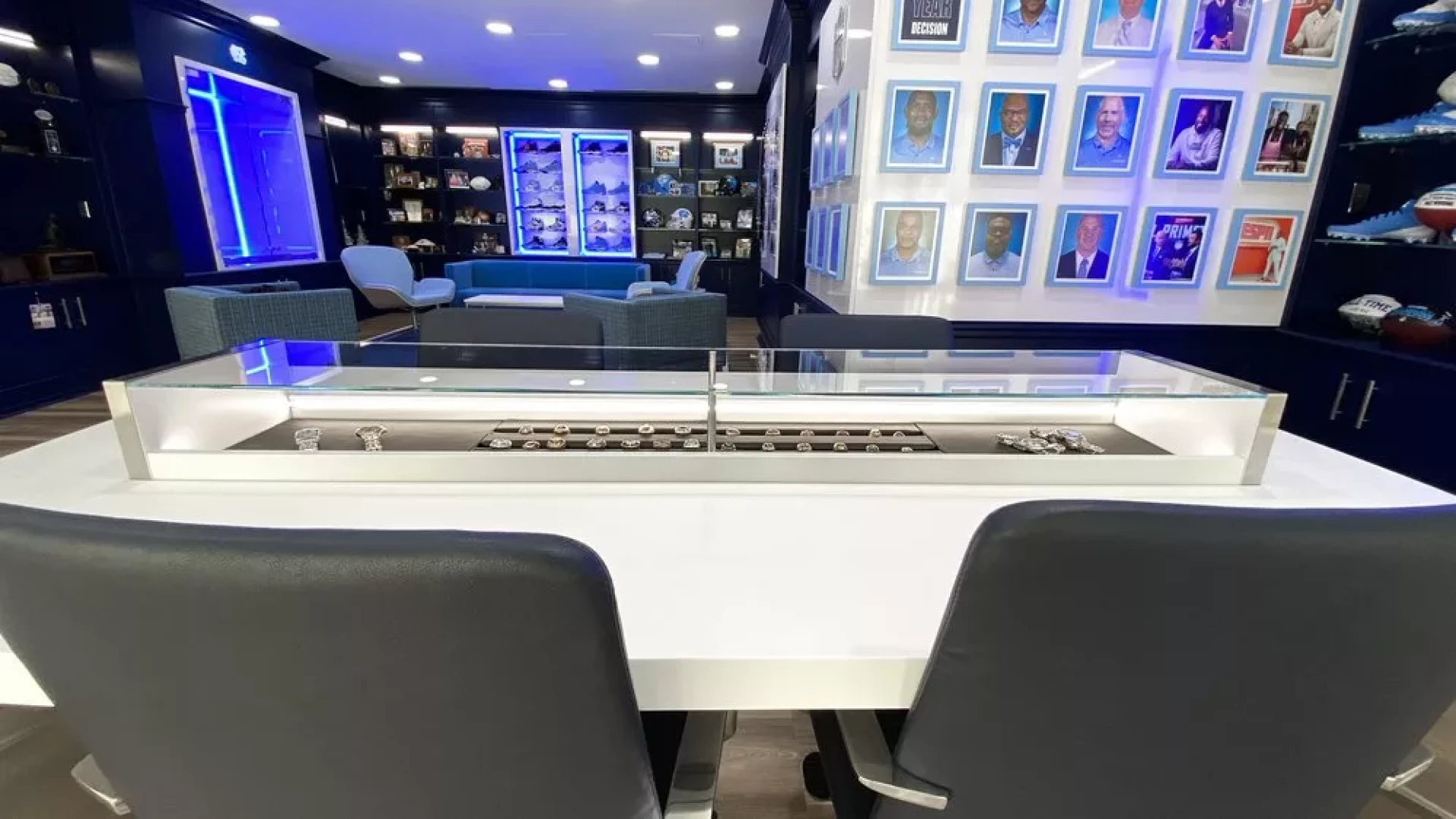 Upon Coach Mack Brown's return to North Carolina, Forty Nine Degrees helped modernize his coaching suite. Designing a way to showcase his memorabilia such as a signed guitar, UNC shoes, various trophies, watches, and championship rings. LED-lined display cases were used to highlight UNC branded Air Jordan's and trophies, while a custom conference table was designed with a built-in hydraulic watch and ring display.