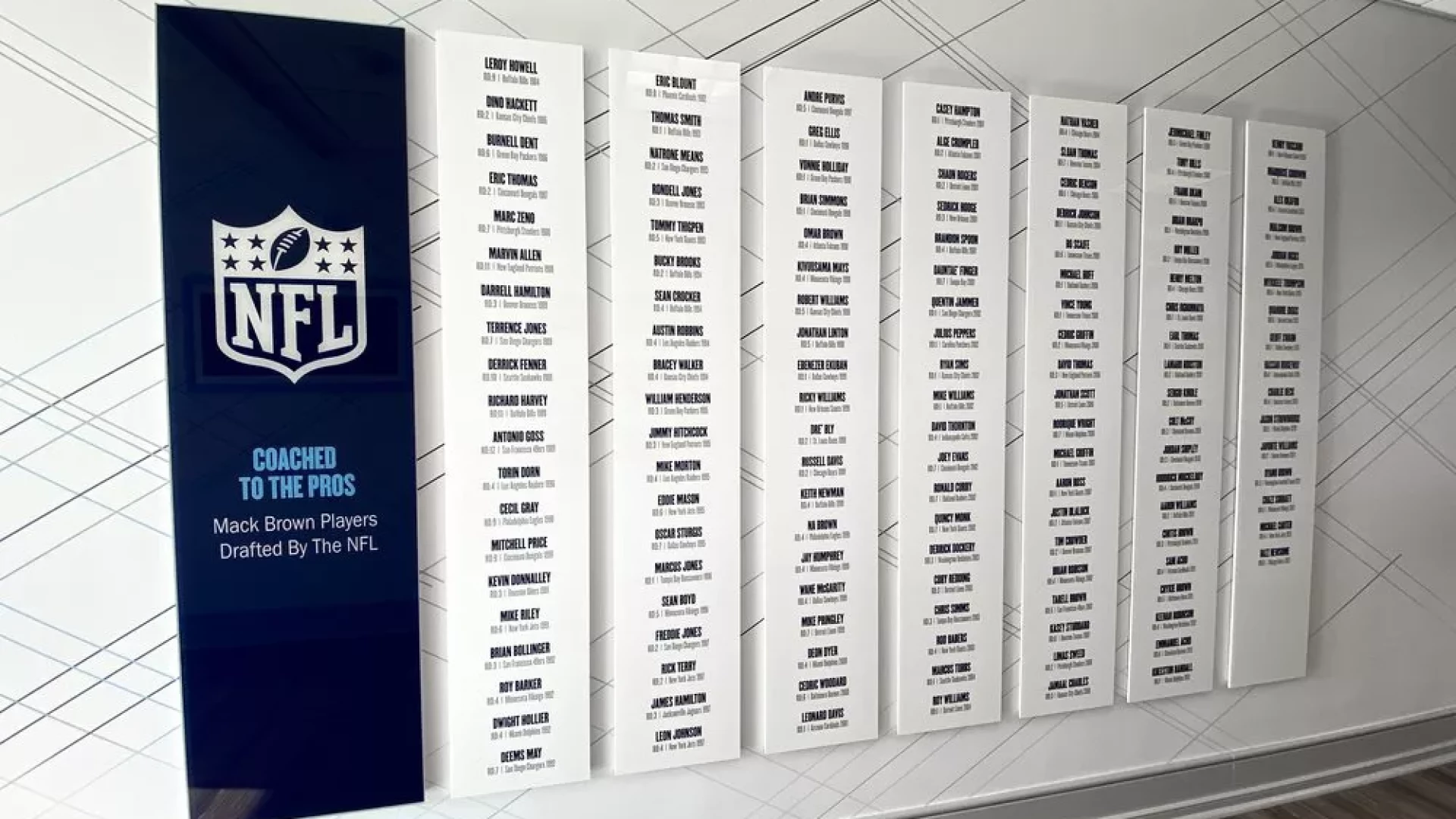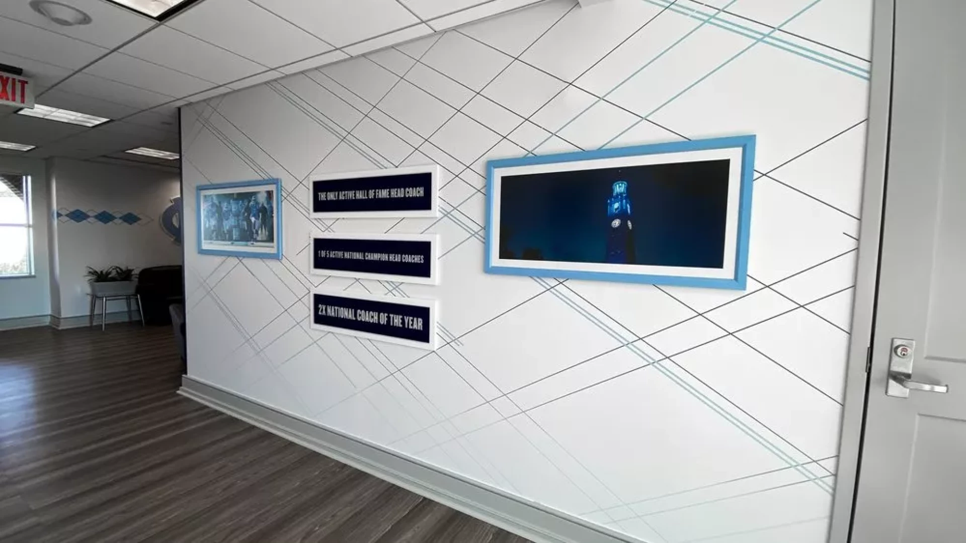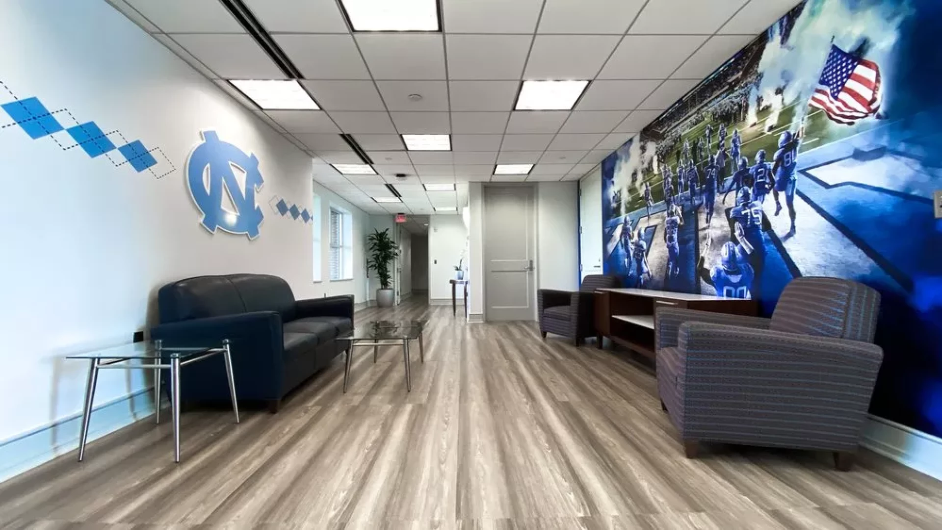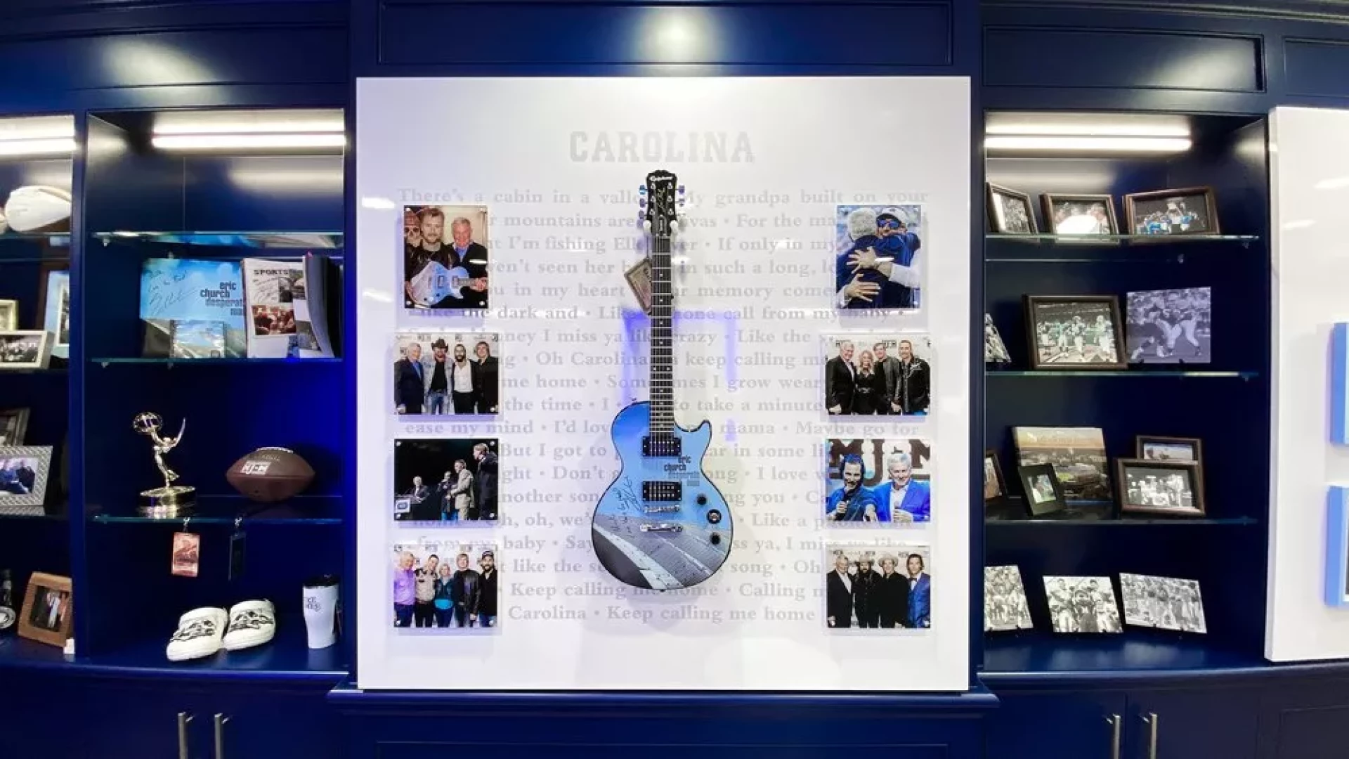 Upon Coach Mack Brown's return to North Carolina, Forty Nine Degrees helped modernize his coaching suite. Designing a way to showcase his memorabilia such as a signed guitar, UNC shoes, various trophies, watches, and championship rings. LED-lined display cases were used to highlight UNC branded Air Jordan's and trophies, while a custom conference table was designed with a built-in hydraulic watch and ring display.