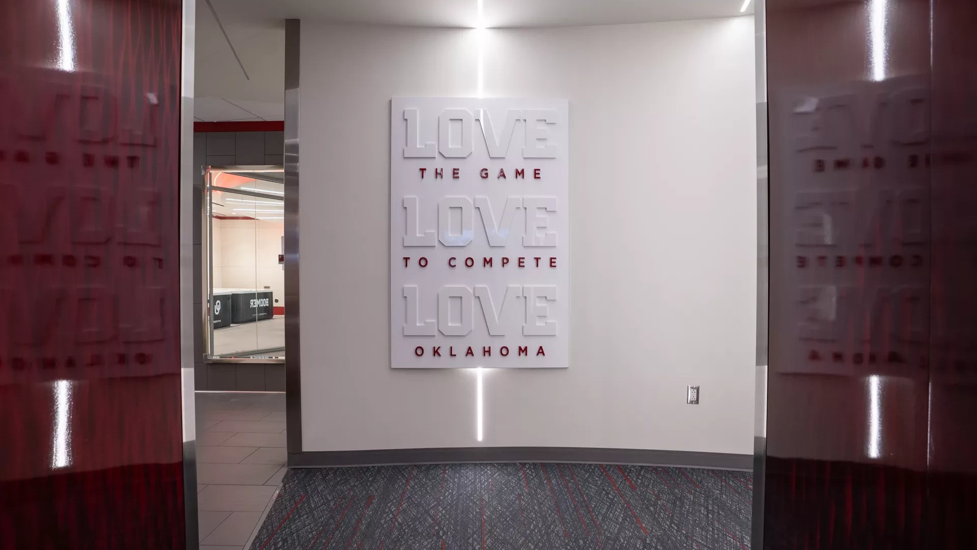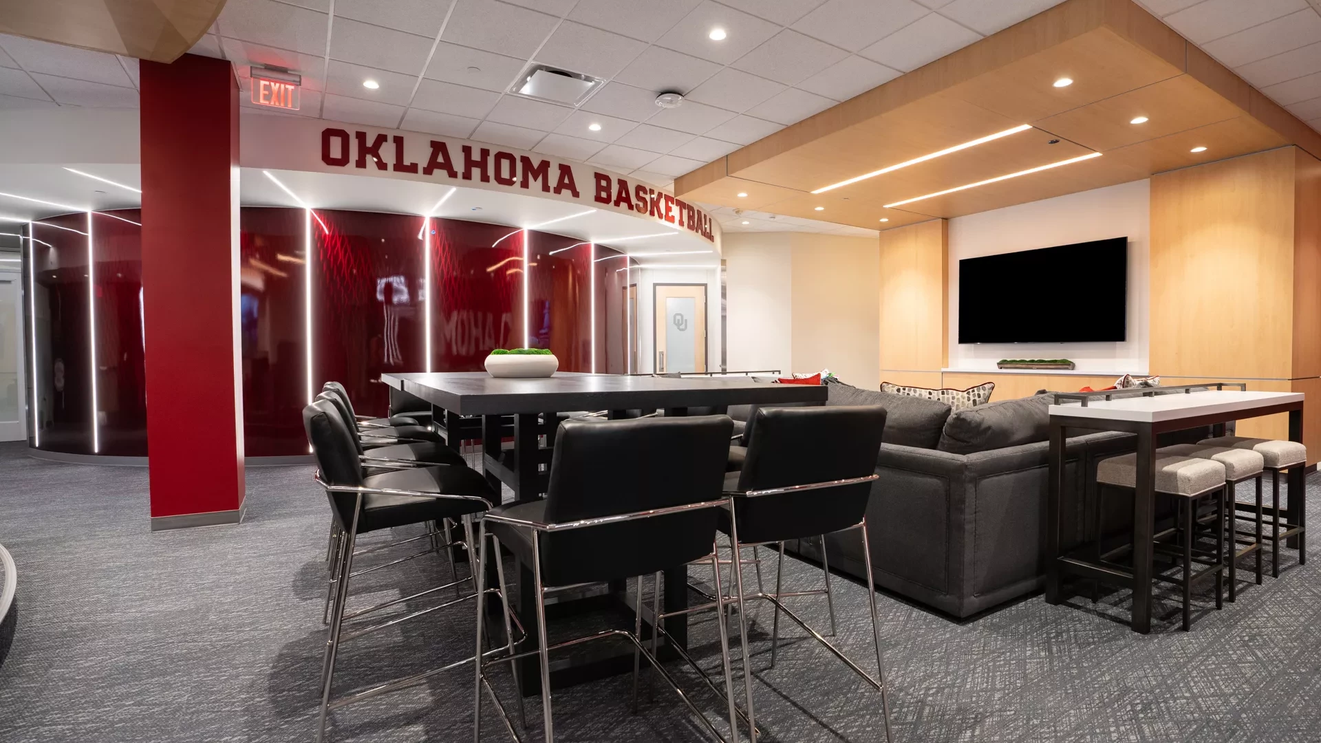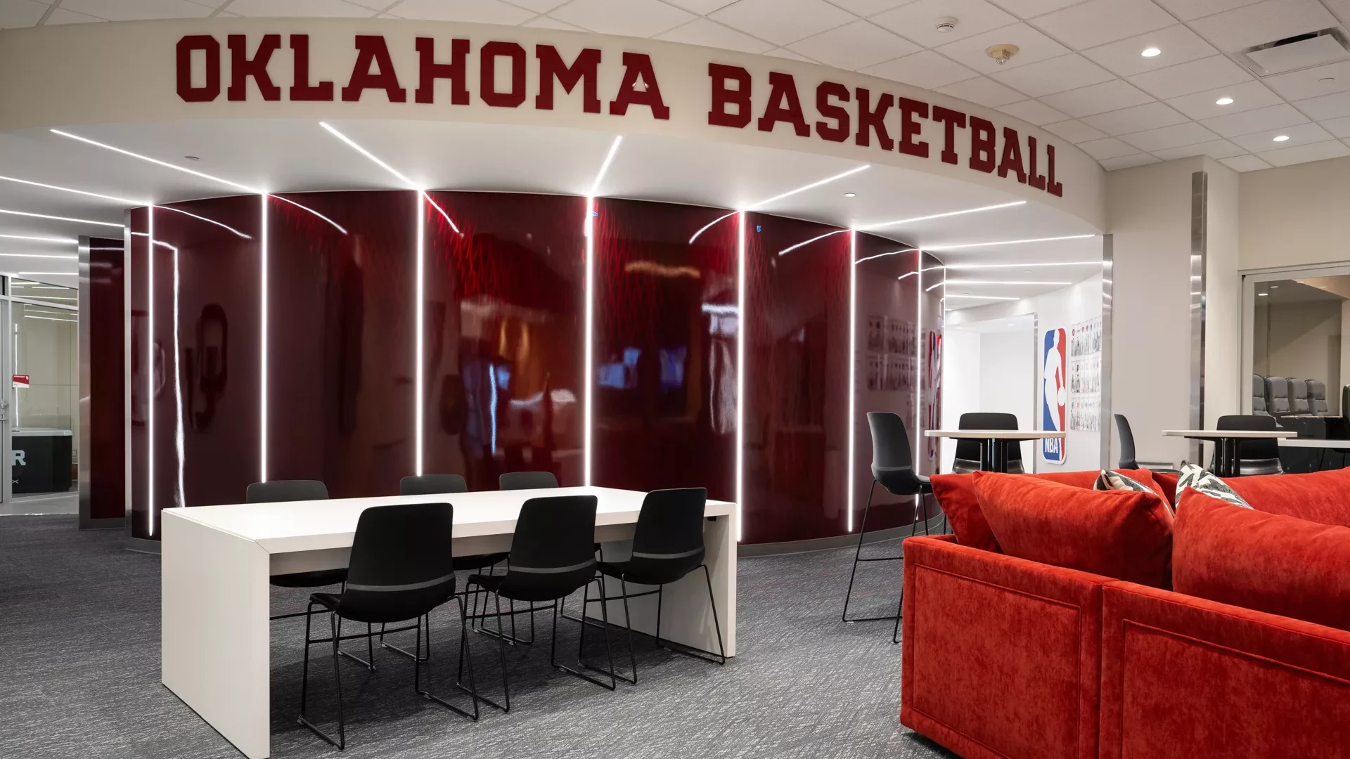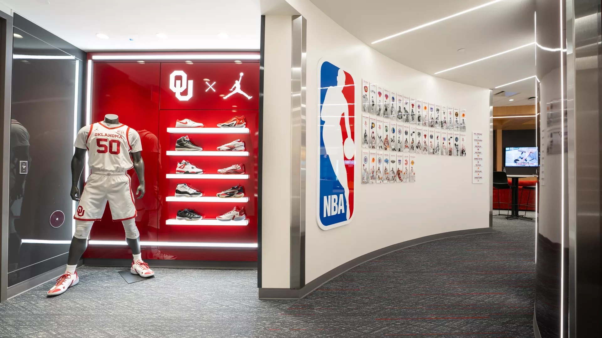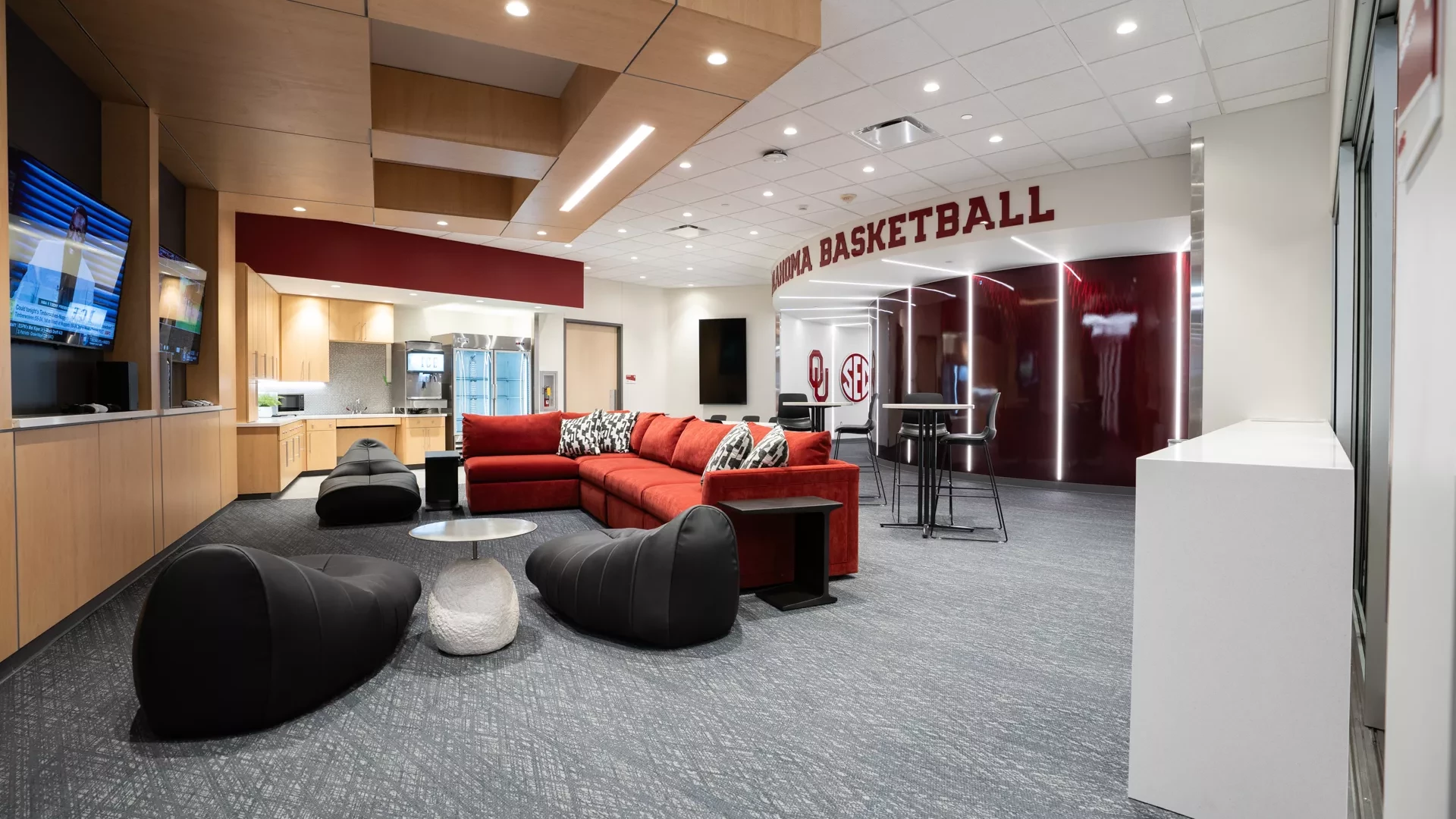 Both programs feature custom Jordan shoe displays and a players’ tunnel with dynamic lighting that leads directly to the court. Every detail was crafted to reflect the Sooners’ identity while balancing performance and comfort, creating an environment that supports player development, fosters team culture, and enhances recruiting impact.