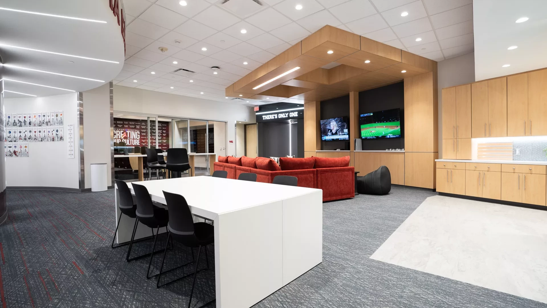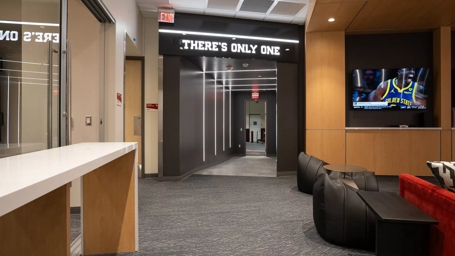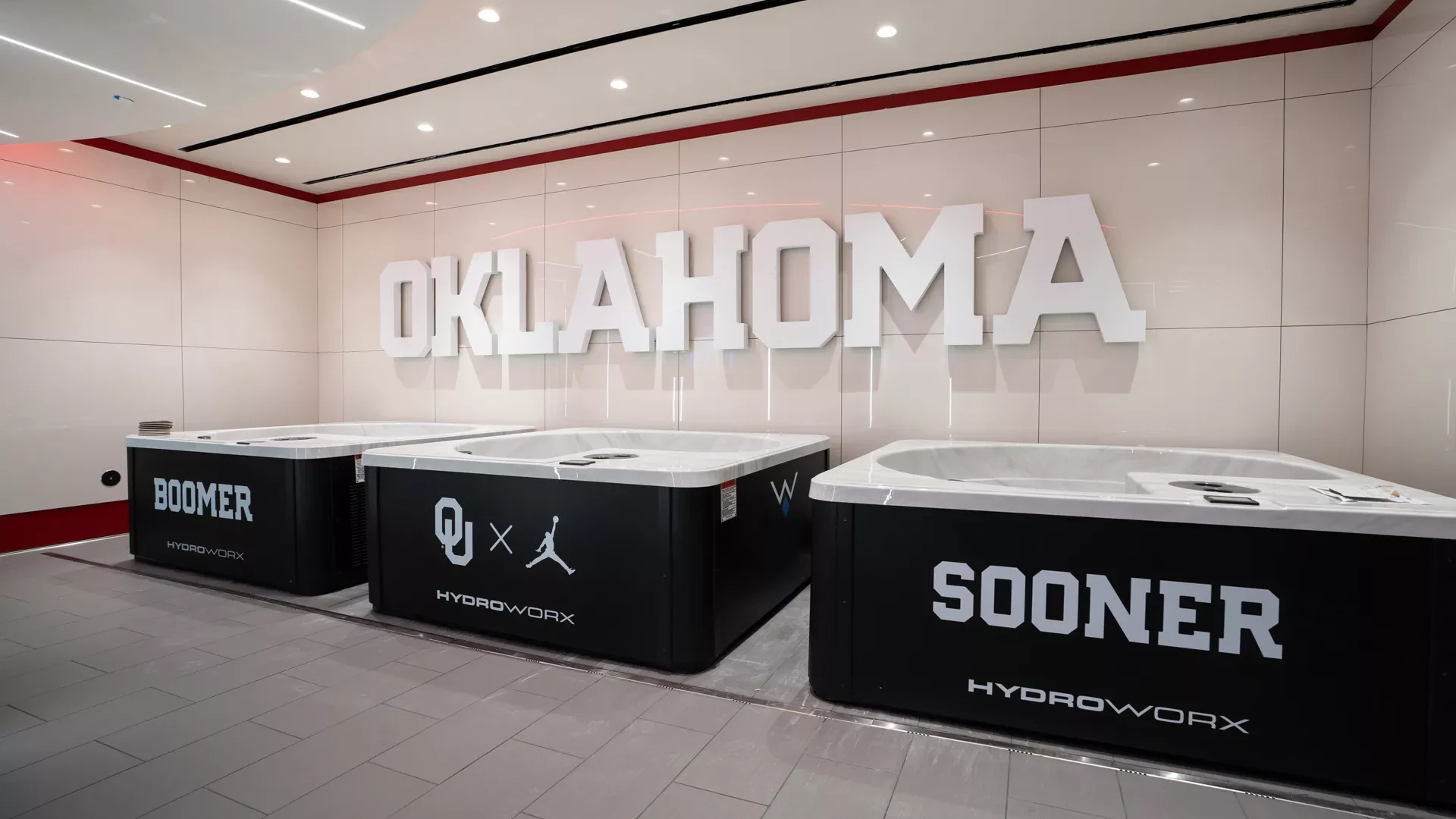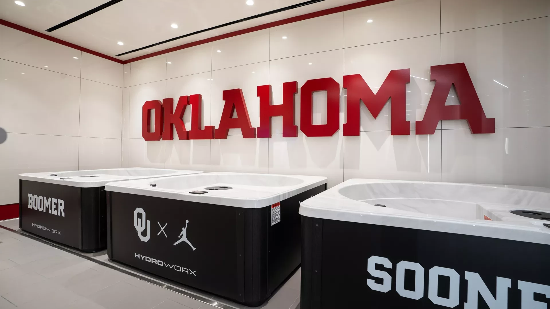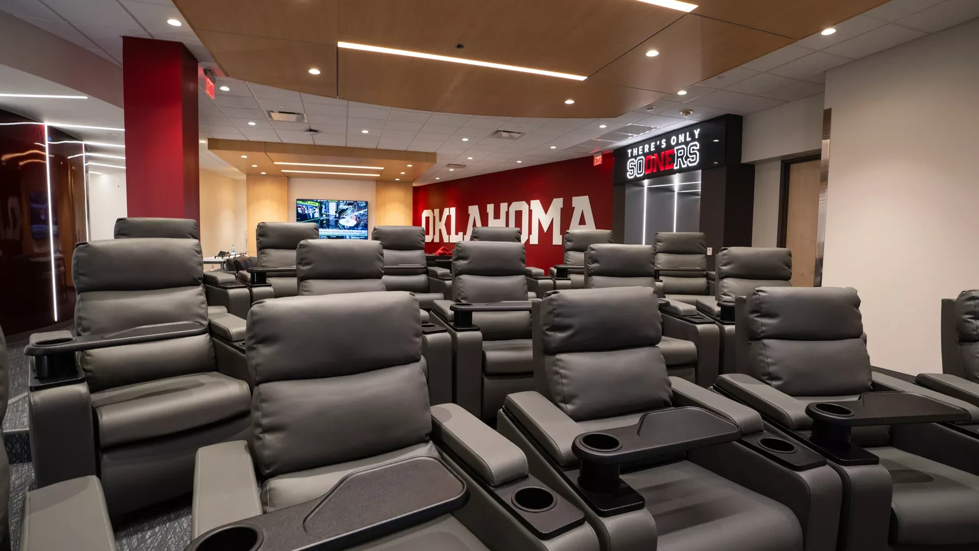 Both programs feature custom Jordan shoe displays and a players’ tunnel with dynamic lighting that leads directly to the court. Every detail was crafted to reflect the Sooners’ identity while balancing performance and comfort, creating an environment that supports player development, fosters team culture, and enhances recruiting impact.