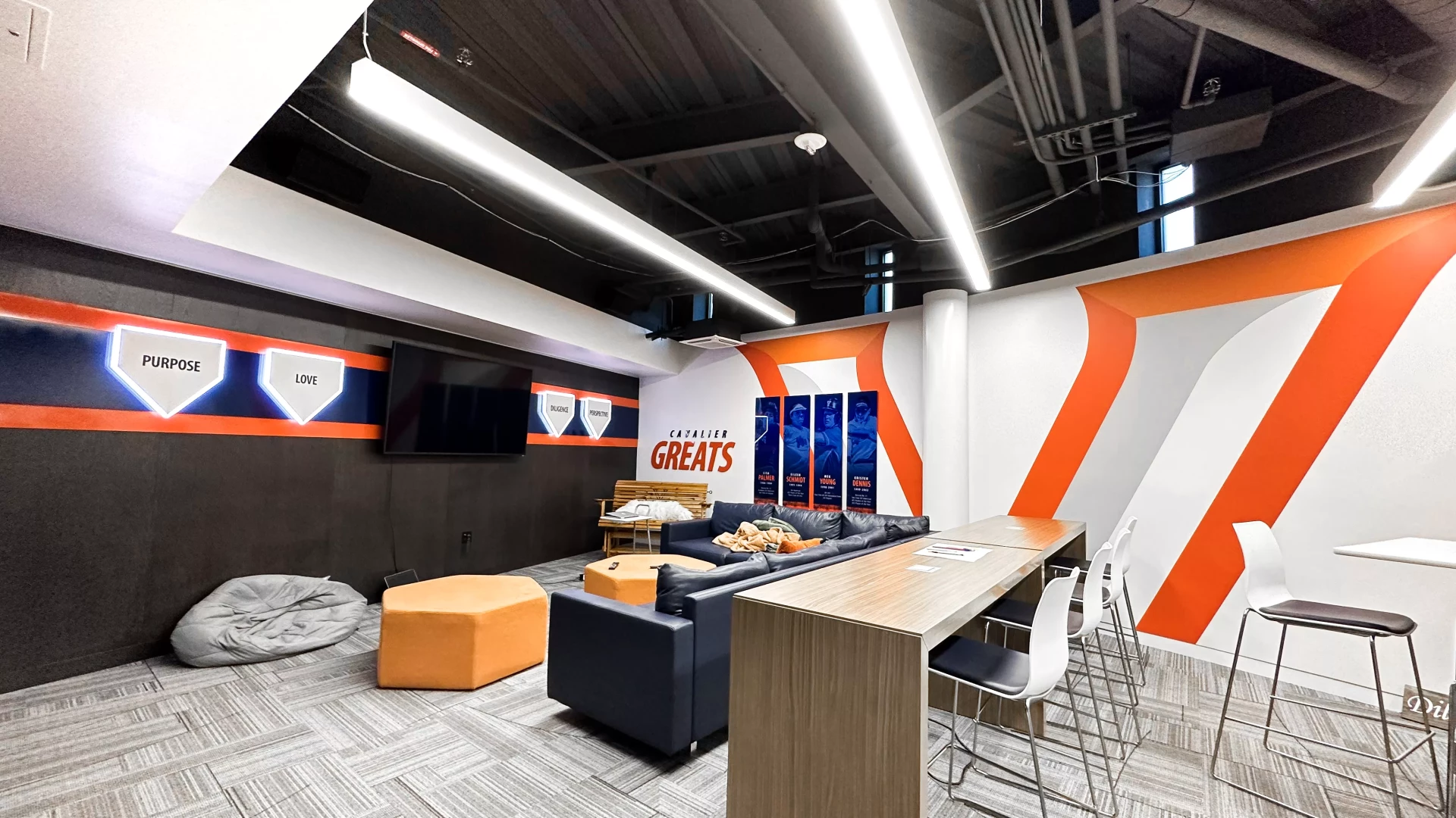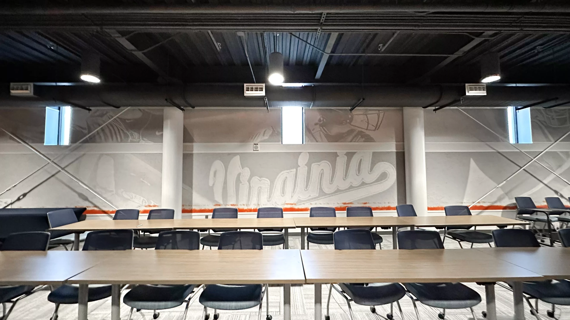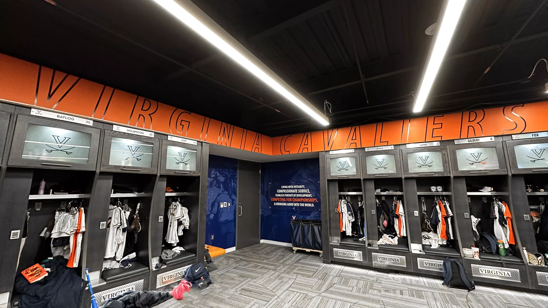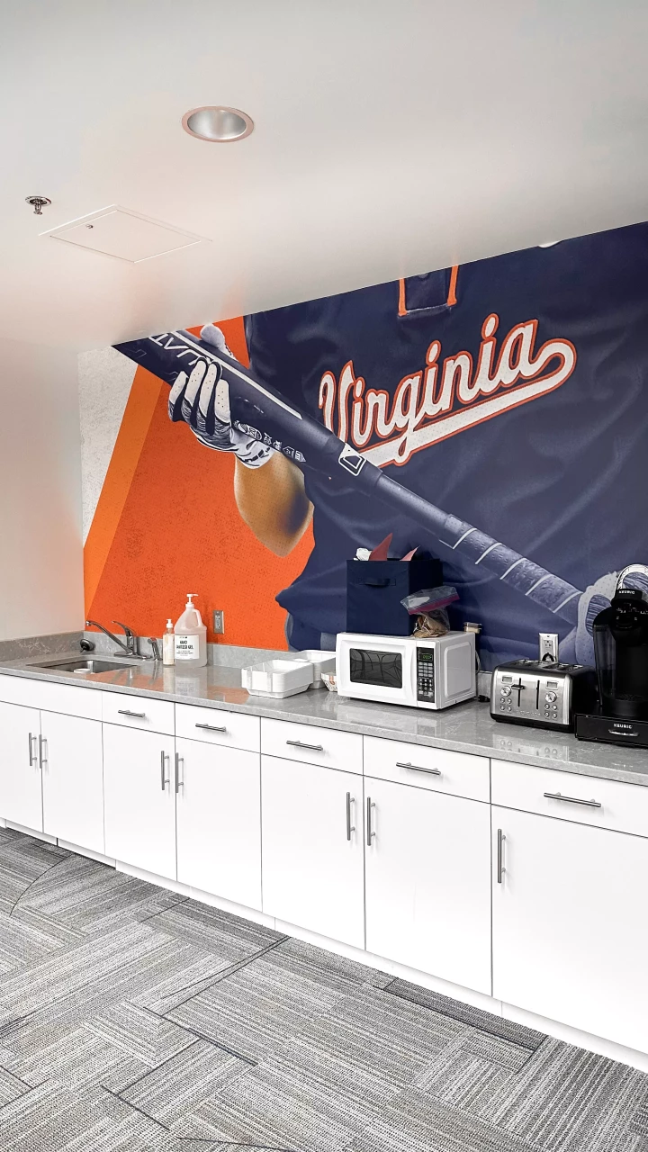 Virginia Softball renovated their indoor team spaces, adding large wall graphics and dynamic lighting throughout. Branding was done in a clean, white, modern aesthetic, while highlighting the UV orange and blue through the design elements.
