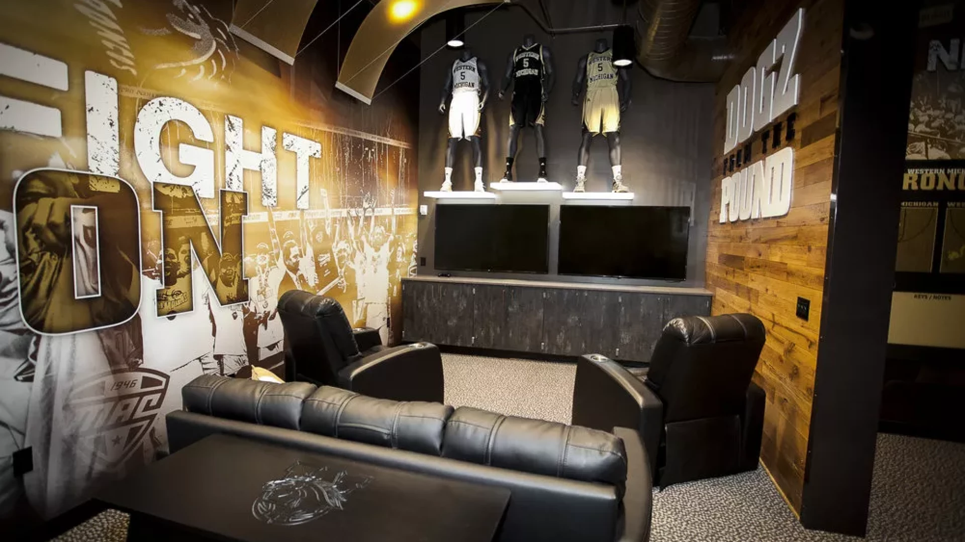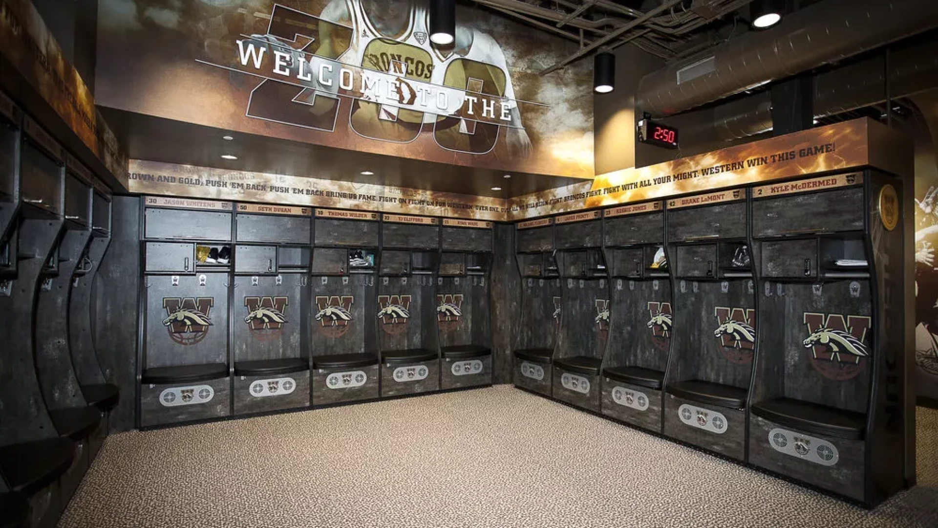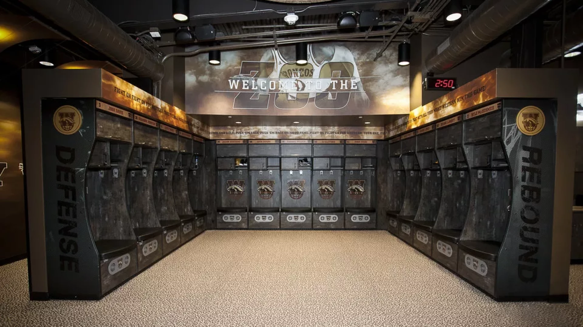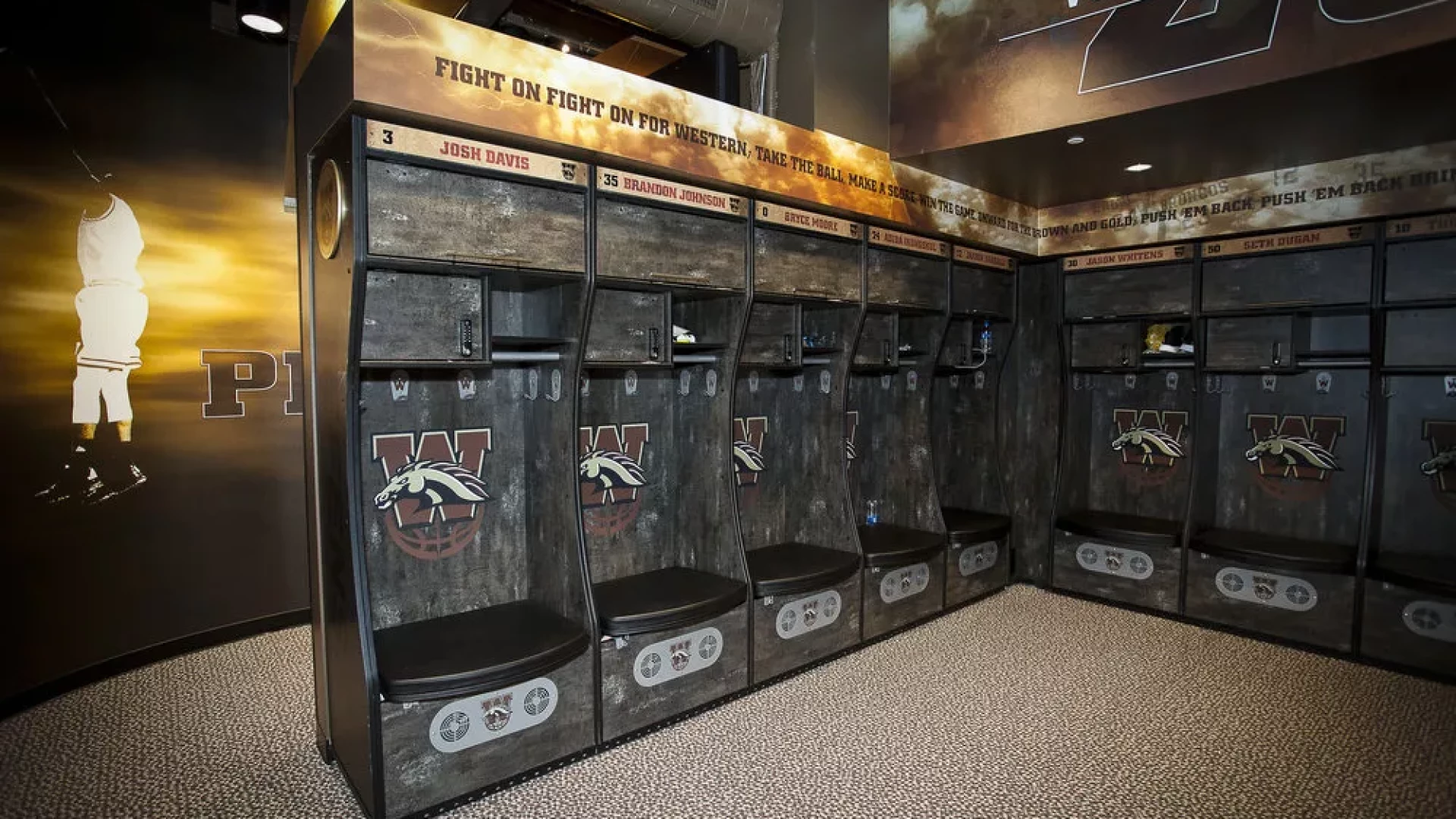 The Men's Basketball Locker Room and Lounge at Western Michigan's Read Fieldhouse underwent extensive renovations in 2017. The rustic/rugged design vision captures the Bronco Spirit, creating a truly unique environment. A custom WMU Basketball logo, featured throughout the space, brings the team together with a unified brand. New lockers, wall graphics, coaching technology, lighting, finishes and displays create a strong environment for players to not just get ready for games, but to also study, relax and watch film.
