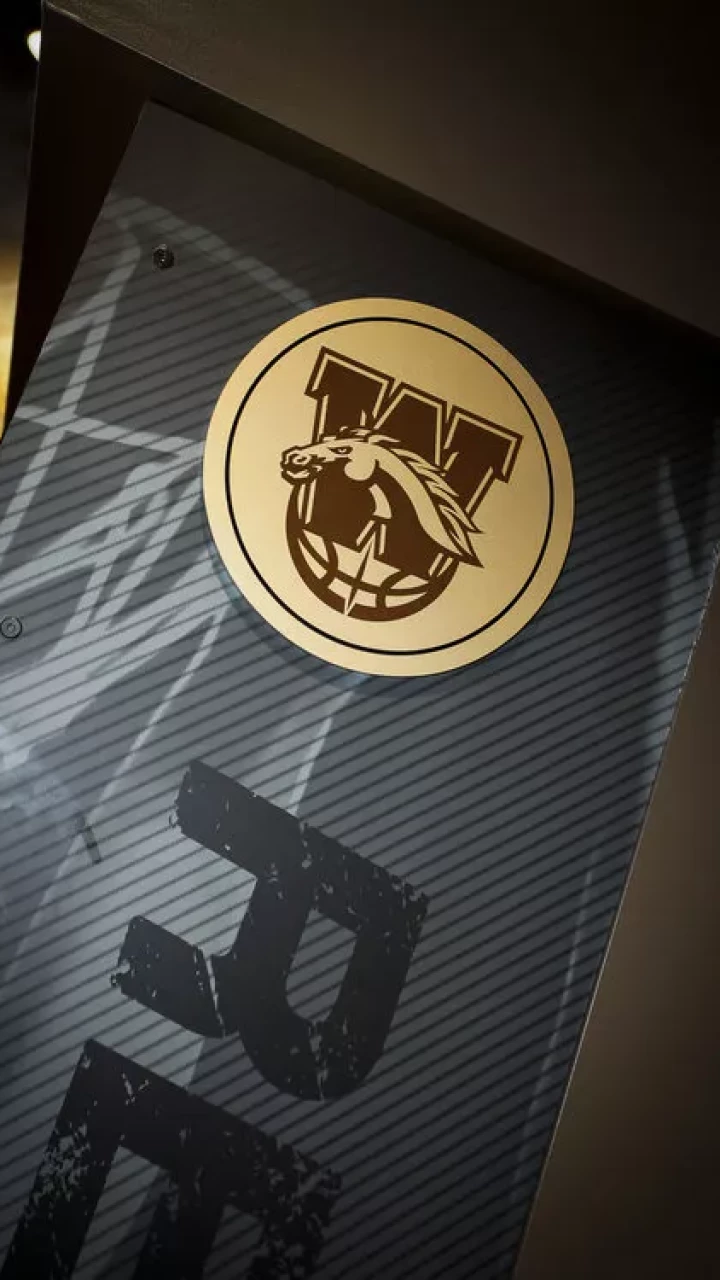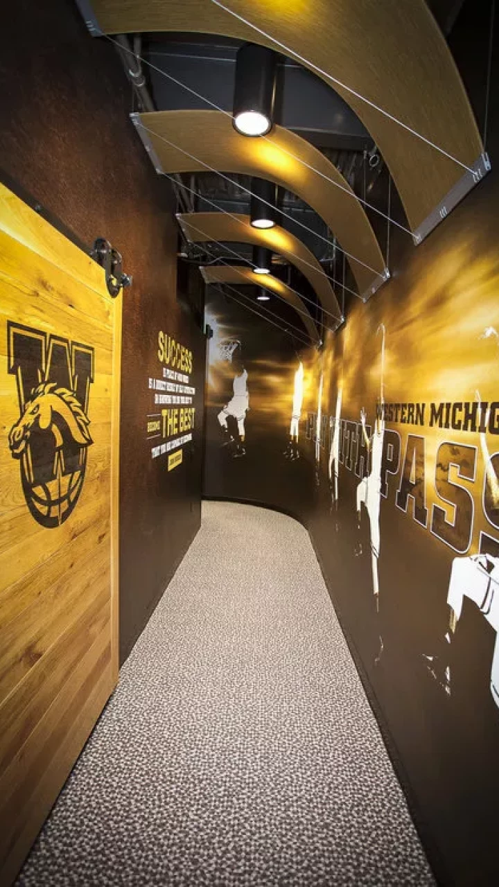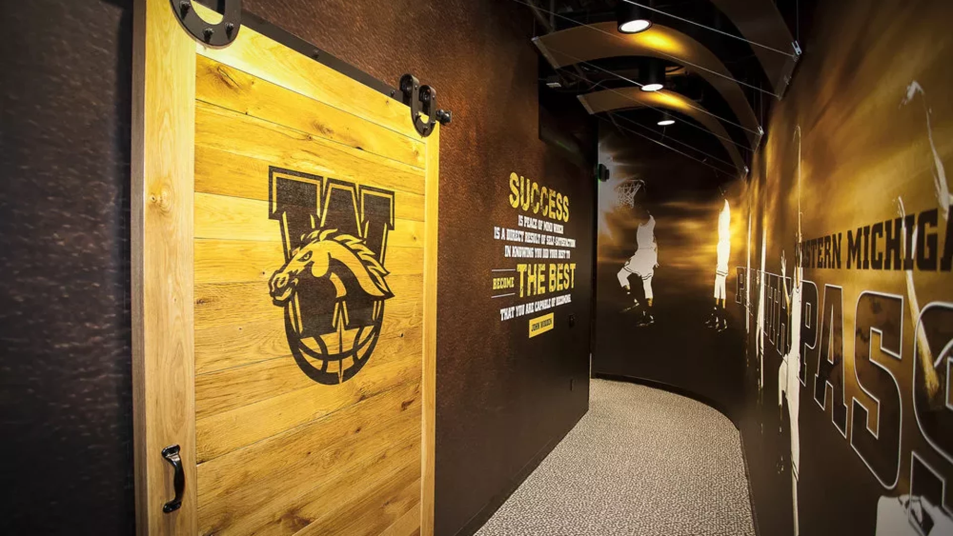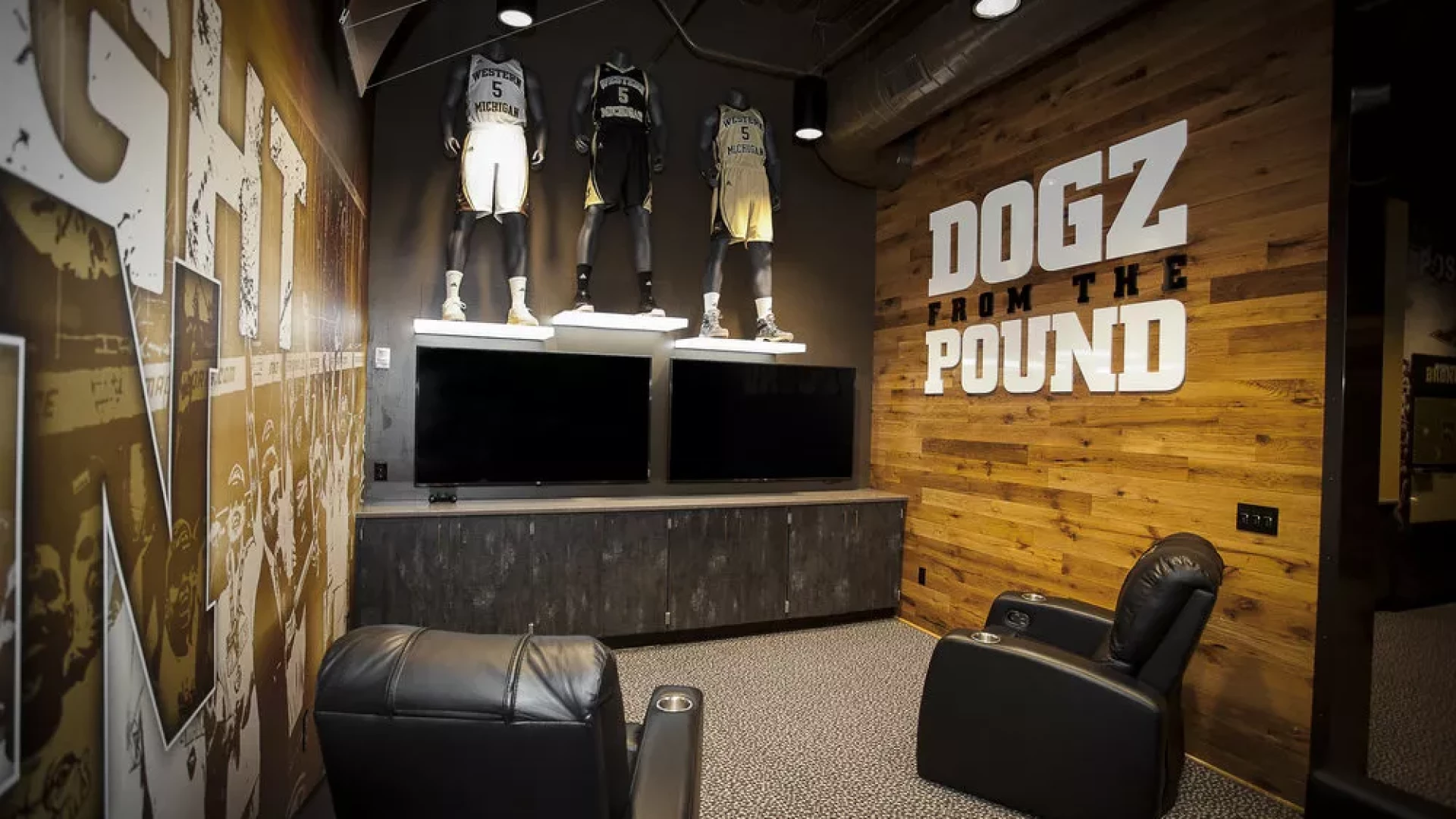 The Men's Basketball Locker Room and Lounge at Western Michigan's Read Fieldhouse underwent extensive renovations in 2017. The rustic/rugged design vision captures the Bronco Spirit, creating a truly unique environment. A custom WMU Basketball logo, featured throughout the space, brings the team together with a unified brand. New lockers, wall graphics, coaching technology, lighting, finishes and displays create a strong environment for players to not just get ready for games, but to also study, relax and watch film.